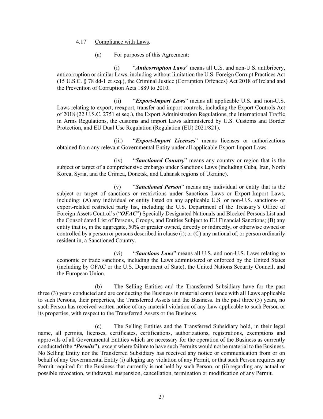 27 4.17 Compliance with Laws. (a) For purposes of this Agreement: (i) “Anticorruption Laws” means all U.S. and non-U.S. antibribery, anticorruption or similar Laws, including without limitation the U.S. Foreign Corrupt Practices Act (15 U.S.C. § 78 dd-1 et seq.), the Criminal Justice (Corruption Offences) Act 2018 of Ireland and the Prevention of Corruption Acts 1889 to 2010. (ii) “Export-Import Laws” means all applicable U.S. and non-U.S. Laws relating to export, reexport, transfer and import controls, including the Export Controls Act of 2018 (22 U.S.C. 2751 et seq.), the Export Administration Regulations, the International Traffic in Arms Regulations, the customs and import Laws administered by U.S. Customs and Border Protection, and EU Dual Use Regulation (Regulation (EU) 2021/821). (iii) “Export-Import Licenses” means licenses or authorizations obtained from any relevant Governmental Entity under all applicable Export-Import Laws. (iv) “Sanctioned Country” means any country or region that is the subject or target of a comprehensive embargo under Sanctions Laws (including Cuba, Iran, North Korea, Syria, and the Crimea, Donetsk, and Luhansk regions of Ukraine). (v) “Sanctioned Person” means any individual or entity that is the subject or target of sanctions or restrictions under Sanctions Laws or Export-Import Laws, including: (A) any individual or entity listed on any applicable U.S. or non-U.S. sanctions- or export-related restricted party list, including the U.S. Department of the Treasury’s Office of Foreign Assets Control’s (“OFAC”) Specially Designated Nationals and Blocked Persons List and the Consolidated List of Persons, Groups, and Entities Subject to EU Financial Sanctions; (B) any entity that is, in the aggregate, 50% or greater owned, directly or indirectly, or otherwise owned or controlled by a person or persons described in clause (i); or (C) any national of, or person ordinarily resident in, a Sanctioned Country. (vi) “Sanctions Laws” means all U.S. and non-U.S. Laws relating to economic or trade sanctions, including the Laws administered or enforced by the United States (including by OFAC or the U.S. Department of State), the United Nations Security Council, and the European Union. (b) The Selling Entities and the Transferred Subsidiary have for the past three (3) years conducted and are conducting the Business in material compliance with all Laws applicable to such Persons, their properties, the Transferred Assets and the Business. In the past three (3) years, no such Person has received written notice of any material violation of any Law applicable to such Person or its properties, with respect to the Transferred Assets or the Business. (c) The Selling Entities and the Transferred Subsidiary hold, in their legal name, all permits, licenses, certificates, certifications, authorizations, registrations, exemptions and approvals of all Governmental Entities which are necessary for the operation of the Business as currently conducted (the “Permits”), except where failure to have such Permits would not be material to the Business. No Selling Entity nor the Transferred Subsidiary has received any notice or communication from or on behalf of any Governmental Entity (i) alleging any violation of any Permit, or that such Person requires any Permit required for the Business that currently is not held by such Person, or (ii) regarding any actual or possible revocation, withdrawal, suspension, cancellation, termination or modification of any Permit.