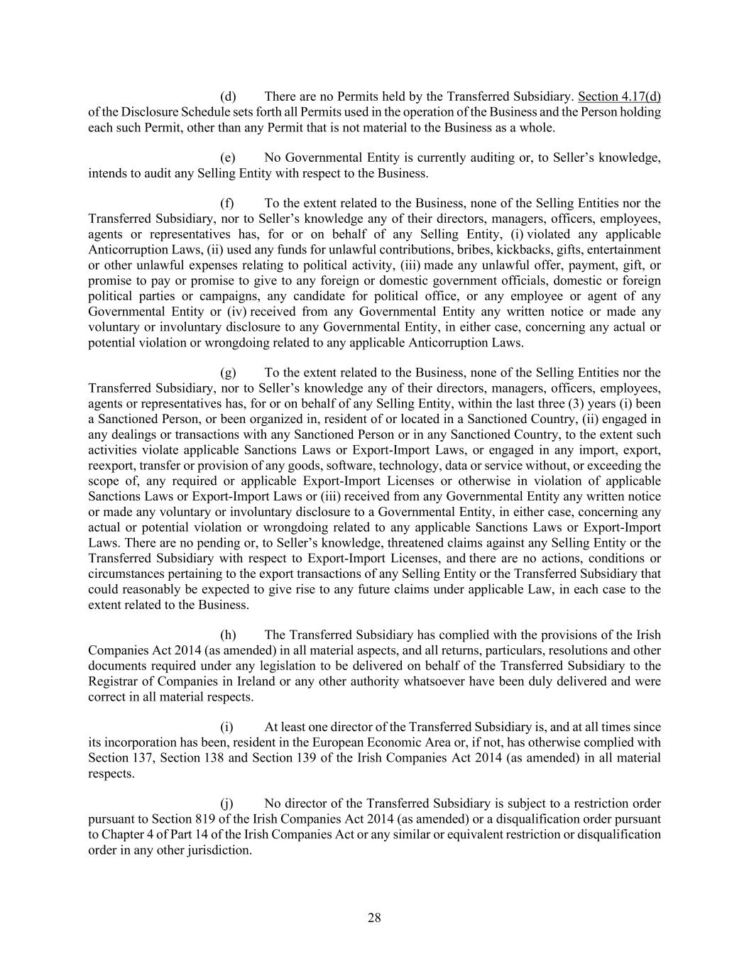 28 (d) There are no Permits held by the Transferred Subsidiary. Section 4.17(d) of the Disclosure Schedule sets forth all Permits used in the operation of the Business and the Person holding each such Permit, other than any Permit that is not material to the Business as a whole. (e) No Governmental Entity is currently auditing or, to Seller’s knowledge, intends to audit any Selling Entity with respect to the Business. (f) To the extent related to the Business, none of the Selling Entities nor the Transferred Subsidiary, nor to Seller’s knowledge any of their directors, managers, officers, employees, agents or representatives has, for or on behalf of any Selling Entity, (i) violated any applicable Anticorruption Laws, (ii) used any funds for unlawful contributions, bribes, kickbacks, gifts, entertainment or other unlawful expenses relating to political activity, (iii) made any unlawful offer, payment, gift, or promise to pay or promise to give to any foreign or domestic government officials, domestic or foreign political parties or campaigns, any candidate for political office, or any employee or agent of any Governmental Entity or (iv) received from any Governmental Entity any written notice or made any voluntary or involuntary disclosure to any Governmental Entity, in either case, concerning any actual or potential violation or wrongdoing related to any applicable Anticorruption Laws. (g) To the extent related to the Business, none of the Selling Entities nor the Transferred Subsidiary, nor to Seller’s knowledge any of their directors, managers, officers, employees, agents or representatives has, for or on behalf of any Selling Entity, within the last three (3) years (i) been a Sanctioned Person, or been organized in, resident of or located in a Sanctioned Country, (ii) engaged in any dealings or transactions with any Sanctioned Person or in any Sanctioned Country, to the extent such activities violate applicable Sanctions Laws or Export-Import Laws, or engaged in any import, export, reexport, transfer or provision of any goods, software, technology, data or service without, or exceeding the scope of, any required or applicable Export-Import Licenses or otherwise in violation of applicable Sanctions Laws or Export-Import Laws or (iii) received from any Governmental Entity any written notice or made any voluntary or involuntary disclosure to a Governmental Entity, in either case, concerning any actual or potential violation or wrongdoing related to any applicable Sanctions Laws or Export-Import Laws. There are no pending or, to Seller’s knowledge, threatened claims against any Selling Entity or the Transferred Subsidiary with respect to Export-Import Licenses, and there are no actions, conditions or circumstances pertaining to the export transactions of any Selling Entity or the Transferred Subsidiary that could reasonably be expected to give rise to any future claims under applicable Law, in each case to the extent related to the Business. (h) The Transferred Subsidiary has complied with the provisions of the Irish Companies Act 2014 (as amended) in all material aspects, and all returns, particulars, resolutions and other documents required under any legislation to be delivered on behalf of the Transferred Subsidiary to the Registrar of Companies in Ireland or any other authority whatsoever have been duly delivered and were correct in all material respects. (i) At least one director of the Transferred Subsidiary is, and at all times since its incorporation has been, resident in the European Economic Area or, if not, has otherwise complied with Section 137, Section 138 and Section 139 of the Irish Companies Act 2014 (as amended) in all material respects. (j) No director of the Transferred Subsidiary is subject to a restriction order pursuant to Section 819 of the Irish Companies Act 2014 (as amended) or a disqualification order pursuant to Chapter 4 of Part 14 of the Irish Companies Act or any similar or equivalent restriction or disqualification order in any other jurisdiction.
