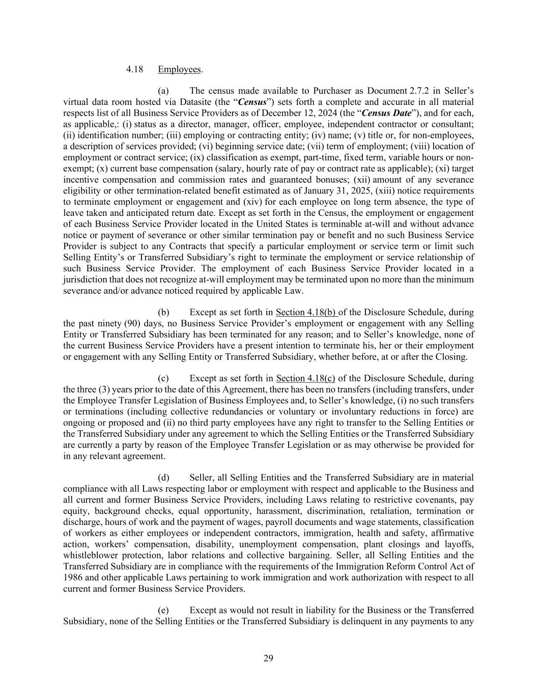 29 4.18 Employees. (a) The census made available to Purchaser as Document 2.7.2 in Seller’s virtual data room hosted via Datasite (the “Census”) sets forth a complete and accurate in all material respects list of all Business Service Providers as of December 12, 2024 (the “Census Date”), and for each, as applicable,: (i) status as a director, manager, officer, employee, independent contractor or consultant; (ii) identification number; (iii) employing or contracting entity; (iv) name; (v) title or, for non-employees, a description of services provided; (vi) beginning service date; (vii) term of employment; (viii) location of employment or contract service; (ix) classification as exempt, part-time, fixed term, variable hours or non- exempt; (x) current base compensation (salary, hourly rate of pay or contract rate as applicable); (xi) target incentive compensation and commission rates and guaranteed bonuses; (xii) amount of any severance eligibility or other termination-related benefit estimated as of January 31, 2025, (xiii) notice requirements to terminate employment or engagement and (xiv) for each employee on long term absence, the type of leave taken and anticipated return date. Except as set forth in the Census, the employment or engagement of each Business Service Provider located in the United States is terminable at-will and without advance notice or payment of severance or other similar termination pay or benefit and no such Business Service Provider is subject to any Contracts that specify a particular employment or service term or limit such Selling Entity’s or Transferred Subsidiary’s right to terminate the employment or service relationship of such Business Service Provider. The employment of each Business Service Provider located in a jurisdiction that does not recognize at-will employment may be terminated upon no more than the minimum severance and/or advance noticed required by applicable Law. (b) Except as set forth in Section 4.18(b) of the Disclosure Schedule, during the past ninety (90) days, no Business Service Provider’s employment or engagement with any Selling Entity or Transferred Subsidiary has been terminated for any reason; and to Seller’s knowledge, none of the current Business Service Providers have a present intention to terminate his, her or their employment or engagement with any Selling Entity or Transferred Subsidiary, whether before, at or after the Closing. (c) Except as set forth in Section 4.18(c) of the Disclosure Schedule, during the three (3) years prior to the date of this Agreement, there has been no transfers (including transfers, under the Employee Transfer Legislation of Business Employees and, to Seller’s knowledge, (i) no such transfers or terminations (including collective redundancies or voluntary or involuntary reductions in force) are ongoing or proposed and (ii) no third party employees have any right to transfer to the Selling Entities or the Transferred Subsidiary under any agreement to which the Selling Entities or the Transferred Subsidiary are currently a party by reason of the Employee Transfer Legislation or as may otherwise be provided for in any relevant agreement. (d) Seller, all Selling Entities and the Transferred Subsidiary are in material compliance with all Laws respecting labor or employment with respect and applicable to the Business and all current and former Business Service Providers, including Laws relating to restrictive covenants, pay equity, background checks, equal opportunity, harassment, discrimination, retaliation, termination or discharge, hours of work and the payment of wages, payroll documents and wage statements, classification of workers as either employees or independent contractors, immigration, health and safety, affirmative action, workers’ compensation, disability, unemployment compensation, plant closings and layoffs, whistleblower protection, labor relations and collective bargaining. Seller, all Selling Entities and the Transferred Subsidiary are in compliance with the requirements of the Immigration Reform Control Act of 1986 and other applicable Laws pertaining to work immigration and work authorization with respect to all current and former Business Service Providers. (e) Except as would not result in liability for the Business or the Transferred Subsidiary, none of the Selling Entities or the Transferred Subsidiary is delinquent in any payments to any