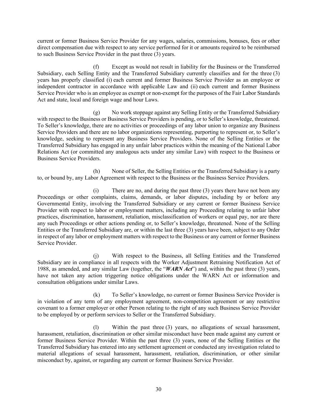 30 current or former Business Service Provider for any wages, salaries, commissions, bonuses, fees or other direct compensation due with respect to any service performed for it or amounts required to be reimbursed to such Business Service Provider in the past three (3) years. (f) Except as would not result in liability for the Business or the Transferred Subsidiary, each Selling Entity and the Transferred Subsidiary currently classifies and for the three (3) years has properly classified (i) each current and former Business Service Provider as an employee or independent contractor in accordance with applicable Law and (ii) each current and former Business Service Provider who is an employee as exempt or non-exempt for the purposes of the Fair Labor Standards Act and state, local and foreign wage and hour Laws. (g) No work stoppage against any Selling Entity or the Transferred Subsidiary with respect to the Business or Business Service Providers is pending, or to Seller’s knowledge, threatened. To Seller’s knowledge, there are no activities or proceedings of any labor union to organize any Business Service Providers and there are no labor organizations representing, purporting to represent or, to Seller’s knowledge, seeking to represent any Business Service Providers. None of the Selling Entities or the Transferred Subsidiary has engaged in any unfair labor practices within the meaning of the National Labor Relations Act (or committed any analogous acts under any similar Law) with respect to the Business or Business Service Providers. (h) None of Seller, the Selling Entities or the Transferred Subsidiary is a party to, or bound by, any Labor Agreement with respect to the Business or the Business Service Providers. (i) There are no, and during the past three (3) years there have not been any Proceedings or other complaints, claims, demands, or labor disputes, including by or before any Governmental Entity, involving the Transferred Subsidiary or any current or former Business Service Provider with respect to labor or employment matters, including any Proceeding relating to unfair labor practices, discrimination, harassment, retaliation, misclassification of workers or equal pay, nor are there any such Proceedings or other actions pending or, to Seller’s knowledge, threatened. None of the Selling Entities or the Transferred Subsidiary are, or within the last three (3) years have been, subject to any Order in respect of any labor or employment matters with respect to the Business or any current or former Business Service Provider. (j) With respect to the Business, all Selling Entities and the Transferred Subsidiary are in compliance in all respects with the Worker Adjustment Retraining Notification Act of 1988, as amended, and any similar Law (together, the “WARN Act”) and, within the past three (3) years, have not taken any action triggering notice obligations under the WARN Act or information and consultation obligations under similar Laws. (k) To Seller’s knowledge, no current or former Business Service Provider is in violation of any term of any employment agreement, non-competition agreement or any restrictive covenant to a former employer or other Person relating to the right of any such Business Service Provider to be employed by or perform services to Seller or the Transferred Subsidiary. (l) Within the past three (3) years, no allegations of sexual harassment, harassment, retaliation, discrimination or other similar misconduct have been made against any current or former Business Service Provider. Within the past three (3) years, none of the Selling Entities or the Transferred Subsidiary has entered into any settlement agreement or conducted any investigation related to material allegations of sexual harassment, harassment, retaliation, discrimination, or other similar misconduct by, against, or regarding any current or former Business Service Provider.