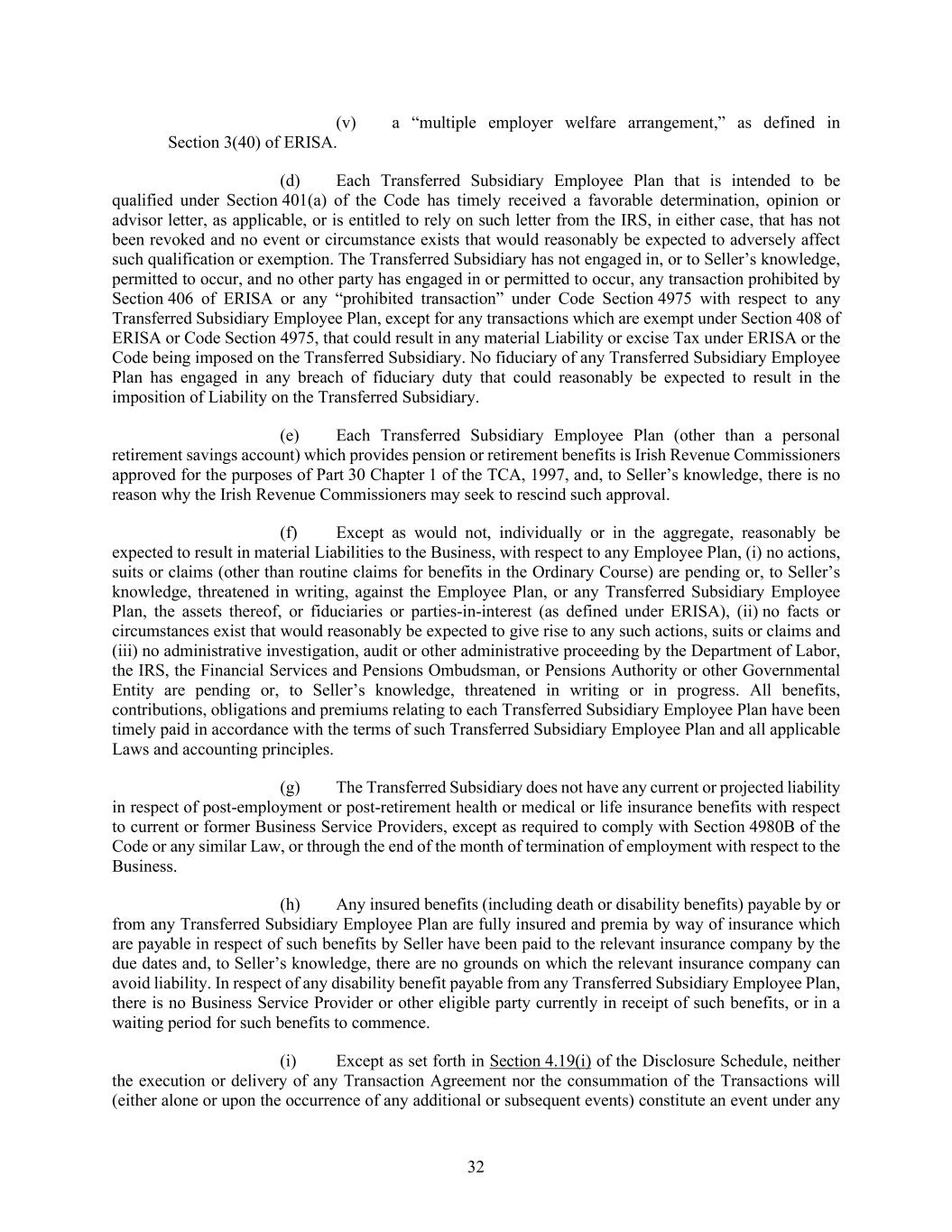32 (v) a “multiple employer welfare arrangement,” as defined in Section 3(40) of ERISA. (d) Each Transferred Subsidiary Employee Plan that is intended to be qualified under Section 401(a) of the Code has timely received a favorable determination, opinion or advisor letter, as applicable, or is entitled to rely on such letter from the IRS, in either case, that has not been revoked and no event or circumstance exists that would reasonably be expected to adversely affect such qualification or exemption. The Transferred Subsidiary has not engaged in, or to Seller’s knowledge, permitted to occur, and no other party has engaged in or permitted to occur, any transaction prohibited by Section 406 of ERISA or any “prohibited transaction” under Code Section 4975 with respect to any Transferred Subsidiary Employee Plan, except for any transactions which are exempt under Section 408 of ERISA or Code Section 4975, that could result in any material Liability or excise Tax under ERISA or the Code being imposed on the Transferred Subsidiary. No fiduciary of any Transferred Subsidiary Employee Plan has engaged in any breach of fiduciary duty that could reasonably be expected to result in the imposition of Liability on the Transferred Subsidiary. (e) Each Transferred Subsidiary Employee Plan (other than a personal retirement savings account) which provides pension or retirement benefits is Irish Revenue Commissioners approved for the purposes of Part 30 Chapter 1 of the TCA, 1997, and, to Seller’s knowledge, there is no reason why the Irish Revenue Commissioners may seek to rescind such approval. (f) Except as would not, individually or in the aggregate, reasonably be expected to result in material Liabilities to the Business, with respect to any Employee Plan, (i) no actions, suits or claims (other than routine claims for benefits in the Ordinary Course) are pending or, to Seller’s knowledge, threatened in writing, against the Employee Plan, or any Transferred Subsidiary Employee Plan, the assets thereof, or fiduciaries or parties-in-interest (as defined under ERISA), (ii) no facts or circumstances exist that would reasonably be expected to give rise to any such actions, suits or claims and (iii) no administrative investigation, audit or other administrative proceeding by the Department of Labor, the IRS, the Financial Services and Pensions Ombudsman, or Pensions Authority or other Governmental Entity are pending or, to Seller’s knowledge, threatened in writing or in progress. All benefits, contributions, obligations and premiums relating to each Transferred Subsidiary Employee Plan have been timely paid in accordance with the terms of such Transferred Subsidiary Employee Plan and all applicable Laws and accounting principles. (g) The Transferred Subsidiary does not have any current or projected liability in respect of post-employment or post-retirement health or medical or life insurance benefits with respect to current or former Business Service Providers, except as required to comply with Section 4980B of the Code or any similar Law, or through the end of the month of termination of employment with respect to the Business. (h) Any insured benefits (including death or disability benefits) payable by or from any Transferred Subsidiary Employee Plan are fully insured and premia by way of insurance which are payable in respect of such benefits by Seller have been paid to the relevant insurance company by the due dates and, to Seller’s knowledge, there are no grounds on which the relevant insurance company can avoid liability. In respect of any disability benefit payable from any Transferred Subsidiary Employee Plan, there is no Business Service Provider or other eligible party currently in receipt of such benefits, or in a waiting period for such benefits to commence. (i) Except as set forth in Section 4.19(i) of the Disclosure Schedule, neither the execution or delivery of any Transaction Agreement nor the consummation of the Transactions will (either alone or upon the occurrence of any additional or subsequent events) constitute an event under any