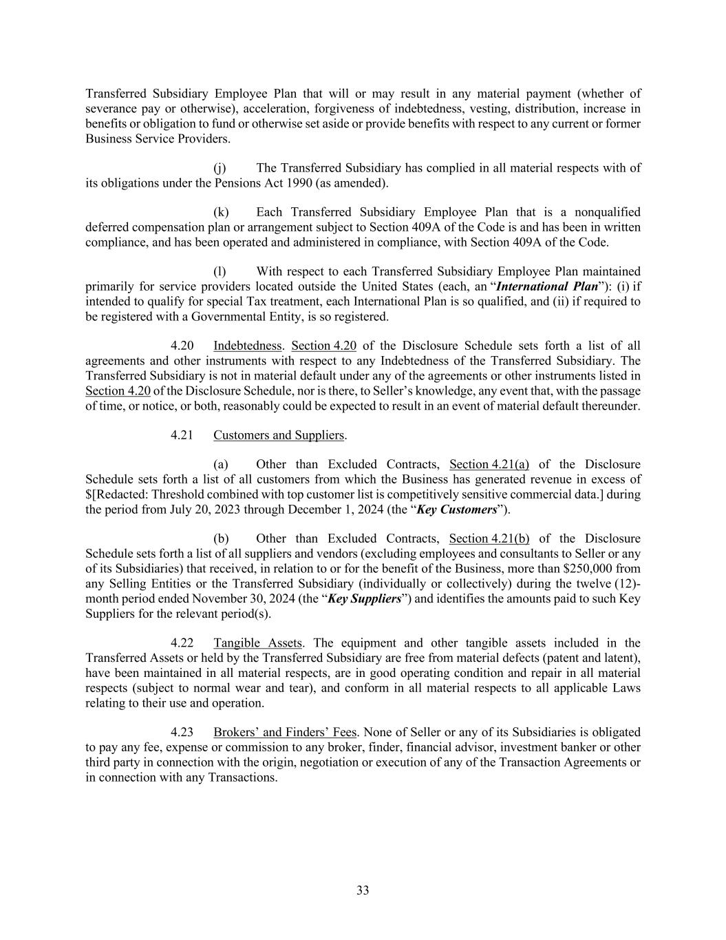 33 Transferred Subsidiary Employee Plan that will or may result in any material payment (whether of severance pay or otherwise), acceleration, forgiveness of indebtedness, vesting, distribution, increase in benefits or obligation to fund or otherwise set aside or provide benefits with respect to any current or former Business Service Providers. (j) The Transferred Subsidiary has complied in all material respects with of its obligations under the Pensions Act 1990 (as amended). (k) Each Transferred Subsidiary Employee Plan that is a nonqualified deferred compensation plan or arrangement subject to Section 409A of the Code is and has been in written compliance, and has been operated and administered in compliance, with Section 409A of the Code. (l) With respect to each Transferred Subsidiary Employee Plan maintained primarily for service providers located outside the United States (each, an “International Plan”): (i) if intended to qualify for special Tax treatment, each International Plan is so qualified, and (ii) if required to be registered with a Governmental Entity, is so registered. 4.20 Indebtedness. Section 4.20 of the Disclosure Schedule sets forth a list of all agreements and other instruments with respect to any Indebtedness of the Transferred Subsidiary. The Transferred Subsidiary is not in material default under any of the agreements or other instruments listed in Section 4.20 of the Disclosure Schedule, nor is there, to Seller’s knowledge, any event that, with the passage of time, or notice, or both, reasonably could be expected to result in an event of material default thereunder. 4.21 Customers and Suppliers. (a) Other than Excluded Contracts, Section 4.21(a) of the Disclosure Schedule sets forth a list of all customers from which the Business has generated revenue in excess of $[Redacted: Threshold combined with top customer list is competitively sensitive commercial data.] during the period from July 20, 2023 through December 1, 2024 (the “Key Customers”). (b) Other than Excluded Contracts, Section 4.21(b) of the Disclosure Schedule sets forth a list of all suppliers and vendors (excluding employees and consultants to Seller or any of its Subsidiaries) that received, in relation to or for the benefit of the Business, more than $250,000 from any Selling Entities or the Transferred Subsidiary (individually or collectively) during the twelve (12)- month period ended November 30, 2024 (the “Key Suppliers”) and identifies the amounts paid to such Key Suppliers for the relevant period(s). 4.22 Tangible Assets. The equipment and other tangible assets included in the Transferred Assets or held by the Transferred Subsidiary are free from material defects (patent and latent), have been maintained in all material respects, are in good operating condition and repair in all material respects (subject to normal wear and tear), and conform in all material respects to all applicable Laws relating to their use and operation. 4.23 Brokers’ and Finders’ Fees. None of Seller or any of its Subsidiaries is obligated to pay any fee, expense or commission to any broker, finder, financial advisor, investment banker or other third party in connection with the origin, negotiation or execution of any of the Transaction Agreements or in connection with any Transactions.