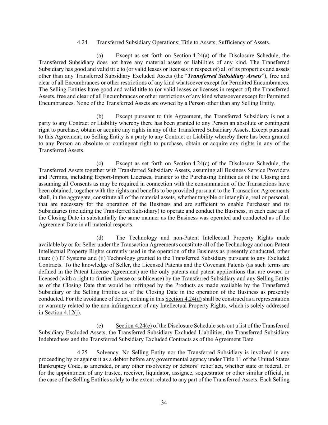 34 4.24 Transferred Subsidiary Operations; Title to Assets; Sufficiency of Assets. (a) Except as set forth on Section 4.24(a) of the Disclosure Schedule, the Transferred Subsidiary does not have any material assets or liabilities of any kind. The Transferred Subsidiary has good and valid title to (or valid leases or licenses in respect of) all of its properties and assets other than any Transferred Subsidiary Excluded Assets (the “Transferred Subsidiary Assets”), free and clear of all Encumbrances or other restrictions of any kind whatsoever except for Permitted Encumbrances. The Selling Entities have good and valid title to (or valid leases or licenses in respect of) the Transferred Assets, free and clear of all Encumbrances or other restrictions of any kind whatsoever except for Permitted Encumbrances. None of the Transferred Assets are owned by a Person other than any Selling Entity. (b) Except pursuant to this Agreement, the Transferred Subsidiary is not a party to any Contract or Liability whereby there has been granted to any Person an absolute or contingent right to purchase, obtain or acquire any rights in any of the Transferred Subsidiary Assets. Except pursuant to this Agreement, no Selling Entity is a party to any Contract or Liability whereby there has been granted to any Person an absolute or contingent right to purchase, obtain or acquire any rights in any of the Transferred Assets. (c) Except as set forth on Section 4.24(c) of the Disclosure Schedule, the Transferred Assets together with Transferred Subsidiary Assets, assuming all Business Service Providers and Permits, including Export-Import Licenses, transfer to the Purchasing Entities as of the Closing and assuming all Consents as may be required in connection with the consummation of the Transactions have been obtained, together with the rights and benefits to be provided pursuant to the Transaction Agreements shall, in the aggregate, constitute all of the material assets, whether tangible or intangible, real or personal, that are necessary for the operation of the Business and are sufficient to enable Purchaser and its Subsidiaries (including the Transferred Subsidiary) to operate and conduct the Business, in each case as of the Closing Date in substantially the same manner as the Business was operated and conducted as of the Agreement Date in all material respects. (d) The Technology and non-Patent Intellectual Property Rights made available by or for Seller under the Transaction Agreements constitute all of the Technology and non-Patent Intellectual Property Rights currently used in the operation of the Business as presently conducted, other than: (i) IT Systems and (ii) Technology granted to the Transferred Subsidiary pursuant to any Excluded Contracts. To the knowledge of Seller, the Licensed Patents and the Covenant Patents (as such terms are defined in the Patent License Agreement) are the only patents and patent applications that are owned or licensed (with a right to further license or sublicense) by the Transferred Subsidiary and any Selling Entity as of the Closing Date that would be infringed by the Products as made available by the Transferred Subsidiary or the Selling Entities as of the Closing Date in the operation of the Business as presently conducted. For the avoidance of doubt, nothing in this Section 4.24(d) shall be construed as a representation or warranty related to the non-infringement of any Intellectual Property Rights, which is solely addressed in Section 4.12(j). (e) Section 4.24(e) of the Disclosure Schedule sets out a list of the Transferred Subsidiary Excluded Assets, the Transferred Subsidiary Excluded Liabilities, the Transferred Subsidiary Indebtedness and the Transferred Subsidiary Excluded Contracts as of the Agreement Date. 4.25 Solvency. No Selling Entity nor the Transferred Subsidiary is involved in any proceeding by or against it as a debtor before any governmental agency under Title 11 of the United States Bankruptcy Code, as amended, or any other insolvency or debtors’ relief act, whether state or federal, or for the appointment of any trustee, receiver, liquidator, assignee, sequestrator or other similar official, in the case of the Selling Entities solely to the extent related to any part of the Transferred Assets. Each Selling