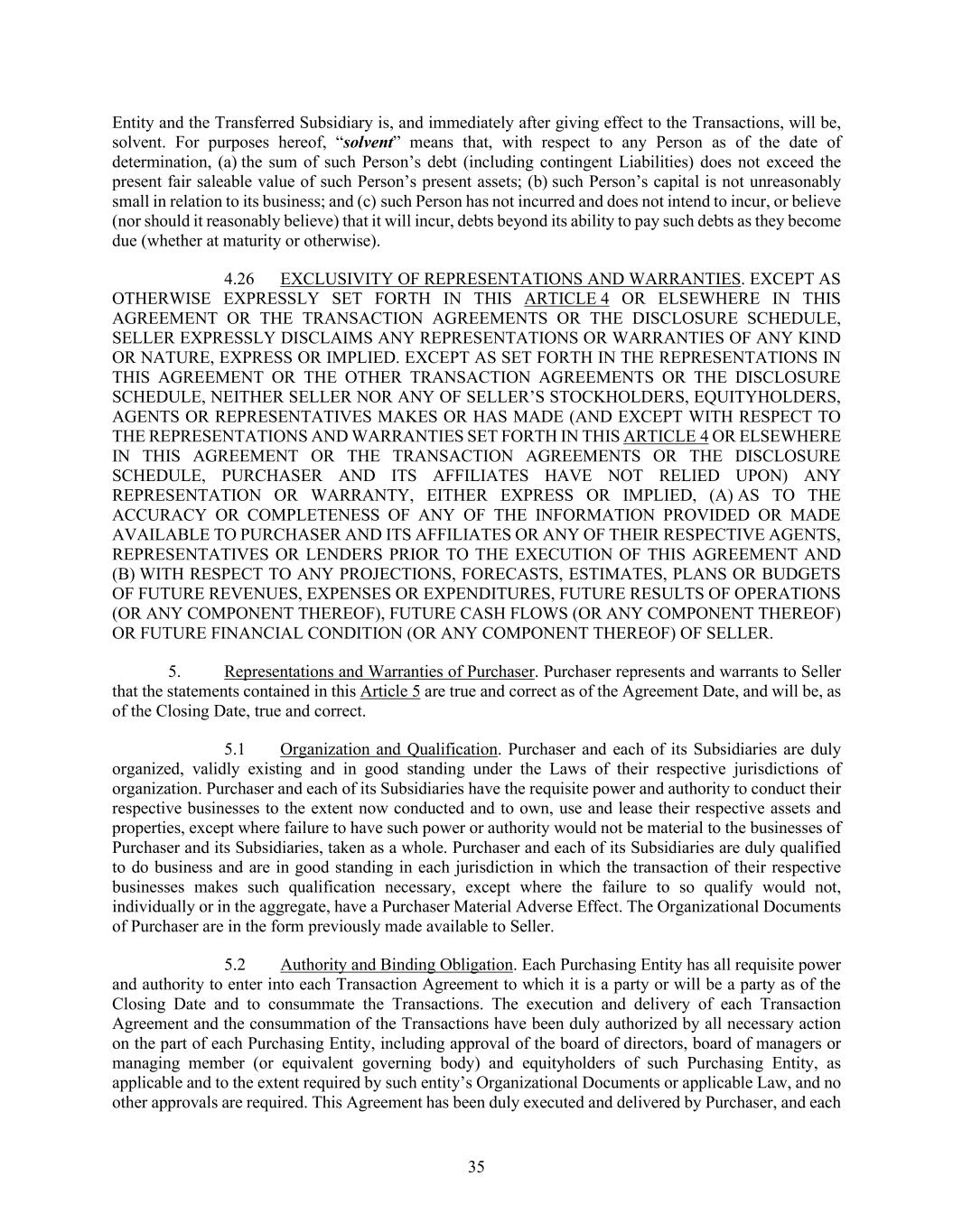 35 Entity and the Transferred Subsidiary is, and immediately after giving effect to the Transactions, will be, solvent. For purposes hereof, “solvent” means that, with respect to any Person as of the date of determination, (a) the sum of such Person’s debt (including contingent Liabilities) does not exceed the present fair saleable value of such Person’s present assets; (b) such Person’s capital is not unreasonably small in relation to its business; and (c) such Person has not incurred and does not intend to incur, or believe (nor should it reasonably believe) that it will incur, debts beyond its ability to pay such debts as they become due (whether at maturity or otherwise). 4.26 EXCLUSIVITY OF REPRESENTATIONS AND WARRANTIES. EXCEPT AS OTHERWISE EXPRESSLY SET FORTH IN THIS ARTICLE 4 OR ELSEWHERE IN THIS AGREEMENT OR THE TRANSACTION AGREEMENTS OR THE DISCLOSURE SCHEDULE, SELLER EXPRESSLY DISCLAIMS ANY REPRESENTATIONS OR WARRANTIES OF ANY KIND OR NATURE, EXPRESS OR IMPLIED. EXCEPT AS SET FORTH IN THE REPRESENTATIONS IN THIS AGREEMENT OR THE OTHER TRANSACTION AGREEMENTS OR THE DISCLOSURE SCHEDULE, NEITHER SELLER NOR ANY OF SELLER’S STOCKHOLDERS, EQUITYHOLDERS, AGENTS OR REPRESENTATIVES MAKES OR HAS MADE (AND EXCEPT WITH RESPECT TO THE REPRESENTATIONS AND WARRANTIES SET FORTH IN THIS ARTICLE 4 OR ELSEWHERE IN THIS AGREEMENT OR THE TRANSACTION AGREEMENTS OR THE DISCLOSURE SCHEDULE, PURCHASER AND ITS AFFILIATES HAVE NOT RELIED UPON) ANY REPRESENTATION OR WARRANTY, EITHER EXPRESS OR IMPLIED, (A) AS TO THE ACCURACY OR COMPLETENESS OF ANY OF THE INFORMATION PROVIDED OR MADE AVAILABLE TO PURCHASER AND ITS AFFILIATES OR ANY OF THEIR RESPECTIVE AGENTS, REPRESENTATIVES OR LENDERS PRIOR TO THE EXECUTION OF THIS AGREEMENT AND (B) WITH RESPECT TO ANY PROJECTIONS, FORECASTS, ESTIMATES, PLANS OR BUDGETS OF FUTURE REVENUES, EXPENSES OR EXPENDITURES, FUTURE RESULTS OF OPERATIONS (OR ANY COMPONENT THEREOF), FUTURE CASH FLOWS (OR ANY COMPONENT THEREOF) OR FUTURE FINANCIAL CONDITION (OR ANY COMPONENT THEREOF) OF SELLER. 5. Representations and Warranties of Purchaser. Purchaser represents and warrants to Seller that the statements contained in this Article 5 are true and correct as of the Agreement Date, and will be, as of the Closing Date, true and correct. 5.1 Organization and Qualification. Purchaser and each of its Subsidiaries are duly organized, validly existing and in good standing under the Laws of their respective jurisdictions of organization. Purchaser and each of its Subsidiaries have the requisite power and authority to conduct their respective businesses to the extent now conducted and to own, use and lease their respective assets and properties, except where failure to have such power or authority would not be material to the businesses of Purchaser and its Subsidiaries, taken as a whole. Purchaser and each of its Subsidiaries are duly qualified to do business and are in good standing in each jurisdiction in which the transaction of their respective businesses makes such qualification necessary, except where the failure to so qualify would not, individually or in the aggregate, have a Purchaser Material Adverse Effect. The Organizational Documents of Purchaser are in the form previously made available to Seller. 5.2 Authority and Binding Obligation. Each Purchasing Entity has all requisite power and authority to enter into each Transaction Agreement to which it is a party or will be a party as of the Closing Date and to consummate the Transactions. The execution and delivery of each Transaction Agreement and the consummation of the Transactions have been duly authorized by all necessary action on the part of each Purchasing Entity, including approval of the board of directors, board of managers or managing member (or equivalent governing body) and equityholders of such Purchasing Entity, as applicable and to the extent required by such entity’s Organizational Documents or applicable Law, and no other approvals are required. This Agreement has been duly executed and delivered by Purchaser, and each