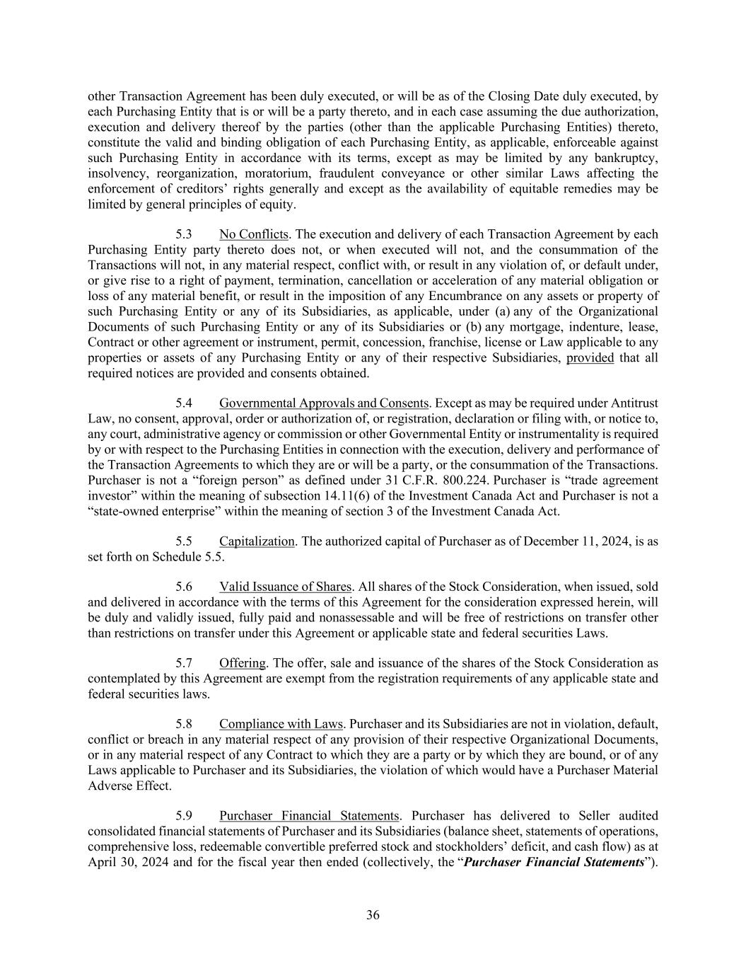36 other Transaction Agreement has been duly executed, or will be as of the Closing Date duly executed, by each Purchasing Entity that is or will be a party thereto, and in each case assuming the due authorization, execution and delivery thereof by the parties (other than the applicable Purchasing Entities) thereto, constitute the valid and binding obligation of each Purchasing Entity, as applicable, enforceable against such Purchasing Entity in accordance with its terms, except as may be limited by any bankruptcy, insolvency, reorganization, moratorium, fraudulent conveyance or other similar Laws affecting the enforcement of creditors’ rights generally and except as the availability of equitable remedies may be limited by general principles of equity. 5.3 No Conflicts. The execution and delivery of each Transaction Agreement by each Purchasing Entity party thereto does not, or when executed will not, and the consummation of the Transactions will not, in any material respect, conflict with, or result in any violation of, or default under, or give rise to a right of payment, termination, cancellation or acceleration of any material obligation or loss of any material benefit, or result in the imposition of any Encumbrance on any assets or property of such Purchasing Entity or any of its Subsidiaries, as applicable, under (a) any of the Organizational Documents of such Purchasing Entity or any of its Subsidiaries or (b) any mortgage, indenture, lease, Contract or other agreement or instrument, permit, concession, franchise, license or Law applicable to any properties or assets of any Purchasing Entity or any of their respective Subsidiaries, provided that all required notices are provided and consents obtained. 5.4 Governmental Approvals and Consents. Except as may be required under Antitrust Law, no consent, approval, order or authorization of, or registration, declaration or filing with, or notice to, any court, administrative agency or commission or other Governmental Entity or instrumentality is required by or with respect to the Purchasing Entities in connection with the execution, delivery and performance of the Transaction Agreements to which they are or will be a party, or the consummation of the Transactions. Purchaser is not a “foreign person” as defined under 31 C.F.R. 800.224. Purchaser is “trade agreement investor” within the meaning of subsection 14.11(6) of the Investment Canada Act and Purchaser is not a “state-owned enterprise” within the meaning of section 3 of the Investment Canada Act. 5.5 Capitalization. The authorized capital of Purchaser as of December 11, 2024, is as set forth on Schedule 5.5. 5.6 Valid Issuance of Shares. All shares of the Stock Consideration, when issued, sold and delivered in accordance with the terms of this Agreement for the consideration expressed herein, will be duly and validly issued, fully paid and nonassessable and will be free of restrictions on transfer other than restrictions on transfer under this Agreement or applicable state and federal securities Laws. 5.7 Offering. The offer, sale and issuance of the shares of the Stock Consideration as contemplated by this Agreement are exempt from the registration requirements of any applicable state and federal securities laws. 5.8 Compliance with Laws. Purchaser and its Subsidiaries are not in violation, default, conflict or breach in any material respect of any provision of their respective Organizational Documents, or in any material respect of any Contract to which they are a party or by which they are bound, or of any Laws applicable to Purchaser and its Subsidiaries, the violation of which would have a Purchaser Material Adverse Effect. 5.9 Purchaser Financial Statements. Purchaser has delivered to Seller audited consolidated financial statements of Purchaser and its Subsidiaries (balance sheet, statements of operations, comprehensive loss, redeemable convertible preferred stock and stockholders’ deficit, and cash flow) as at April 30, 2024 and for the fiscal year then ended (collectively, the “Purchaser Financial Statements”).