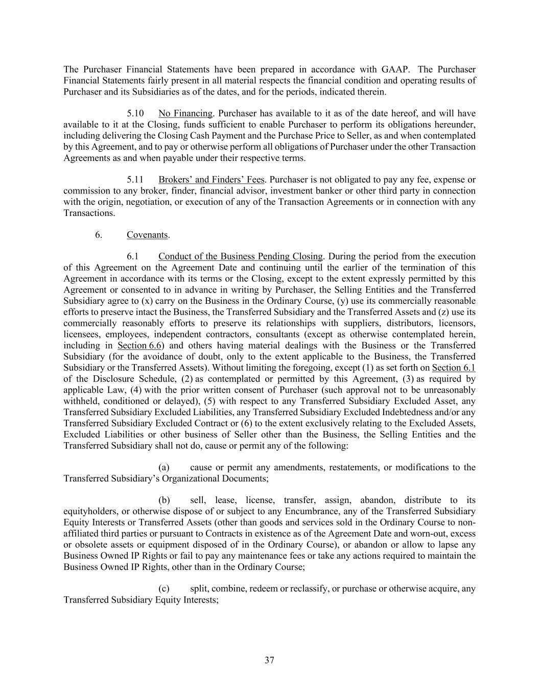 37 The Purchaser Financial Statements have been prepared in accordance with GAAP. The Purchaser Financial Statements fairly present in all material respects the financial condition and operating results of Purchaser and its Subsidiaries as of the dates, and for the periods, indicated therein. 5.10 No Financing. Purchaser has available to it as of the date hereof, and will have available to it at the Closing, funds sufficient to enable Purchaser to perform its obligations hereunder, including delivering the Closing Cash Payment and the Purchase Price to Seller, as and when contemplated by this Agreement, and to pay or otherwise perform all obligations of Purchaser under the other Transaction Agreements as and when payable under their respective terms. 5.11 Brokers’ and Finders’ Fees. Purchaser is not obligated to pay any fee, expense or commission to any broker, finder, financial advisor, investment banker or other third party in connection with the origin, negotiation, or execution of any of the Transaction Agreements or in connection with any Transactions. 6. Covenants. 6.1 Conduct of the Business Pending Closing. During the period from the execution of this Agreement on the Agreement Date and continuing until the earlier of the termination of this Agreement in accordance with its terms or the Closing, except to the extent expressly permitted by this Agreement or consented to in advance in writing by Purchaser, the Selling Entities and the Transferred Subsidiary agree to (x) carry on the Business in the Ordinary Course, (y) use its commercially reasonable efforts to preserve intact the Business, the Transferred Subsidiary and the Transferred Assets and (z) use its commercially reasonably efforts to preserve its relationships with suppliers, distributors, licensors, licensees, employees, independent contractors, consultants (except as otherwise contemplated herein, including in Section 6.6) and others having material dealings with the Business or the Transferred Subsidiary (for the avoidance of doubt, only to the extent applicable to the Business, the Transferred Subsidiary or the Transferred Assets). Without limiting the foregoing, except (1) as set forth on Section 6.1 of the Disclosure Schedule, (2) as contemplated or permitted by this Agreement, (3) as required by applicable Law, (4) with the prior written consent of Purchaser (such approval not to be unreasonably withheld, conditioned or delayed), (5) with respect to any Transferred Subsidiary Excluded Asset, any Transferred Subsidiary Excluded Liabilities, any Transferred Subsidiary Excluded Indebtedness and/or any Transferred Subsidiary Excluded Contract or (6) to the extent exclusively relating to the Excluded Assets, Excluded Liabilities or other business of Seller other than the Business, the Selling Entities and the Transferred Subsidiary shall not do, cause or permit any of the following: (a) cause or permit any amendments, restatements, or modifications to the Transferred Subsidiary’s Organizational Documents; (b) sell, lease, license, transfer, assign, abandon, distribute to its equityholders, or otherwise dispose of or subject to any Encumbrance, any of the Transferred Subsidiary Equity Interests or Transferred Assets (other than goods and services sold in the Ordinary Course to non- affiliated third parties or pursuant to Contracts in existence as of the Agreement Date and worn-out, excess or obsolete assets or equipment disposed of in the Ordinary Course), or abandon or allow to lapse any Business Owned IP Rights or fail to pay any maintenance fees or take any actions required to maintain the Business Owned IP Rights, other than in the Ordinary Course; (c) split, combine, redeem or reclassify, or purchase or otherwise acquire, any Transferred Subsidiary Equity Interests;