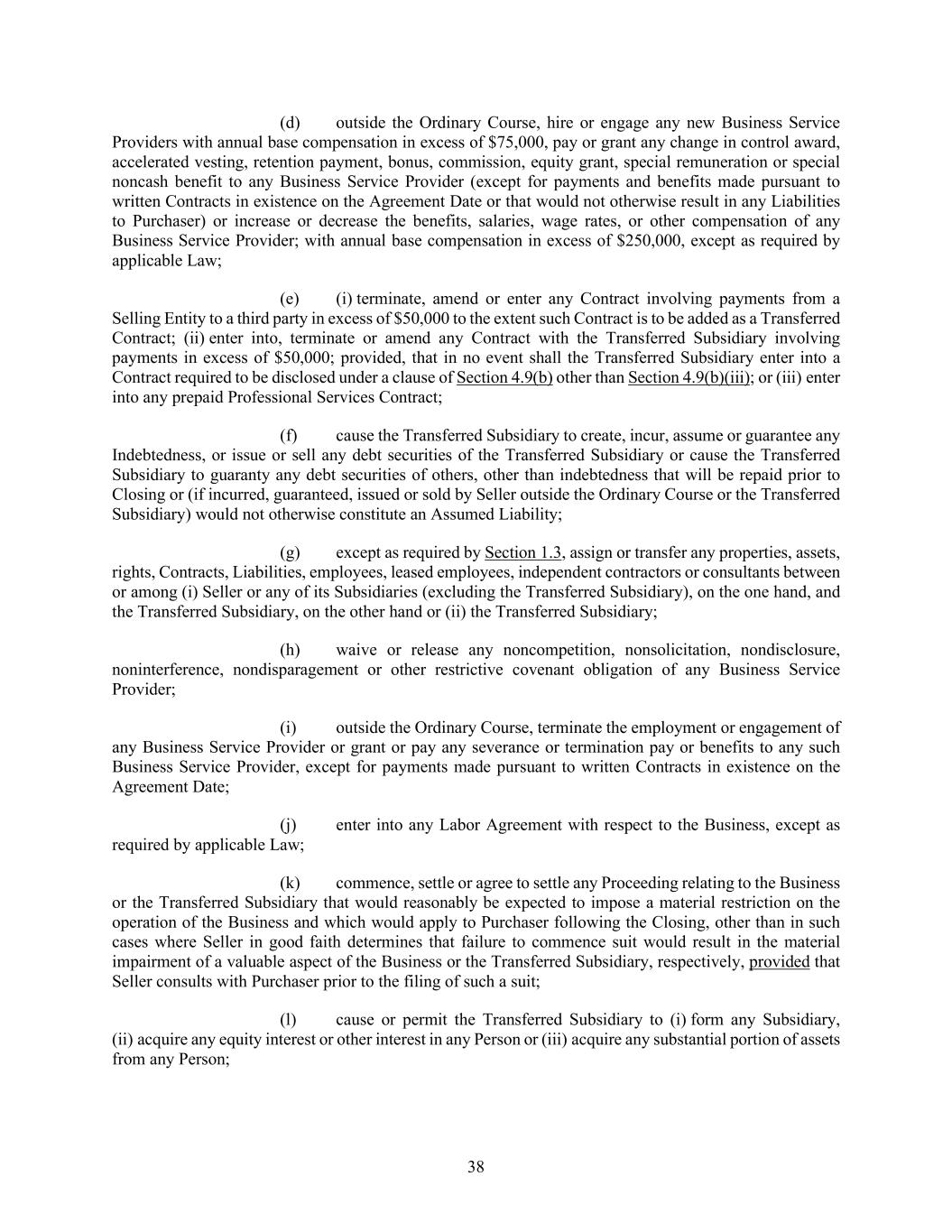 38 (d) outside the Ordinary Course, hire or engage any new Business Service Providers with annual base compensation in excess of $75,000, pay or grant any change in control award, accelerated vesting, retention payment, bonus, commission, equity grant, special remuneration or special noncash benefit to any Business Service Provider (except for payments and benefits made pursuant to written Contracts in existence on the Agreement Date or that would not otherwise result in any Liabilities to Purchaser) or increase or decrease the benefits, salaries, wage rates, or other compensation of any Business Service Provider; with annual base compensation in excess of $250,000, except as required by applicable Law; (e) (i) terminate, amend or enter any Contract involving payments from a Selling Entity to a third party in excess of $50,000 to the extent such Contract is to be added as a Transferred Contract; (ii) enter into, terminate or amend any Contract with the Transferred Subsidiary involving payments in excess of $50,000; provided, that in no event shall the Transferred Subsidiary enter into a Contract required to be disclosed under a clause of Section 4.9(b) other than Section 4.9(b)(iii); or (iii) enter into any prepaid Professional Services Contract; (f) cause the Transferred Subsidiary to create, incur, assume or guarantee any Indebtedness, or issue or sell any debt securities of the Transferred Subsidiary or cause the Transferred Subsidiary to guaranty any debt securities of others, other than indebtedness that will be repaid prior to Closing or (if incurred, guaranteed, issued or sold by Seller outside the Ordinary Course or the Transferred Subsidiary) would not otherwise constitute an Assumed Liability; (g) except as required by Section 1.3, assign or transfer any properties, assets, rights, Contracts, Liabilities, employees, leased employees, independent contractors or consultants between or among (i) Seller or any of its Subsidiaries (excluding the Transferred Subsidiary), on the one hand, and the Transferred Subsidiary, on the other hand or (ii) the Transferred Subsidiary; (h) waive or release any noncompetition, nonsolicitation, nondisclosure, noninterference, nondisparagement or other restrictive covenant obligation of any Business Service Provider; (i) outside the Ordinary Course, terminate the employment or engagement of any Business Service Provider or grant or pay any severance or termination pay or benefits to any such Business Service Provider, except for payments made pursuant to written Contracts in existence on the Agreement Date; (j) enter into any Labor Agreement with respect to the Business, except as required by applicable Law; (k) commence, settle or agree to settle any Proceeding relating to the Business or the Transferred Subsidiary that would reasonably be expected to impose a material restriction on the operation of the Business and which would apply to Purchaser following the Closing, other than in such cases where Seller in good faith determines that failure to commence suit would result in the material impairment of a valuable aspect of the Business or the Transferred Subsidiary, respectively, provided that Seller consults with Purchaser prior to the filing of such a suit; (l) cause or permit the Transferred Subsidiary to (i) form any Subsidiary, (ii) acquire any equity interest or other interest in any Person or (iii) acquire any substantial portion of assets from any Person;