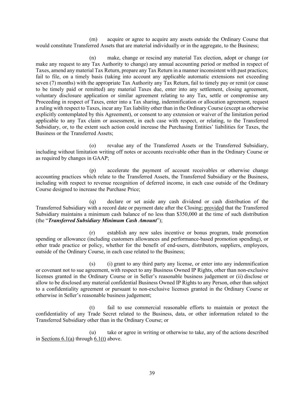 39 (m) acquire or agree to acquire any assets outside the Ordinary Course that would constitute Transferred Assets that are material individually or in the aggregate, to the Business; (n) make, change or rescind any material Tax election, adopt or change (or make any request to any Tax Authority to change) any annual accounting period or method in respect of Taxes, amend any material Tax Return, prepare any Tax Return in a manner inconsistent with past practices; fail to file, on a timely basis (taking into account any applicable automatic extensions not exceeding seven (7) months) with the appropriate Tax Authority any Tax Return, fail to timely pay or remit (or cause to be timely paid or remitted) any material Taxes due, enter into any settlement, closing agreement, voluntary disclosure application or similar agreement relating to any Tax, settle or compromise any Proceeding in respect of Taxes, enter into a Tax sharing, indemnification or allocation agreement, request a ruling with respect to Taxes, incur any Tax liability other than in the Ordinary Course (except as otherwise explicitly contemplated by this Agreement), or consent to any extension or waiver of the limitation period applicable to any Tax claim or assessment, in each case with respect, or relating, to the Transferred Subsidiary, or, to the extent such action could increase the Purchasing Entities’ liabilities for Taxes, the Business or the Transferred Assets; (o) revalue any of the Transferred Assets or the Transferred Subsidiary, including without limitation writing off notes or accounts receivable other than in the Ordinary Course or as required by changes in GAAP; (p) accelerate the payment of account receivables or otherwise change accounting practices which relate to the Transferred Assets, the Transferred Subsidiary or the Business, including with respect to revenue recognition of deferred income, in each case outside of the Ordinary Course designed to increase the Purchase Price; (q) declare or set aside any cash dividend or cash distribution of the Transferred Subsidiary with a record date or payment date after the Closing; provided that the Transferred Subsidiary maintains a minimum cash balance of no less than $350,000 at the time of such distribution (the “Transferred Subsidiary Minimum Cash Amount”); (r) establish any new sales incentive or bonus program, trade promotion spending or allowance (including customers allowances and performance-based promotion spending), or other trade practice or policy, whether for the benefit of end-users, distributors, suppliers, employees, outside of the Ordinary Course, in each case related to the Business; (s) (i) grant to any third party any license, or enter into any indemnification or covenant not to sue agreement, with respect to any Business Owned IP Rights, other than non-exclusive licenses granted in the Ordinary Course or in Seller’s reasonable business judgement or (ii) disclose or allow to be disclosed any material confidential Business Owned IP Rights to any Person, other than subject to a confidentiality agreement or pursuant to non-exclusive licenses granted in the Ordinary Course or otherwise in Seller’s reasonable business judgement; (t) fail to use commercial reasonable efforts to maintain or protect the confidentiality of any Trade Secret related to the Business, data, or other information related to the Transferred Subsidiary other than in the Ordinary Course; or (u) take or agree in writing or otherwise to take, any of the actions described in Sections 6.1(a) through 6.1(t) above.