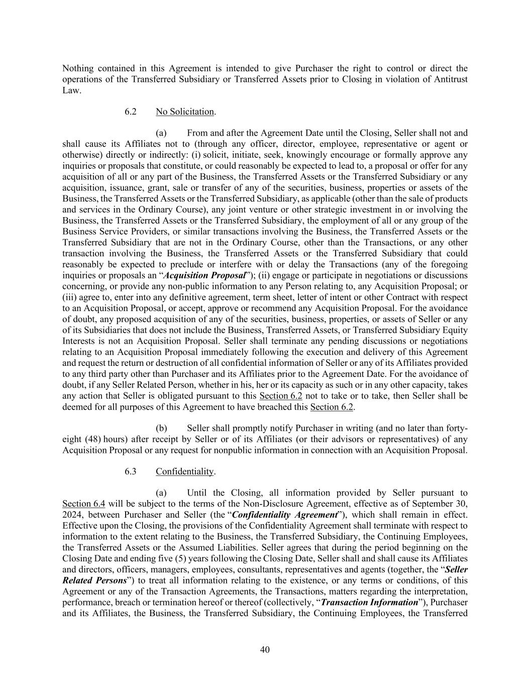 40 Nothing contained in this Agreement is intended to give Purchaser the right to control or direct the operations of the Transferred Subsidiary or Transferred Assets prior to Closing in violation of Antitrust Law. 6.2 No Solicitation. (a) From and after the Agreement Date until the Closing, Seller shall not and shall cause its Affiliates not to (through any officer, director, employee, representative or agent or otherwise) directly or indirectly: (i) solicit, initiate, seek, knowingly encourage or formally approve any inquiries or proposals that constitute, or could reasonably be expected to lead to, a proposal or offer for any acquisition of all or any part of the Business, the Transferred Assets or the Transferred Subsidiary or any acquisition, issuance, grant, sale or transfer of any of the securities, business, properties or assets of the Business, the Transferred Assets or the Transferred Subsidiary, as applicable (other than the sale of products and services in the Ordinary Course), any joint venture or other strategic investment in or involving the Business, the Transferred Assets or the Transferred Subsidiary, the employment of all or any group of the Business Service Providers, or similar transactions involving the Business, the Transferred Assets or the Transferred Subsidiary that are not in the Ordinary Course, other than the Transactions, or any other transaction involving the Business, the Transferred Assets or the Transferred Subsidiary that could reasonably be expected to preclude or interfere with or delay the Transactions (any of the foregoing inquiries or proposals an “Acquisition Proposal”); (ii) engage or participate in negotiations or discussions concerning, or provide any non-public information to any Person relating to, any Acquisition Proposal; or (iii) agree to, enter into any definitive agreement, term sheet, letter of intent or other Contract with respect to an Acquisition Proposal, or accept, approve or recommend any Acquisition Proposal. For the avoidance of doubt, any proposed acquisition of any of the securities, business, properties, or assets of Seller or any of its Subsidiaries that does not include the Business, Transferred Assets, or Transferred Subsidiary Equity Interests is not an Acquisition Proposal. Seller shall terminate any pending discussions or negotiations relating to an Acquisition Proposal immediately following the execution and delivery of this Agreement and request the return or destruction of all confidential information of Seller or any of its Affiliates provided to any third party other than Purchaser and its Affiliates prior to the Agreement Date. For the avoidance of doubt, if any Seller Related Person, whether in his, her or its capacity as such or in any other capacity, takes any action that Seller is obligated pursuant to this Section 6.2 not to take or to take, then Seller shall be deemed for all purposes of this Agreement to have breached this Section 6.2. (b) Seller shall promptly notify Purchaser in writing (and no later than forty- eight (48) hours) after receipt by Seller or of its Affiliates (or their advisors or representatives) of any Acquisition Proposal or any request for nonpublic information in connection with an Acquisition Proposal. 6.3 Confidentiality. (a) Until the Closing, all information provided by Seller pursuant to Section 6.4 will be subject to the terms of the Non-Disclosure Agreement, effective as of September 30, 2024, between Purchaser and Seller (the “Confidentiality Agreement”), which shall remain in effect. Effective upon the Closing, the provisions of the Confidentiality Agreement shall terminate with respect to information to the extent relating to the Business, the Transferred Subsidiary, the Continuing Employees, the Transferred Assets or the Assumed Liabilities. Seller agrees that during the period beginning on the Closing Date and ending five (5) years following the Closing Date, Seller shall and shall cause its Affiliates and directors, officers, managers, employees, consultants, representatives and agents (together, the “Seller Related Persons”) to treat all information relating to the existence, or any terms or conditions, of this Agreement or any of the Transaction Agreements, the Transactions, matters regarding the interpretation, performance, breach or termination hereof or thereof (collectively, “Transaction Information”), Purchaser and its Affiliates, the Business, the Transferred Subsidiary, the Continuing Employees, the Transferred