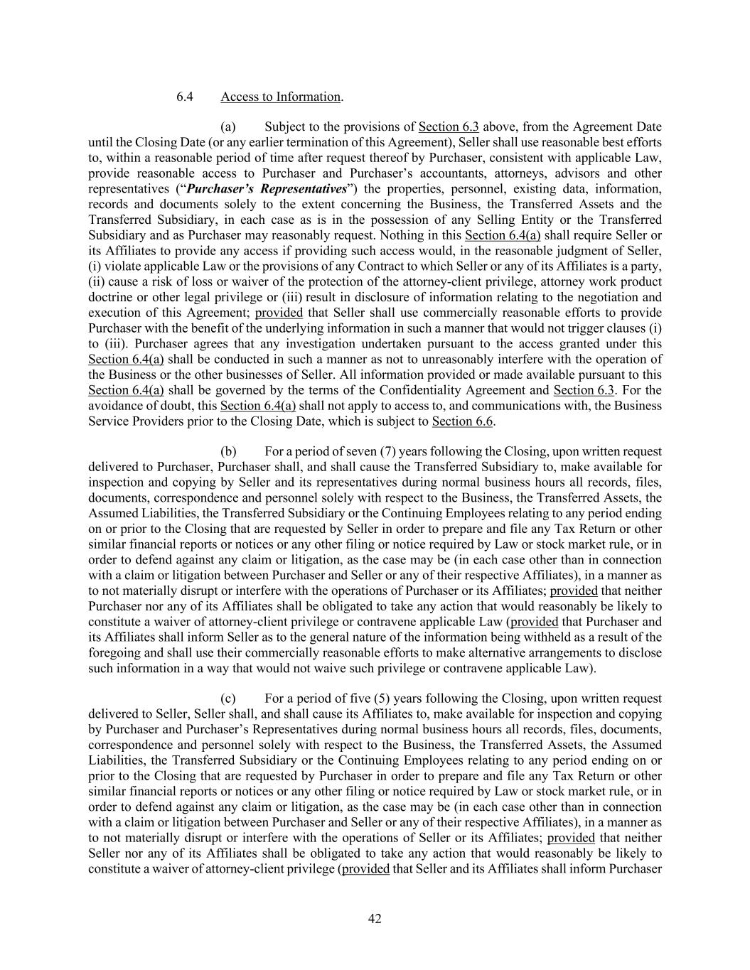 42 6.4 Access to Information. (a) Subject to the provisions of Section 6.3 above, from the Agreement Date until the Closing Date (or any earlier termination of this Agreement), Seller shall use reasonable best efforts to, within a reasonable period of time after request thereof by Purchaser, consistent with applicable Law, provide reasonable access to Purchaser and Purchaser’s accountants, attorneys, advisors and other representatives (“Purchaser’s Representatives”) the properties, personnel, existing data, information, records and documents solely to the extent concerning the Business, the Transferred Assets and the Transferred Subsidiary, in each case as is in the possession of any Selling Entity or the Transferred Subsidiary and as Purchaser may reasonably request. Nothing in this Section 6.4(a) shall require Seller or its Affiliates to provide any access if providing such access would, in the reasonable judgment of Seller, (i) violate applicable Law or the provisions of any Contract to which Seller or any of its Affiliates is a party, (ii) cause a risk of loss or waiver of the protection of the attorney-client privilege, attorney work product doctrine or other legal privilege or (iii) result in disclosure of information relating to the negotiation and execution of this Agreement; provided that Seller shall use commercially reasonable efforts to provide Purchaser with the benefit of the underlying information in such a manner that would not trigger clauses (i) to (iii). Purchaser agrees that any investigation undertaken pursuant to the access granted under this Section 6.4(a) shall be conducted in such a manner as not to unreasonably interfere with the operation of the Business or the other businesses of Seller. All information provided or made available pursuant to this Section 6.4(a) shall be governed by the terms of the Confidentiality Agreement and Section 6.3. For the avoidance of doubt, this Section 6.4(a) shall not apply to access to, and communications with, the Business Service Providers prior to the Closing Date, which is subject to Section 6.6. (b) For a period of seven (7) years following the Closing, upon written request delivered to Purchaser, Purchaser shall, and shall cause the Transferred Subsidiary to, make available for inspection and copying by Seller and its representatives during normal business hours all records, files, documents, correspondence and personnel solely with respect to the Business, the Transferred Assets, the Assumed Liabilities, the Transferred Subsidiary or the Continuing Employees relating to any period ending on or prior to the Closing that are requested by Seller in order to prepare and file any Tax Return or other similar financial reports or notices or any other filing or notice required by Law or stock market rule, or in order to defend against any claim or litigation, as the case may be (in each case other than in connection with a claim or litigation between Purchaser and Seller or any of their respective Affiliates), in a manner as to not materially disrupt or interfere with the operations of Purchaser or its Affiliates; provided that neither Purchaser nor any of its Affiliates shall be obligated to take any action that would reasonably be likely to constitute a waiver of attorney-client privilege or contravene applicable Law (provided that Purchaser and its Affiliates shall inform Seller as to the general nature of the information being withheld as a result of the foregoing and shall use their commercially reasonable efforts to make alternative arrangements to disclose such information in a way that would not waive such privilege or contravene applicable Law). (c) For a period of five (5) years following the Closing, upon written request delivered to Seller, Seller shall, and shall cause its Affiliates to, make available for inspection and copying by Purchaser and Purchaser’s Representatives during normal business hours all records, files, documents, correspondence and personnel solely with respect to the Business, the Transferred Assets, the Assumed Liabilities, the Transferred Subsidiary or the Continuing Employees relating to any period ending on or prior to the Closing that are requested by Purchaser in order to prepare and file any Tax Return or other similar financial reports or notices or any other filing or notice required by Law or stock market rule, or in order to defend against any claim or litigation, as the case may be (in each case other than in connection with a claim or litigation between Purchaser and Seller or any of their respective Affiliates), in a manner as to not materially disrupt or interfere with the operations of Seller or its Affiliates; provided that neither Seller nor any of its Affiliates shall be obligated to take any action that would reasonably be likely to constitute a waiver of attorney-client privilege (provided that Seller and its Affiliates shall inform Purchaser