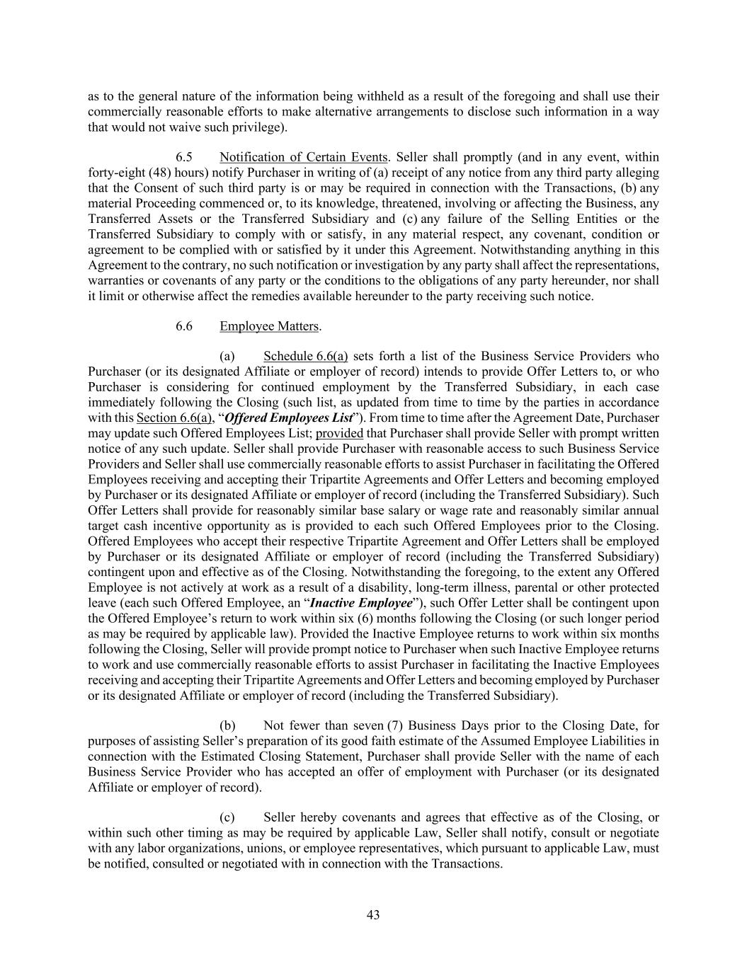 43 as to the general nature of the information being withheld as a result of the foregoing and shall use their commercially reasonable efforts to make alternative arrangements to disclose such information in a way that would not waive such privilege). 6.5 Notification of Certain Events. Seller shall promptly (and in any event, within forty-eight (48) hours) notify Purchaser in writing of (a) receipt of any notice from any third party alleging that the Consent of such third party is or may be required in connection with the Transactions, (b) any material Proceeding commenced or, to its knowledge, threatened, involving or affecting the Business, any Transferred Assets or the Transferred Subsidiary and (c) any failure of the Selling Entities or the Transferred Subsidiary to comply with or satisfy, in any material respect, any covenant, condition or agreement to be complied with or satisfied by it under this Agreement. Notwithstanding anything in this Agreement to the contrary, no such notification or investigation by any party shall affect the representations, warranties or covenants of any party or the conditions to the obligations of any party hereunder, nor shall it limit or otherwise affect the remedies available hereunder to the party receiving such notice. 6.6 Employee Matters. (a) Schedule 6.6(a) sets forth a list of the Business Service Providers who Purchaser (or its designated Affiliate or employer of record) intends to provide Offer Letters to, or who Purchaser is considering for continued employment by the Transferred Subsidiary, in each case immediately following the Closing (such list, as updated from time to time by the parties in accordance with this Section 6.6(a), “Offered Employees List”). From time to time after the Agreement Date, Purchaser may update such Offered Employees List; provided that Purchaser shall provide Seller with prompt written notice of any such update. Seller shall provide Purchaser with reasonable access to such Business Service Providers and Seller shall use commercially reasonable efforts to assist Purchaser in facilitating the Offered Employees receiving and accepting their Tripartite Agreements and Offer Letters and becoming employed by Purchaser or its designated Affiliate or employer of record (including the Transferred Subsidiary). Such Offer Letters shall provide for reasonably similar base salary or wage rate and reasonably similar annual target cash incentive opportunity as is provided to each such Offered Employees prior to the Closing. Offered Employees who accept their respective Tripartite Agreement and Offer Letters shall be employed by Purchaser or its designated Affiliate or employer of record (including the Transferred Subsidiary) contingent upon and effective as of the Closing. Notwithstanding the foregoing, to the extent any Offered Employee is not actively at work as a result of a disability, long-term illness, parental or other protected leave (each such Offered Employee, an “Inactive Employee”), such Offer Letter shall be contingent upon the Offered Employee’s return to work within six (6) months following the Closing (or such longer period as may be required by applicable law). Provided the Inactive Employee returns to work within six months following the Closing, Seller will provide prompt notice to Purchaser when such Inactive Employee returns to work and use commercially reasonable efforts to assist Purchaser in facilitating the Inactive Employees receiving and accepting their Tripartite Agreements and Offer Letters and becoming employed by Purchaser or its designated Affiliate or employer of record (including the Transferred Subsidiary). (b) Not fewer than seven (7) Business Days prior to the Closing Date, for purposes of assisting Seller’s preparation of its good faith estimate of the Assumed Employee Liabilities in connection with the Estimated Closing Statement, Purchaser shall provide Seller with the name of each Business Service Provider who has accepted an offer of employment with Purchaser (or its designated Affiliate or employer of record). (c) Seller hereby covenants and agrees that effective as of the Closing, or within such other timing as may be required by applicable Law, Seller shall notify, consult or negotiate with any labor organizations, unions, or employee representatives, which pursuant to applicable Law, must be notified, consulted or negotiated with in connection with the Transactions.