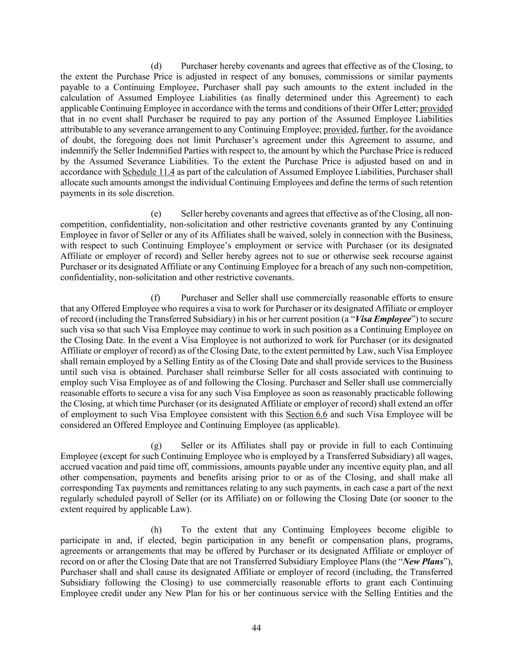 44 (d) Purchaser hereby covenants and agrees that effective as of the Closing, to the extent the Purchase Price is adjusted in respect of any bonuses, commissions or similar payments payable to a Continuing Employee, Purchaser shall pay such amounts to the extent included in the calculation of Assumed Employee Liabilities (as finally determined under this Agreement) to each applicable Continuing Employee in accordance with the terms and conditions of their Offer Letter; provided that in no event shall Purchaser be required to pay any portion of the Assumed Employee Liabilities attributable to any severance arrangement to any Continuing Employee; provided, further, for the avoidance of doubt, the foregoing does not limit Purchaser’s agreement under this Agreement to assume, and indemnify the Seller Indemnified Parties with respect to, the amount by which the Purchase Price is reduced by the Assumed Severance Liabilities. To the extent the Purchase Price is adjusted based on and in accordance with Schedule 11.4 as part of the calculation of Assumed Employee Liabilities, Purchaser shall allocate such amounts amongst the individual Continuing Employees and define the terms of such retention payments in its sole discretion. (e) Seller hereby covenants and agrees that effective as of the Closing, all non- competition, confidentiality, non-solicitation and other restrictive covenants granted by any Continuing Employee in favor of Seller or any of its Affiliates shall be waived, solely in connection with the Business, with respect to such Continuing Employee’s employment or service with Purchaser (or its designated Affiliate or employer of record) and Seller hereby agrees not to sue or otherwise seek recourse against Purchaser or its designated Affiliate or any Continuing Employee for a breach of any such non-competition, confidentiality, non-solicitation and other restrictive covenants. (f) Purchaser and Seller shall use commercially reasonable efforts to ensure that any Offered Employee who requires a visa to work for Purchaser or its designated Affiliate or employer of record (including the Transferred Subsidiary) in his or her current position (a “Visa Employee”) to secure such visa so that such Visa Employee may continue to work in such position as a Continuing Employee on the Closing Date. In the event a Visa Employee is not authorized to work for Purchaser (or its designated Affiliate or employer of record) as of the Closing Date, to the extent permitted by Law, such Visa Employee shall remain employed by a Selling Entity as of the Closing Date and shall provide services to the Business until such visa is obtained. Purchaser shall reimburse Seller for all costs associated with continuing to employ such Visa Employee as of and following the Closing. Purchaser and Seller shall use commercially reasonable efforts to secure a visa for any such Visa Employee as soon as reasonably practicable following the Closing, at which time Purchaser (or its designated Affiliate or employer of record) shall extend an offer of employment to such Visa Employee consistent with this Section 6.6 and such Visa Employee will be considered an Offered Employee and Continuing Employee (as applicable). (g) Seller or its Affiliates shall pay or provide in full to each Continuing Employee (except for such Continuing Employee who is employed by a Transferred Subsidiary) all wages, accrued vacation and paid time off, commissions, amounts payable under any incentive equity plan, and all other compensation, payments and benefits arising prior to or as of the Closing, and shall make all corresponding Tax payments and remittances relating to any such payments, in each case a part of the next regularly scheduled payroll of Seller (or its Affiliate) on or following the Closing Date (or sooner to the extent required by applicable Law). (h) To the extent that any Continuing Employees become eligible to participate in and, if elected, begin participation in any benefit or compensation plans, programs, agreements or arrangements that may be offered by Purchaser or its designated Affiliate or employer of record on or after the Closing Date that are not Transferred Subsidiary Employee Plans (the “New Plans”), Purchaser shall and shall cause its designated Affiliate or employer of record (including, the Transferred Subsidiary following the Closing) to use commercially reasonable efforts to grant each Continuing Employee credit under any New Plan for his or her continuous service with the Selling Entities and the