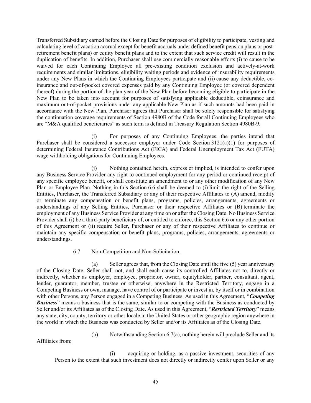 45 Transferred Subsidiary earned before the Closing Date for purposes of eligibility to participate, vesting and calculating level of vacation accrual except for benefit accruals under defined benefit pension plans or post- retirement benefit plans) or equity benefit plans and to the extent that such service credit will result in the duplication of benefits. In addition, Purchaser shall use commercially reasonable efforts (i) to cause to be waived for each Continuing Employee all pre-existing condition exclusion and actively-at-work requirements and similar limitations, eligibility waiting periods and evidence of insurability requirements under any New Plans in which the Continuing Employees participate and (ii) cause any deductible, co- insurance and out-of-pocket covered expenses paid by any Continuing Employee (or covered dependent thereof) during the portion of the plan year of the New Plan before becoming eligible to participate in the New Plan to be taken into account for purposes of satisfying applicable deductible, coinsurance and maximum out-of-pocket provisions under any applicable New Plan as if such amounts had been paid in accordance with the New Plan. Purchaser agrees that Purchaser shall be solely responsible for satisfying the continuation coverage requirements of Section 4980B of the Code for all Continuing Employees who are “M&A qualified beneficiaries” as such term is defined in Treasury Regulation Section 4980B-9. (i) For purposes of any Continuing Employees, the parties intend that Purchaser shall be considered a successor employer under Code Section 3121(a)(1) for purposes of determining Federal Insurance Contributions Act (FICA) and Federal Unemployment Tax Act (FUTA) wage withholding obligations for Continuing Employees. (j) Nothing contained herein, express or implied, is intended to confer upon any Business Service Provider any right to continued employment for any period or continued receipt of any specific employee benefit, or shall constitute an amendment to or any other modification of any New Plan or Employee Plan. Nothing in this Section 6.6 shall be deemed to (i) limit the right of the Selling Entities, Purchaser, the Transferred Subsidiary or any of their respective Affiliates to (A) amend, modify or terminate any compensation or benefit plans, programs, policies, arrangements, agreements or understandings of any Selling Entities, Purchaser or their respective Affiliates or (B) terminate the employment of any Business Service Provider at any time on or after the Closing Date. No Business Service Provider shall (i) be a third-party beneficiary of, or entitled to enforce, this Section 6.6 or any other portion of this Agreement or (ii) require Seller, Purchaser or any of their respective Affiliates to continue or maintain any specific compensation or benefit plans, programs, policies, arrangements, agreements or understandings. 6.7 Non-Competition and Non-Solicitation. (a) Seller agrees that, from the Closing Date until the five (5) year anniversary of the Closing Date, Seller shall not, and shall each cause its controlled Affiliates not to, directly or indirectly, whether as employer, employee, proprietor, owner, equityholder, partner, consultant, agent, lender, guarantor, member, trustee or otherwise, anywhere in the Restricted Territory, engage in a Competing Business or own, manage, have control of or participate or invest in, by itself or in combination with other Persons, any Person engaged in a Competing Business. As used in this Agreement, “Competing Business” means a business that is the same, similar to or competing with the Business as conducted by Seller and/or its Affiliates as of the Closing Date. As used in this Agreement, “Restricted Territory” means any state, city, county, territory or other locale in the United States or other geographic region anywhere in the world in which the Business was conducted by Seller and/or its Affiliates as of the Closing Date. (b) Notwithstanding Section 6.7(a), nothing herein will preclude Seller and its Affiliates from: (i) acquiring or holding, as a passive investment, securities of any Person to the extent that such investment does not directly or indirectly confer upon Seller or any