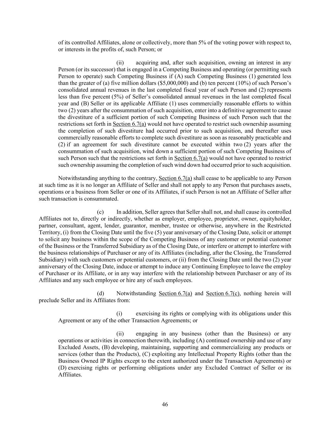 46 of its controlled Affiliates, alone or collectively, more than 5% of the voting power with respect to, or interests in the profits of, such Person; or (ii) acquiring and, after such acquisition, owning an interest in any Person (or its successor) that is engaged in a Competing Business and operating (or permitting such Person to operate) such Competing Business if (A) such Competing Business (1) generated less than the greater of (a) five million dollars ($5,000,000) and (b) ten percent (10%) of such Person’s consolidated annual revenues in the last completed fiscal year of such Person and (2) represents less than five percent (5%) of Seller’s consolidated annual revenues in the last completed fiscal year and (B) Seller or its applicable Affiliate (1) uses commercially reasonable efforts to within two (2) years after the consummation of such acquisition, enter into a definitive agreement to cause the divestiture of a sufficient portion of such Competing Business of such Person such that the restrictions set forth in Section 6.7(a) would not have operated to restrict such ownership assuming the completion of such divestiture had occurred prior to such acquisition, and thereafter uses commercially reasonable efforts to complete such divestiture as soon as reasonably practicable and (2) if an agreement for such divestiture cannot be executed within two (2) years after the consummation of such acquisition, wind down a sufficient portion of such Competing Business of such Person such that the restrictions set forth in Section 6.7(a) would not have operated to restrict such ownership assuming the completion of such wind down had occurred prior to such acquisition. Notwithstanding anything to the contrary, Section 6.7(a) shall cease to be applicable to any Person at such time as it is no longer an Affiliate of Seller and shall not apply to any Person that purchases assets, operations or a business from Seller or one of its Affiliates, if such Person is not an Affiliate of Seller after such transaction is consummated. (c) In addition, Seller agrees that Seller shall not, and shall cause its controlled Affiliates not to, directly or indirectly, whether as employer, employee, proprietor, owner, equityholder, partner, consultant, agent, lender, guarantor, member, trustee or otherwise, anywhere in the Restricted Territory, (i) from the Closing Date until the five (5) year anniversary of the Closing Date, solicit or attempt to solicit any business within the scope of the Competing Business of any customer or potential customer of the Business or the Transferred Subsidiary as of the Closing Date, or interfere or attempt to interfere with the business relationships of Purchaser or any of its Affiliates (including, after the Closing, the Transferred Subsidiary) with such customers or potential customers, or (ii) from the Closing Date until the two (2) year anniversary of the Closing Date, induce or attempt to induce any Continuing Employee to leave the employ of Purchaser or its Affiliate, or in any way interfere with the relationship between Purchaser or any of its Affiliates and any such employee or hire any of such employees. (d) Notwithstanding Section 6.7(a) and Section 6.7(c), nothing herein will preclude Seller and its Affiliates from: (i) exercising its rights or complying with its obligations under this Agreement or any of the other Transaction Agreements; or (ii) engaging in any business (other than the Business) or any operations or activities in connection therewith, including (A) continued ownership and use of any Excluded Assets, (B) developing, maintaining, supporting and commercializing any products or services (other than the Products), (C) exploiting any Intellectual Property Rights (other than the Business Owned IP Rights except to the extent authorized under the Transaction Agreements) or (D) exercising rights or performing obligations under any Excluded Contract of Seller or its Affiliates.