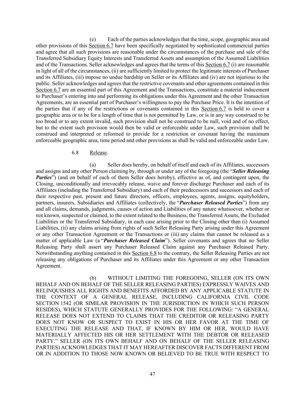 47 (e) Each of the parties acknowledges that the time, scope, geographic area and other provisions of this Section 6.7 have been specifically negotiated by sophisticated commercial parties and agree that all such provisions are reasonable under the circumstances of the purchase and sale of the Transferred Subsidiary Equity Interests and Transferred Assets and assumption of the Assumed Liabilities and of the Transactions. Seller acknowledges and agrees that the terms of this Section 6.7 (i) are reasonable in light of all of the circumstances, (ii) are sufficiently limited to protect the legitimate interests of Purchaser and its Affiliates, (iii) impose no undue hardship on Seller or its Affiliates and (iv) are not injurious to the public. Seller acknowledges and agrees that the restrictive covenants and other agreements contained in this Section 6.7 are an essential part of this Agreement and the Transactions, constitute a material inducement to Purchaser’s entering into and performing its obligations under this Agreement and the other Transaction Agreements, are an essential part of Purchaser’s willingness to pay the Purchase Price. It is the intention of the parties that if any of the restrictions or covenants contained in this Section 6.7 is held to cover a geographic area or to be for a length of time that is not permitted by Law, or is in any way construed to be too broad or to any extent invalid, such provision shall not be construed to be null, void and of no effect, but to the extent such provision would then be valid or enforceable under Law, such provision shall be construed and interpreted or reformed to provide for a restriction or covenant having the maximum enforceable geographic area, time period and other provisions as shall be valid and enforceable under Law. 6.8 Release. (a) Seller does hereby, on behalf of itself and each of its Affiliates, successors and assigns and any other Person claiming by, through or under any of the foregoing (the “Seller Releasing Parties”) (and on behalf of each of them Seller does hereby), effective as of, and contingent upon, the Closing, unconditionally and irrevocably release, waive and forever discharge Purchaser and each of its Affiliates (including the Transferred Subsidiary) and each of their predecessors and successors and each of their respective past, present and future directors, officers, employees, agents, assigns, equityholders, partners, insurers, Subsidiaries and Affiliates (collectively, the “Purchaser Released Parties”) from any and all claims, demands, judgments, causes of action and Liabilities of any nature whatsoever, whether or not known, suspected or claimed, to the extent related to the Business, the Transferred Assets, the Excluded Liabilities or the Transferred Subsidiary, in each case arising prior to the Closing other than (i) Assumed Liabilities, (ii) any claims arising from rights of such Seller Releasing Party arising under this Agreement or any other Transaction Agreement or the Transactions or (iii) any claims that cannot be released as a matter of applicable Law (a “Purchaser Released Claim”). Seller covenants and agrees that no Seller Releasing Party shall assert any Purchaser Released Claim against any Purchaser Released Party. Notwithstanding anything contained in this Section 6.8 to the contrary, the Seller Releasing Parties are not releasing any obligations of Purchaser and its Affiliates under this Agreement or any other Transaction Agreement. (b) WITHOUT LIMITING THE FOREGOING, SELLER (ON ITS OWN BEHALF AND ON BEHALF OF THE SELLER RELEASING PARTIES) EXPRESSLY WAIVES AND RELINQUISHES ALL RIGHTS AND BENEFITS AFFORDED BY ANY APPLICABLE STATUTE IN THE CONTEXT OF A GENERAL RELEASE, INCLUDING CALIFORNIA CIVIL CODE SECTION 1542 (OR SIMILAR PROVISION IN THE JURISDICTION IN WHICH SUCH PERSON RESIDES), WHICH STATUTE GENERALLY PROVIDES FOR THE FOLLOWING: “A GENERAL RELEASE DOES NOT EXTEND TO CLAIMS THAT THE CREDITOR OR RELEASING PARTY DOES NOT KNOW OR SUSPECT TO EXIST IN HIS OR HER FAVOR AT THE TIME OF EXECUTING THE RELEASE AND THAT, IF KNOWN BY HIM OR HER, WOULD HAVE MATERIALLY AFFECTED HIS OR HER SETTLEMENT WITH THE DEBTOR OR RELEASED PARTY.” SELLER (ON ITS OWN BEHALF AND ON BEHALF OF THE SELLER RELEASING PARTIES) ACKNOWLEDGES THAT IT MAY HEREAFTER DISCOVER FACTS DIFFERENT FROM OR IN ADDITION TO THOSE NOW KNOWN OR BELIEVED TO BE TRUE WITH RESPECT TO
