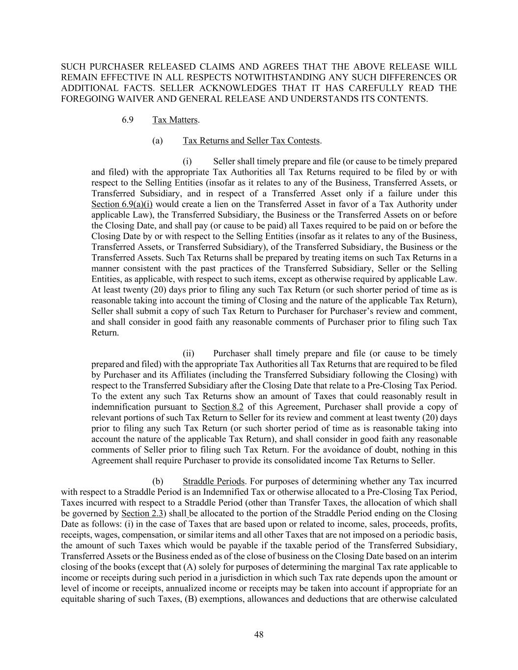 48 SUCH PURCHASER RELEASED CLAIMS AND AGREES THAT THE ABOVE RELEASE WILL REMAIN EFFECTIVE IN ALL RESPECTS NOTWITHSTANDING ANY SUCH DIFFERENCES OR ADDITIONAL FACTS. SELLER ACKNOWLEDGES THAT IT HAS CAREFULLY READ THE FOREGOING WAIVER AND GENERAL RELEASE AND UNDERSTANDS ITS CONTENTS. 6.9 Tax Matters. (a) Tax Returns and Seller Tax Contests. (i) Seller shall timely prepare and file (or cause to be timely prepared and filed) with the appropriate Tax Authorities all Tax Returns required to be filed by or with respect to the Selling Entities (insofar as it relates to any of the Business, Transferred Assets, or Transferred Subsidiary, and in respect of a Transferred Asset only if a failure under this Section 6.9(a)(i) would create a lien on the Transferred Asset in favor of a Tax Authority under applicable Law), the Transferred Subsidiary, the Business or the Transferred Assets on or before the Closing Date, and shall pay (or cause to be paid) all Taxes required to be paid on or before the Closing Date by or with respect to the Selling Entities (insofar as it relates to any of the Business, Transferred Assets, or Transferred Subsidiary), of the Transferred Subsidiary, the Business or the Transferred Assets. Such Tax Returns shall be prepared by treating items on such Tax Returns in a manner consistent with the past practices of the Transferred Subsidiary, Seller or the Selling Entities, as applicable, with respect to such items, except as otherwise required by applicable Law. At least twenty (20) days prior to filing any such Tax Return (or such shorter period of time as is reasonable taking into account the timing of Closing and the nature of the applicable Tax Return), Seller shall submit a copy of such Tax Return to Purchaser for Purchaser’s review and comment, and shall consider in good faith any reasonable comments of Purchaser prior to filing such Tax Return. (ii) Purchaser shall timely prepare and file (or cause to be timely prepared and filed) with the appropriate Tax Authorities all Tax Returns that are required to be filed by Purchaser and its Affiliates (including the Transferred Subsidiary following the Closing) with respect to the Transferred Subsidiary after the Closing Date that relate to a Pre-Closing Tax Period. To the extent any such Tax Returns show an amount of Taxes that could reasonably result in indemnification pursuant to Section 8.2 of this Agreement, Purchaser shall provide a copy of relevant portions of such Tax Return to Seller for its review and comment at least twenty (20) days prior to filing any such Tax Return (or such shorter period of time as is reasonable taking into account the nature of the applicable Tax Return), and shall consider in good faith any reasonable comments of Seller prior to filing such Tax Return. For the avoidance of doubt, nothing in this Agreement shall require Purchaser to provide its consolidated income Tax Returns to Seller. (b) Straddle Periods. For purposes of determining whether any Tax incurred with respect to a Straddle Period is an Indemnified Tax or otherwise allocated to a Pre-Closing Tax Period, Taxes incurred with respect to a Straddle Period (other than Transfer Taxes, the allocation of which shall be governed by Section 2.3) shall be allocated to the portion of the Straddle Period ending on the Closing Date as follows: (i) in the case of Taxes that are based upon or related to income, sales, proceeds, profits, receipts, wages, compensation, or similar items and all other Taxes that are not imposed on a periodic basis, the amount of such Taxes which would be payable if the taxable period of the Transferred Subsidiary, Transferred Assets or the Business ended as of the close of business on the Closing Date based on an interim closing of the books (except that (A) solely for purposes of determining the marginal Tax rate applicable to income or receipts during such period in a jurisdiction in which such Tax rate depends upon the amount or level of income or receipts, annualized income or receipts may be taken into account if appropriate for an equitable sharing of such Taxes, (B) exemptions, allowances and deductions that are otherwise calculated