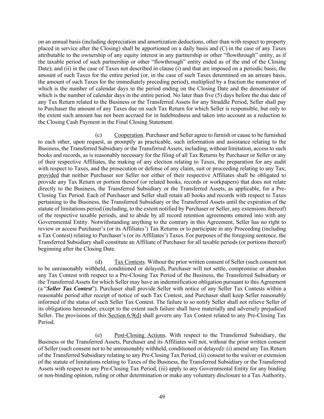 49 on an annual basis (including depreciation and amortization deductions, other than with respect to property placed in service after the Closing) shall be apportioned on a daily basis and (C) in the case of any Taxes attributable to the ownership of any equity interest in any partnership or other “flowthrough” entity, as if the taxable period of such partnership or other “flowthrough” entity ended as of the end of the Closing Date); and (ii) in the case of Taxes not described in clause (i) and that are imposed on a periodic basis, the amount of such Taxes for the entire period (or, in the case of such Taxes determined on an arrears basis, the amount of such Taxes for the immediately preceding period), multiplied by a fraction the numerator of which is the number of calendar days in the period ending on the Closing Date and the denominator of which is the number of calendar days in the entire period. No later than five (5) days before the due date of any Tax Return related to the Business or the Transferred Assets for any Straddle Period, Seller shall pay to Purchaser the amount of any Taxes due on such Tax Return for which Seller is responsible, but only to the extent such amount has not been accrued for in Indebtedness and taken into account as a reduction to the Closing Cash Payment in the Final Closing Statement. (c) Cooperation. Purchaser and Seller agree to furnish or cause to be furnished to each other, upon request, as promptly as practicable, such information and assistance relating to the Business, the Transferred Subsidiary or the Transferred Assets, including, without limitation, access to such books and records, as is reasonably necessary for the filing of all Tax Returns by Purchaser or Seller or any of their respective Affiliates, the making of any election relating to Taxes, the preparation for any audit with respect to Taxes, and the prosecution or defense of any claim, suit or proceeding relating to any Tax; provided that neither Purchaser nor Seller nor either of their respective Affiliates shall be obligated to provide any Tax Return or portion thereof (or related books, records or workpapers) that does not relate directly to the Business, the Transferred Subsidiary or the Transferred Assets, as applicable, for a Pre- Closing Tax Period. Each of Purchaser and Seller shall retain all books and records with respect to Taxes pertaining to the Business, the Transferred Subsidiary or the Transferred Assets until the expiration of the statute of limitations period (including, to the extent notified by Purchaser or Seller, any extensions thereof) of the respective taxable periods, and to abide by all record retention agreements entered into with any Governmental Entity. Notwithstanding anything to the contrary in this Agreement, Seller has no right to review or access Purchaser’s (or its Affiliates’) Tax Returns or to participate in any Proceeding (including a Tax Contest) relating to Purchaser’s (or its Affiliates’) Taxes. For purposes of the foregoing sentence, the Transferred Subsidiary shall constitute an Affiliate of Purchaser for all taxable periods (or portions thereof) beginning after the Closing Date. (d) Tax Contests. Without the prior written consent of Seller (such consent not to be unreasonably withheld, conditioned or delayed), Purchaser will not settle, compromise or abandon any Tax Contest with respect to a Pre-Closing Tax Period of the Business, the Transferred Subsidiary or the Transferred Assets for which Seller may have an indemnification obligation pursuant to this Agreement (a “Seller Tax Contest”). Purchaser shall provide Seller with notice of any Seller Tax Contests within a reasonable period after receipt of notice of such Tax Contest, and Purchaser shall keep Seller reasonably informed of the status of such Seller Tax Contest. The failure to so notify Seller shall not relieve Seller of its obligations hereunder, except to the extent such failure shall have materially and adversely prejudiced Seller. The provisions of this Section 6.9(d) shall govern any Tax Contest related to any Pre-Closing Tax Period. (e) Post-Closing Actions. With respect to the Transferred Subsidiary, the Business or the Transferred Assets, Purchaser and its Affiliates will not, without the prior written consent of Seller (such consent not to be unreasonably withheld, conditioned or delayed): (i) amend any Tax Return of the Transferred Subsidiary relating to any Pre-Closing Tax Period, (ii) consent to the waiver or extension of the statute of limitations relating to Taxes of the Business, the Transferred Subsidiary or the Transferred Assets with respect to any Pre-Closing Tax Period, (iii) apply to any Governmental Entity for any binding or non-binding opinion, ruling or other determination or make any voluntary disclosure to a Tax Authority,