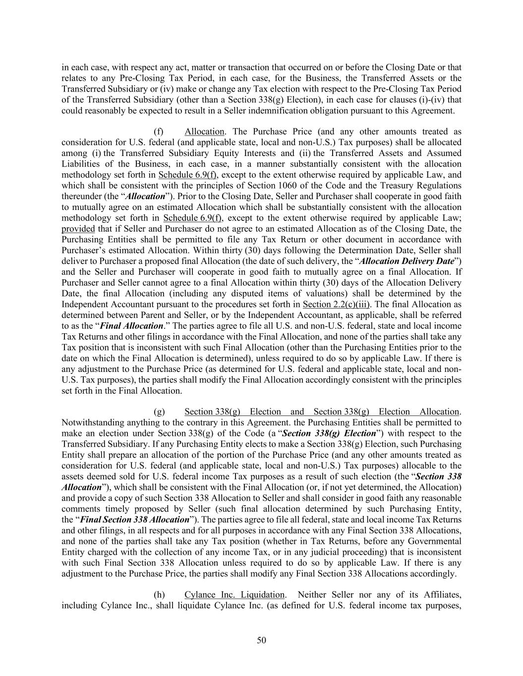 50 in each case, with respect any act, matter or transaction that occurred on or before the Closing Date or that relates to any Pre-Closing Tax Period, in each case, for the Business, the Transferred Assets or the Transferred Subsidiary or (iv) make or change any Tax election with respect to the Pre-Closing Tax Period of the Transferred Subsidiary (other than a Section 338(g) Election), in each case for clauses (i)-(iv) that could reasonably be expected to result in a Seller indemnification obligation pursuant to this Agreement. (f) Allocation. The Purchase Price (and any other amounts treated as consideration for U.S. federal (and applicable state, local and non-U.S.) Tax purposes) shall be allocated among (i) the Transferred Subsidiary Equity Interests and (ii) the Transferred Assets and Assumed Liabilities of the Business, in each case, in a manner substantially consistent with the allocation methodology set forth in Schedule 6.9(f), except to the extent otherwise required by applicable Law, and which shall be consistent with the principles of Section 1060 of the Code and the Treasury Regulations thereunder (the “Allocation”). Prior to the Closing Date, Seller and Purchaser shall cooperate in good faith to mutually agree on an estimated Allocation which shall be substantially consistent with the allocation methodology set forth in Schedule 6.9(f), except to the extent otherwise required by applicable Law; provided that if Seller and Purchaser do not agree to an estimated Allocation as of the Closing Date, the Purchasing Entities shall be permitted to file any Tax Return or other document in accordance with Purchaser’s estimated Allocation. Within thirty (30) days following the Determination Date, Seller shall deliver to Purchaser a proposed final Allocation (the date of such delivery, the “Allocation Delivery Date”) and the Seller and Purchaser will cooperate in good faith to mutually agree on a final Allocation. If Purchaser and Seller cannot agree to a final Allocation within thirty (30) days of the Allocation Delivery Date, the final Allocation (including any disputed items of valuations) shall be determined by the Independent Accountant pursuant to the procedures set forth in Section 2.2(c)(iii). The final Allocation as determined between Parent and Seller, or by the Independent Accountant, as applicable, shall be referred to as the “Final Allocation.” The parties agree to file all U.S. and non-U.S. federal, state and local income Tax Returns and other filings in accordance with the Final Allocation, and none of the parties shall take any Tax position that is inconsistent with such Final Allocation (other than the Purchasing Entities prior to the date on which the Final Allocation is determined), unless required to do so by applicable Law. If there is any adjustment to the Purchase Price (as determined for U.S. federal and applicable state, local and non- U.S. Tax purposes), the parties shall modify the Final Allocation accordingly consistent with the principles set forth in the Final Allocation. (g) Section 338(g) Election and Section 338(g) Election Allocation. Notwithstanding anything to the contrary in this Agreement. the Purchasing Entities shall be permitted to make an election under Section 338(g) of the Code (a “Section 338(g) Election”) with respect to the Transferred Subsidiary. If any Purchasing Entity elects to make a Section 338(g) Election, such Purchasing Entity shall prepare an allocation of the portion of the Purchase Price (and any other amounts treated as consideration for U.S. federal (and applicable state, local and non-U.S.) Tax purposes) allocable to the assets deemed sold for U.S. federal income Tax purposes as a result of such election (the “Section 338 Allocation”), which shall be consistent with the Final Allocation (or, if not yet determined, the Allocation) and provide a copy of such Section 338 Allocation to Seller and shall consider in good faith any reasonable comments timely proposed by Seller (such final allocation determined by such Purchasing Entity, the “Final Section 338 Allocation”). The parties agree to file all federal, state and local income Tax Returns and other filings, in all respects and for all purposes in accordance with any Final Section 338 Allocations, and none of the parties shall take any Tax position (whether in Tax Returns, before any Governmental Entity charged with the collection of any income Tax, or in any judicial proceeding) that is inconsistent with such Final Section 338 Allocation unless required to do so by applicable Law. If there is any adjustment to the Purchase Price, the parties shall modify any Final Section 338 Allocations accordingly. (h) Cylance Inc. Liquidation. Neither Seller nor any of its Affiliates, including Cylance Inc., shall liquidate Cylance Inc. (as defined for U.S. federal income tax purposes,