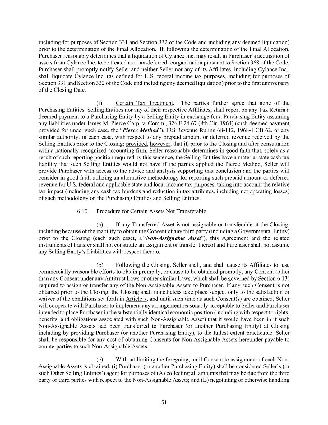 51 including for purposes of Section 331 and Section 332 of the Code and including any deemed liquidation) prior to the determination of the Final Allocation. If, following the determination of the Final Allocation, Purchaser reasonably determines that a liquidation of Cylance Inc. may result in Purchaser’s acquisition of assets from Cylance Inc. to be treated as a tax-deferred reorganization pursuant to Section 368 of the Code, Purchaser shall promptly notify Seller and neither Seller nor any of its Affiliates, including Cylance Inc., shall liquidate Cylance Inc. (as defined for U.S. federal income tax purposes, including for purposes of Section 331 and Section 332 of the Code and including any deemed liquidation) prior to the first anniversary of the Closing Date. (i) Certain Tax Treatment. The parties further agree that none of the Purchasing Entities, Selling Entities nor any of their respective Affiliates, shall report on any Tax Return a deemed payment to a Purchasing Entity by a Selling Entity in exchange for a Purchasing Entity assuming any liabilities under James M. Pierce Corp. v. Comm., 326 F.2d 67 (8th Cir. 1964) (such deemed payment provided for under such case, the “Pierce Method”), IRS Revenue Ruling 68-112, 1968-1 CB 62, or any similar authority, in each case, with respect to any prepaid amount or deferred revenue received by the Selling Entities prior to the Closing; provided, however, that if, prior to the Closing and after consultation with a nationally recognized accounting firm, Seller reasonably determines in good faith that, solely as a result of such reporting position required by this sentence, the Selling Entities have a material state cash tax liability that such Selling Entities would not have if the parties applied the Pierce Method, Seller will provide Purchaser with access to the advice and analysis supporting that conclusion and the parties will consider in good faith utilizing an alternative methodology for reporting such prepaid amount or deferred revenue for U.S. federal and applicable state and local income tax purposes, taking into account the relative tax impact (including any cash tax burdens and reduction in tax attributes, including net operating losses) of such methodology on the Purchasing Entities and Selling Entities. 6.10 Procedure for Certain Assets Not Transferable. (a) If any Transferred Asset is not assignable or transferable at the Closing, including because of the inability to obtain the Consent of any third party (including a Governmental Entity) prior to the Closing (each such asset, a “Non-Assignable Asset”), this Agreement and the related instruments of transfer shall not constitute an assignment or transfer thereof and Purchaser shall not assume any Selling Entity’s Liabilities with respect thereto. (b) Following the Closing, Seller shall, and shall cause its Affiliates to, use commercially reasonable efforts to obtain promptly, or cause to be obtained promptly, any Consent (other than any Consent under any Antitrust Laws or other similar Laws, which shall be governed by Section 6.13) required to assign or transfer any of the Non-Assignable Assets to Purchaser. If any such Consent is not obtained prior to the Closing, the Closing shall nonetheless take place subject only to the satisfaction or waiver of the conditions set forth in Article 7, and until such time as such Consent(s) are obtained, Seller will cooperate with Purchaser to implement any arrangement reasonably acceptable to Seller and Purchaser intended to place Purchaser in the substantially identical economic position (including with respect to rights, benefits, and obligations associated with such Non-Assignable Asset) that it would have been in if such Non-Assignable Assets had been transferred to Purchaser (or another Purchasing Entity) at Closing including by providing Purchaser (or another Purchasing Entity), to the fullest extent practicable. Seller shall be responsible for any cost of obtaining Consents for Non-Assignable Assets hereunder payable to counterparties to such Non-Assignable Assets. (c) Without limiting the foregoing, until Consent to assignment of each Non- Assignable Assets is obtained, (i) Purchaser (or another Purchasing Entity) shall be considered Seller’s (or such Other Selling Entities’) agent for purposes of (A) collecting all amounts that may be due from the third party or third parties with respect to the Non-Assignable Assets; and (B) negotiating or otherwise handling