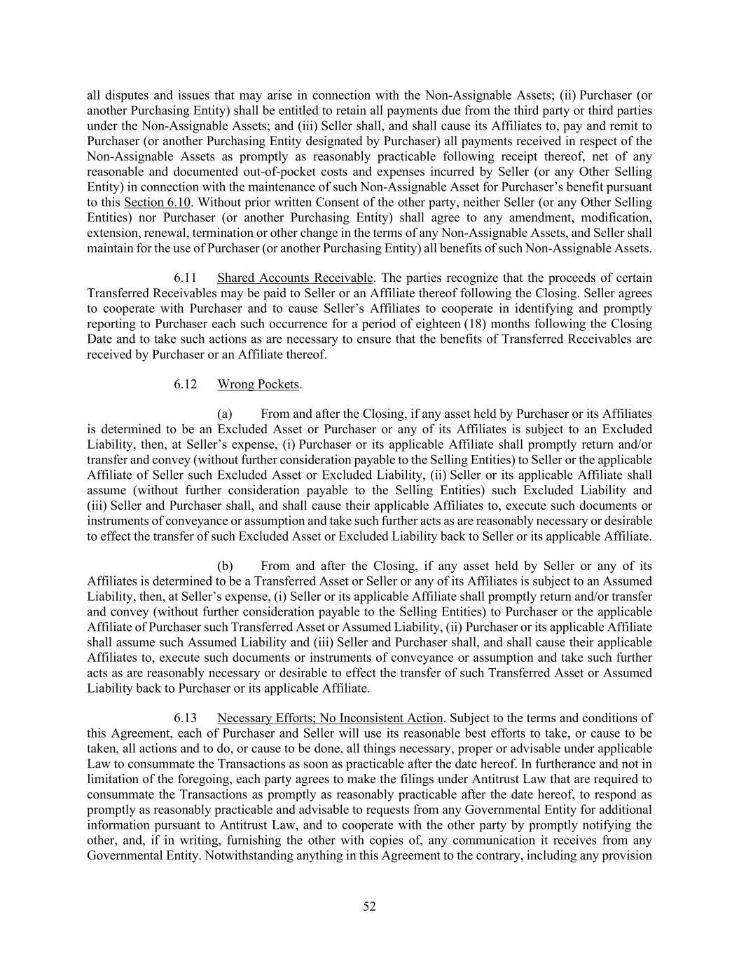 52 all disputes and issues that may arise in connection with the Non-Assignable Assets; (ii) Purchaser (or another Purchasing Entity) shall be entitled to retain all payments due from the third party or third parties under the Non-Assignable Assets; and (iii) Seller shall, and shall cause its Affiliates to, pay and remit to Purchaser (or another Purchasing Entity designated by Purchaser) all payments received in respect of the Non-Assignable Assets as promptly as reasonably practicable following receipt thereof, net of any reasonable and documented out-of-pocket costs and expenses incurred by Seller (or any Other Selling Entity) in connection with the maintenance of such Non-Assignable Asset for Purchaser’s benefit pursuant to this Section 6.10. Without prior written Consent of the other party, neither Seller (or any Other Selling Entities) nor Purchaser (or another Purchasing Entity) shall agree to any amendment, modification, extension, renewal, termination or other change in the terms of any Non-Assignable Assets, and Seller shall maintain for the use of Purchaser (or another Purchasing Entity) all benefits of such Non-Assignable Assets. 6.11 Shared Accounts Receivable. The parties recognize that the proceeds of certain Transferred Receivables may be paid to Seller or an Affiliate thereof following the Closing. Seller agrees to cooperate with Purchaser and to cause Seller’s Affiliates to cooperate in identifying and promptly reporting to Purchaser each such occurrence for a period of eighteen (18) months following the Closing Date and to take such actions as are necessary to ensure that the benefits of Transferred Receivables are received by Purchaser or an Affiliate thereof. 6.12 Wrong Pockets. (a) From and after the Closing, if any asset held by Purchaser or its Affiliates is determined to be an Excluded Asset or Purchaser or any of its Affiliates is subject to an Excluded Liability, then, at Seller’s expense, (i) Purchaser or its applicable Affiliate shall promptly return and/or transfer and convey (without further consideration payable to the Selling Entities) to Seller or the applicable Affiliate of Seller such Excluded Asset or Excluded Liability, (ii) Seller or its applicable Affiliate shall assume (without further consideration payable to the Selling Entities) such Excluded Liability and (iii) Seller and Purchaser shall, and shall cause their applicable Affiliates to, execute such documents or instruments of conveyance or assumption and take such further acts as are reasonably necessary or desirable to effect the transfer of such Excluded Asset or Excluded Liability back to Seller or its applicable Affiliate. (b) From and after the Closing, if any asset held by Seller or any of its Affiliates is determined to be a Transferred Asset or Seller or any of its Affiliates is subject to an Assumed Liability, then, at Seller’s expense, (i) Seller or its applicable Affiliate shall promptly return and/or transfer and convey (without further consideration payable to the Selling Entities) to Purchaser or the applicable Affiliate of Purchaser such Transferred Asset or Assumed Liability, (ii) Purchaser or its applicable Affiliate shall assume such Assumed Liability and (iii) Seller and Purchaser shall, and shall cause their applicable Affiliates to, execute such documents or instruments of conveyance or assumption and take such further acts as are reasonably necessary or desirable to effect the transfer of such Transferred Asset or Assumed Liability back to Purchaser or its applicable Affiliate. 6.13 Necessary Efforts; No Inconsistent Action. Subject to the terms and conditions of this Agreement, each of Purchaser and Seller will use its reasonable best efforts to take, or cause to be taken, all actions and to do, or cause to be done, all things necessary, proper or advisable under applicable Law to consummate the Transactions as soon as practicable after the date hereof. In furtherance and not in limitation of the foregoing, each party agrees to make the filings under Antitrust Law that are required to consummate the Transactions as promptly as reasonably practicable after the date hereof, to respond as promptly as reasonably practicable and advisable to requests from any Governmental Entity for additional information pursuant to Antitrust Law, and to cooperate with the other party by promptly notifying the other, and, if in writing, furnishing the other with copies of, any communication it receives from any Governmental Entity. Notwithstanding anything in this Agreement to the contrary, including any provision