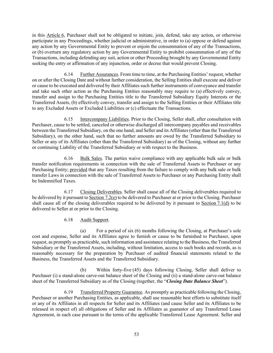 53 in this Article 6, Purchaser shall not be obligated to initiate, join, defend, take any action, or otherwise participate in any Proceedings, whether judicial or administrative, in order to (a) oppose or defend against any action by any Governmental Entity to prevent or enjoin the consummation of any of the Transactions, or (b) overturn any regulatory action by any Governmental Entity to prohibit consummation of any of the Transactions, including defending any suit, action or other Proceeding brought by any Governmental Entity seeking the entry or affirmation of any injunction, order or decree that would prevent Closing. 6.14 Further Assurances. From time to time, at the Purchasing Entities’ request, whether on or after the Closing Date and without further consideration, the Selling Entities shall execute and deliver or cause to be executed and delivered by their Affiliates such further instruments of conveyance and transfer and take such other action as the Purchasing Entities reasonably may require to (a) effectively convey, transfer and assign to the Purchasing Entities title to the Transferred Subsidiary Equity Interests or the Transferred Assets, (b) effectively convey, transfer and assign to the Selling Entities or their Affiliates title to any Excluded Assets or Excluded Liabilities or (c) effectuate the Transactions. 6.15 Intercompany Liabilities. Prior to the Closing, Seller shall, after consultation with Purchaser, cause to be settled, canceled or otherwise discharged all intercompany payables and receivables between the Transferred Subsidiary, on the one hand, and Seller and its Affiliates (other than the Transferred Subsidiary), on the other hand, such that no further amounts are owed by the Transferred Subsidiary to Seller or any of its Affiliates (other than the Transferred Subsidiary) as of the Closing, without any further or continuing Liability of the Transferred Subsidiary or with respect to the Business. 6.16 Bulk Sales. The parties waive compliance with any applicable bulk sale or bulk transfer notification requirements in connection with the sale of Transferred Assets to Purchaser or any Purchasing Entity; provided that any Taxes resulting from the failure to comply with any bulk sale or bulk transfer Laws in connection with the sale of Transferred Assets to Purchaser or any Purchasing Entity shall be Indemnified Taxes. 6.17 Closing Deliverables. Seller shall cause all of the Closing deliverables required to be delivered by it pursuant to Section 7.2(e) to be delivered to Purchaser at or prior to the Closing. Purchaser shall cause all of the closing deliverables required to be delivered by it pursuant to Section 7.1(d) to be delivered to Seller at or prior to the Closing. 6.18 Audit Support. (a) For a period of six (6) months following the Closing, at Purchaser’s sole cost and expense, Seller and its Affiliates agree to furnish or cause to be furnished to Purchaser, upon request, as promptly as practicable, such information and assistance relating to the Business, the Transferred Subsidiary or the Transferred Assets, including, without limitation, access to such books and records, as is reasonably necessary for the preparation by Purchaser of audited financial statements related to the Business, the Transferred Assets and the Transferred Subsidiary. (b) Within forty-five (45) days following Closing, Seller shall deliver to Purchaser (i) a stand-alone carve-out balance sheet of the Closing and (ii) a stand-alone carve-out balance sheet of the Transferred Subsidiary as of the Closing (together, the “Closing Date Balance Sheet”). 6.19 Transferred Property Guarantee. As promptly as practicable following the Closing, Purchaser or another Purchasing Entities, as applicable, shall use reasonable best efforts to substitute itself or any of its Affiliates in all respects for Seller and its Affiliates (and cause Seller and its Affiliates to be released in respect of) all obligations of Seller and its Affiliates as guarantor of any Transferred Lease Agreement, in each case pursuant to the terms of the applicable Transferred Lease Agreement. Seller and