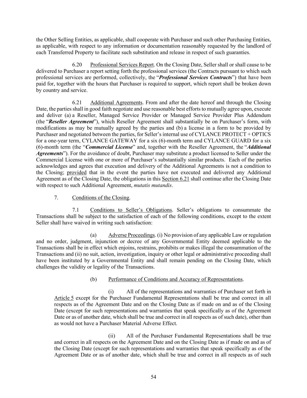 54 the Other Selling Entities, as applicable, shall cooperate with Purchaser and such other Purchasing Entities, as applicable, with respect to any information or documentation reasonably requested by the landlord of each Transferred Property to facilitate such substitution and release in respect of such guaranties. 6.20 Professional Services Report. On the Closing Date, Seller shall or shall cause to be delivered to Purchaser a report setting forth the professional services (the Contracts pursuant to which such professional services are performed, collectively, the “Professional Services Contracts”) that have been paid for, together with the hours that Purchaser is required to support, which report shall be broken down by country and service. 6.21 Additional Agreements. From and after the date hereof and through the Closing Date, the parties shall in good faith negotiate and use reasonable best efforts to mutually agree upon, execute and deliver (a) a Reseller, Managed Service Provider or Managed Service Provider Plus Addendum (the “Reseller Agreement”), which Reseller Agreement shall substantially be on Purchaser’s form, with modifications as may be mutually agreed by the parties and (b) a license in a form to be provided by Purchaser and negotiated between the parties, for Seller’s internal use of CYLANCE PROTECT + OPTICS for a one-year term, CYLANCE GATEWAY for a six (6)-month term and CYLANCE GUARD for a six (6)-month term (the “Commercial License” and, together with the Reseller Agreement, the “Additional Agreements”). For the avoidance of doubt, Purchaser may substitute a product licensed to Seller under the Commercial License with one or more of Purchaser’s substantially similar products. Each of the parties acknowledges and agrees that execution and delivery of the Additional Agreements is not a condition to the Closing; provided that in the event the parties have not executed and delivered any Additional Agreement as of the Closing Date, the obligations in this Section 6.21 shall continue after the Closing Date with respect to such Additional Agreement, mutatis mutandis. 7. Conditions of the Closing. 7.1 Conditions to Seller’s Obligations. Seller’s obligations to consummate the Transactions shall be subject to the satisfaction of each of the following conditions, except to the extent Seller shall have waived in writing such satisfaction: (a) Adverse Proceedings. (i) No provision of any applicable Law or regulation and no order, judgment, injunction or decree of any Governmental Entity deemed applicable to the Transactions shall be in effect which enjoins, restrains, prohibits or makes illegal the consummation of the Transactions and (ii) no suit, action, investigation, inquiry or other legal or administrative proceeding shall have been instituted by a Governmental Entity and shall remain pending on the Closing Date, which challenges the validity or legality of the Transactions. (b) Performance of Conditions and Accuracy of Representations. (i) All of the representations and warranties of Purchaser set forth in Article 5 except for the Purchaser Fundamental Representations shall be true and correct in all respects as of the Agreement Date and on the Closing Date as if made on and as of the Closing Date (except for such representations and warranties that speak specifically as of the Agreement Date or as of another date, which shall be true and correct in all respects as of such date), other than as would not have a Purchaser Material Adverse Effect. (ii) All of the Purchaser Fundamental Representations shall be true and correct in all respects on the Agreement Date and on the Closing Date as if made on and as of the Closing Date (except for such representations and warranties that speak specifically as of the Agreement Date or as of another date, which shall be true and correct in all respects as of such