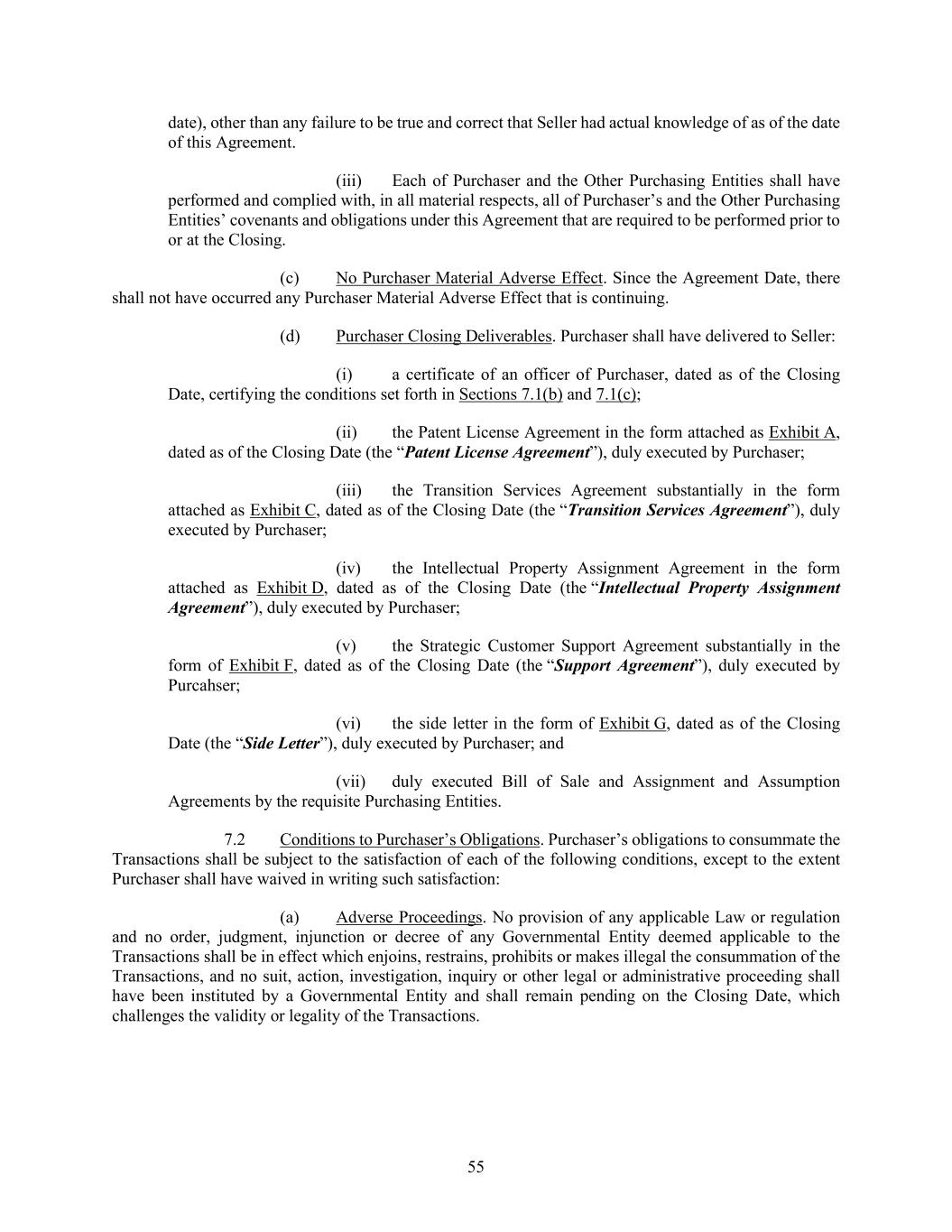 55 date), other than any failure to be true and correct that Seller had actual knowledge of as of the date of this Agreement. (iii) Each of Purchaser and the Other Purchasing Entities shall have performed and complied with, in all material respects, all of Purchaser’s and the Other Purchasing Entities’ covenants and obligations under this Agreement that are required to be performed prior to or at the Closing. (c) No Purchaser Material Adverse Effect. Since the Agreement Date, there shall not have occurred any Purchaser Material Adverse Effect that is continuing. (d) Purchaser Closing Deliverables. Purchaser shall have delivered to Seller: (i) a certificate of an officer of Purchaser, dated as of the Closing Date, certifying the conditions set forth in Sections 7.1(b) and 7.1(c); (ii) the Patent License Agreement in the form attached as Exhibit A, dated as of the Closing Date (the “Patent License Agreement”), duly executed by Purchaser; (iii) the Transition Services Agreement substantially in the form attached as Exhibit C, dated as of the Closing Date (the “Transition Services Agreement”), duly executed by Purchaser; (iv) the Intellectual Property Assignment Agreement in the form attached as Exhibit D, dated as of the Closing Date (the “Intellectual Property Assignment Agreement”), duly executed by Purchaser; (v) the Strategic Customer Support Agreement substantially in the form of Exhibit F, dated as of the Closing Date (the “Support Agreement”), duly executed by Purcahser; (vi) the side letter in the form of Exhibit G, dated as of the Closing Date (the “Side Letter”), duly executed by Purchaser; and (vii) duly executed Bill of Sale and Assignment and Assumption Agreements by the requisite Purchasing Entities. 7.2 Conditions to Purchaser’s Obligations. Purchaser’s obligations to consummate the Transactions shall be subject to the satisfaction of each of the following conditions, except to the extent Purchaser shall have waived in writing such satisfaction: (a) Adverse Proceedings. No provision of any applicable Law or regulation and no order, judgment, injunction or decree of any Governmental Entity deemed applicable to the Transactions shall be in effect which enjoins, restrains, prohibits or makes illegal the consummation of the Transactions, and no suit, action, investigation, inquiry or other legal or administrative proceeding shall have been instituted by a Governmental Entity and shall remain pending on the Closing Date, which challenges the validity or legality of the Transactions.