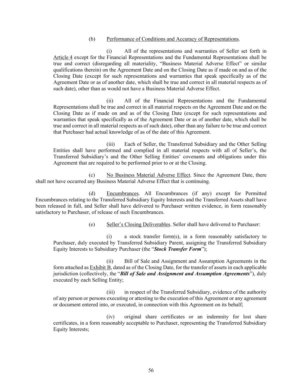 56 (b) Performance of Conditions and Accuracy of Representations. (i) All of the representations and warranties of Seller set forth in Article 4 except for the Financial Representations and the Fundamental Representations shall be true and correct (disregarding all materiality, “Business Material Adverse Effect” or similar qualifications therein) on the Agreement Date and on the Closing Date as if made on and as of the Closing Date (except for such representations and warranties that speak specifically as of the Agreement Date or as of another date, which shall be true and correct in all material respects as of such date), other than as would not have a Business Material Adverse Effect. (ii) All of the Financial Representations and the Fundamental Representations shall be true and correct in all material respects on the Agreement Date and on the Closing Date as if made on and as of the Closing Date (except for such representations and warranties that speak specifically as of the Agreement Date or as of another date, which shall be true and correct in all material respects as of such date), other than any failure to be true and correct that Purchaser had actual knowledge of as of the date of this Agreement. (iii) Each of Seller, the Transferred Subsidiary and the Other Selling Entities shall have performed and complied in all material respects with all of Seller’s, the Transferred Subsidiary’s and the Other Selling Entities’ covenants and obligations under this Agreement that are required to be performed prior to or at the Closing. (c) No Business Material Adverse Effect. Since the Agreement Date, there shall not have occurred any Business Material Adverse Effect that is continuing. (d) Encumbrances. All Encumbrances (if any) except for Permitted Encumbrances relating to the Transferred Subsidiary Equity Interests and the Transferred Assets shall have been released in full, and Seller shall have delivered to Purchaser written evidence, in form reasonably satisfactory to Purchaser, of release of such Encumbrances. (e) Seller’s Closing Deliverables. Seller shall have delivered to Purchaser: (i) a stock transfer form(s), in a form reasonably satisfactory to Purchaser, duly executed by Transferred Subsidiary Parent, assigning the Transferred Subsidiary Equity Interests to Subsidiary Purchaser (the “Stock Transfer Form”); (ii) Bill of Sale and Assignment and Assumption Agreements in the form attached as Exhibit B, dated as of the Closing Date, for the transfer of assets in each applicable jurisdiction (collectively, the “Bill of Sale and Assignment and Assumption Agreements”), duly executed by each Selling Entity; (iii) in respect of the Transferred Subsidiary, evidence of the authority of any person or persons executing or attesting to the execution of this Agreement or any agreement or document entered into, or executed, in connection with this Agreement on its behalf; (iv) original share certificates or an indemnity for lost share certificates, in a form reasonably acceptable to Purchaser, representing the Transferred Subsidiary Equity Interests;