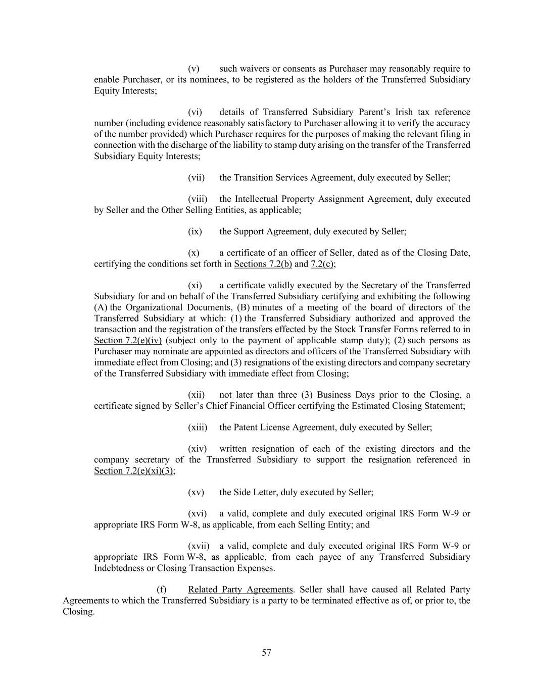 57 (v) such waivers or consents as Purchaser may reasonably require to enable Purchaser, or its nominees, to be registered as the holders of the Transferred Subsidiary Equity Interests; (vi) details of Transferred Subsidiary Parent’s Irish tax reference number (including evidence reasonably satisfactory to Purchaser allowing it to verify the accuracy of the number provided) which Purchaser requires for the purposes of making the relevant filing in connection with the discharge of the liability to stamp duty arising on the transfer of the Transferred Subsidiary Equity Interests; (vii) the Transition Services Agreement, duly executed by Seller; (viii) the Intellectual Property Assignment Agreement, duly executed by Seller and the Other Selling Entities, as applicable; (ix) the Support Agreement, duly executed by Seller; (x) a certificate of an officer of Seller, dated as of the Closing Date, certifying the conditions set forth in Sections 7.2(b) and 7.2(c); (xi) a certificate validly executed by the Secretary of the Transferred Subsidiary for and on behalf of the Transferred Subsidiary certifying and exhibiting the following (A) the Organizational Documents, (B) minutes of a meeting of the board of directors of the Transferred Subsidiary at which: (1) the Transferred Subsidiary authorized and approved the transaction and the registration of the transfers effected by the Stock Transfer Forms referred to in Section 7.2(e)(iv) (subject only to the payment of applicable stamp duty); (2) such persons as Purchaser may nominate are appointed as directors and officers of the Transferred Subsidiary with immediate effect from Closing; and (3) resignations of the existing directors and company secretary of the Transferred Subsidiary with immediate effect from Closing; (xii) not later than three (3) Business Days prior to the Closing, a certificate signed by Seller’s Chief Financial Officer certifying the Estimated Closing Statement; (xiii) the Patent License Agreement, duly executed by Seller; (xiv) written resignation of each of the existing directors and the company secretary of the Transferred Subsidiary to support the resignation referenced in Section 7.2(e)(xi)(3); (xv) the Side Letter, duly executed by Seller; (xvi) a valid, complete and duly executed original IRS Form W-9 or appropriate IRS Form W-8, as applicable, from each Selling Entity; and (xvii) a valid, complete and duly executed original IRS Form W-9 or appropriate IRS Form W-8, as applicable, from each payee of any Transferred Subsidiary Indebtedness or Closing Transaction Expenses. (f) Related Party Agreements. Seller shall have caused all Related Party Agreements to which the Transferred Subsidiary is a party to be terminated effective as of, or prior to, the Closing.