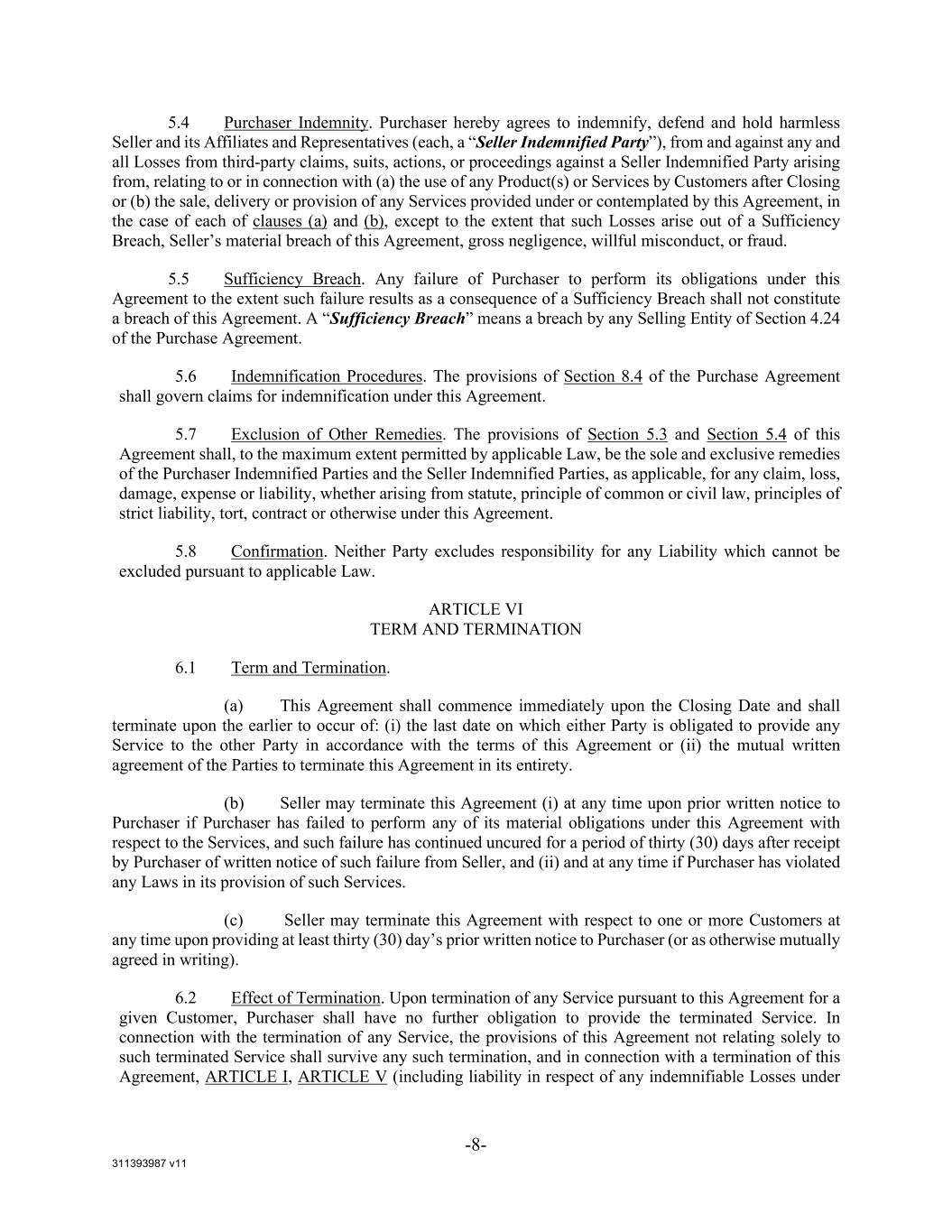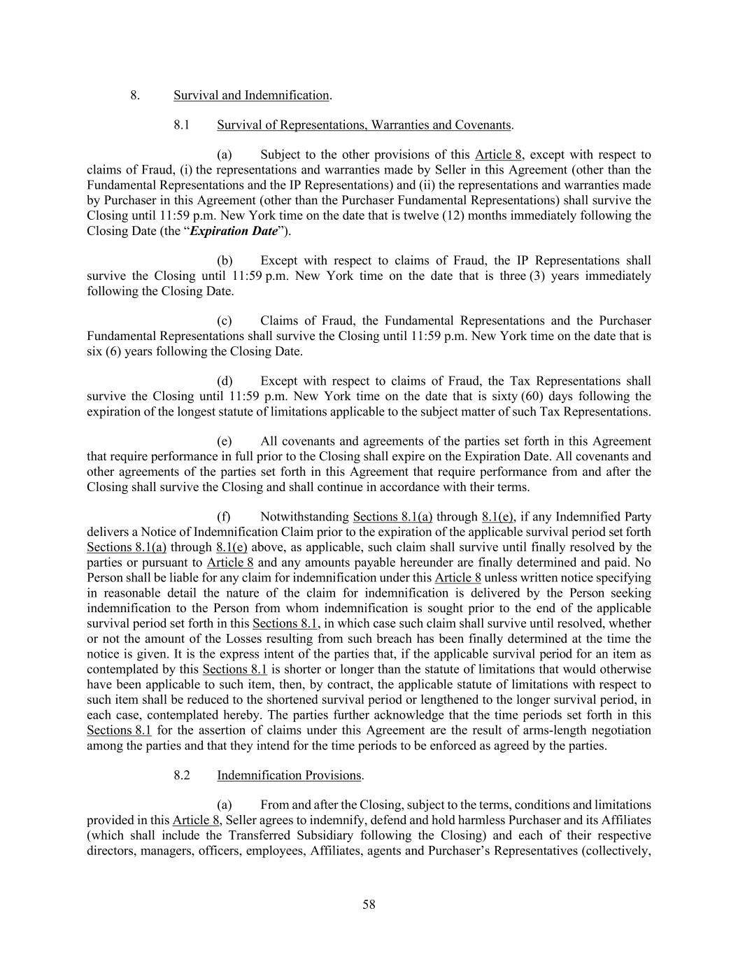 58 8. Survival and Indemnification. 8.1 Survival of Representations, Warranties and Covenants. (a) Subject to the other provisions of this Article 8, except with respect to claims of Fraud, (i) the representations and warranties made by Seller in this Agreement (other than the Fundamental Representations and the IP Representations) and (ii) the representations and warranties made by Purchaser in this Agreement (other than the Purchaser Fundamental Representations) shall survive the Closing until 11:59 p.m. New York time on the date that is twelve (12) months immediately following the Closing Date (the “Expiration Date”). (b) Except with respect to claims of Fraud, the IP Representations shall survive the Closing until 11:59 p.m. New York time on the date that is three (3) years immediately following the Closing Date. (c) Claims of Fraud, the Fundamental Representations and the Purchaser Fundamental Representations shall survive the Closing until 11:59 p.m. New York time on the date that is six (6) years following the Closing Date. (d) Except with respect to claims of Fraud, the Tax Representations shall survive the Closing until 11:59 p.m. New York time on the date that is sixty (60) days following the expiration of the longest statute of limitations applicable to the subject matter of such Tax Representations. (e) All covenants and agreements of the parties set forth in this Agreement that require performance in full prior to the Closing shall expire on the Expiration Date. All covenants and other agreements of the parties set forth in this Agreement that require performance from and after the Closing shall survive the Closing and shall continue in accordance with their terms. (f) Notwithstanding Sections 8.1(a) through 8.1(e), if any Indemnified Party delivers a Notice of Indemnification Claim prior to the expiration of the applicable survival period set forth Sections 8.1(a) through 8.1(e) above, as applicable, such claim shall survive until finally resolved by the parties or pursuant to Article 8 and any amounts payable hereunder are finally determined and paid. No Person shall be liable for any claim for indemnification under this Article 8 unless written notice specifying in reasonable detail the nature of the claim for indemnification is delivered by the Person seeking indemnification to the Person from whom indemnification is sought prior to the end of the applicable survival period set forth in this Sections 8.1, in which case such claim shall survive until resolved, whether or not the amount of the Losses resulting from such breach has been finally determined at the time the notice is given. It is the express intent of the parties that, if the applicable survival period for an item as contemplated by this Sections 8.1 is shorter or longer than the statute of limitations that would otherwise have been applicable to such item, then, by contract, the applicable statute of limitations with respect to such item shall be reduced to the shortened survival period or lengthened to the longer survival period, in each case, contemplated hereby. The parties further acknowledge that the time periods set forth in this Sections 8.1 for the assertion of claims under this Agreement are the result of arms-length negotiation among the parties and that they intend for the time periods to be enforced as agreed by the parties. 8.2 Indemnification Provisions. (a) From and after the Closing, subject to the terms, conditions and limitations provided in this Article 8, Seller agrees to indemnify, defend and hold harmless Purchaser and its Affiliates (which shall include the Transferred Subsidiary following the Closing) and each of their respective directors, managers, officers, employees, Affiliates, agents and Purchaser’s Representatives (collectively,