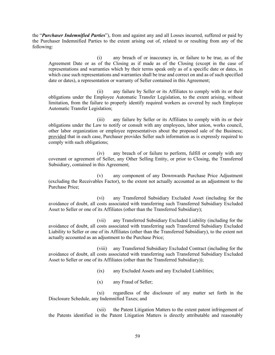59 the “Purchaser Indemnified Parties”), from and against any and all Losses incurred, suffered or paid by the Purchaser Indemnified Parties to the extent arising out of, related to or resulting from any of the following: (i) any breach of or inaccuracy in, or failure to be true, as of the Agreement Date or as of the Closing as if made as of the Closing (except in the case of representations and warranties which by their terms speak only as of a specific date or dates, in which case such representations and warranties shall be true and correct on and as of such specified date or dates), a representation or warranty of Seller contained in this Agreement; (ii) any failure by Seller or its Affiliates to comply with its or their obligations under the Employee Automatic Transfer Legislation, to the extent arising, without limitation, from the failure to properly identify required workers as covered by such Employee Automatic Transfer Legislation; (iii) any failure by Seller or its Affiliates to comply with its or their obligations under the Law to notify or consult with any employees, labor union, works council, other labor organization or employee representatives about the proposed sale of the Business; provided that in each case, Purchaser provides Seller such information as is expressly required to comply with such obligations; (iv) any breach of or failure to perform, fulfill or comply with any covenant or agreement of Seller, any Other Selling Entity, or prior to Closing, the Transferred Subsidiary, contained in this Agreement; (v) any component of any Downwards Purchase Price Adjustment (excluding the Receivables Factor), to the extent not actually accounted as an adjustment to the Purchase Price; (vi) any Transferred Subsidiary Excluded Asset (including for the avoidance of doubt, all costs associated with transferring such Transferred Subsidiary Excluded Asset to Seller or one of its Affiliates (other than the Transferred Subsidiary); (vii) any Transferred Subsidiary Excluded Liability (including for the avoidance of doubt, all costs associated with transferring such Transferred Subsidiary Excluded Liability to Seller or one of its Affiliates (other than the Transferred Subsidiary), to the extent not actually accounted as an adjustment to the Purchase Price; (viii) any Transferred Subsidiary Excluded Contract (including for the avoidance of doubt, all costs associated with transferring such Transferred Subsidiary Excluded Asset to Seller or one of its Affiliates (other than the Transferred Subsidiary)); (ix) any Excluded Assets and any Excluded Liabilities; (x) any Fraud of Seller; (xi) regardless of the disclosure of any matter set forth in the Disclosure Schedule, any Indemnified Taxes; and (xii) the Patent Litigation Matters to the extent patent infringement of the Patents identified in the Patent Litigation Matters is directly attributable and reasonably