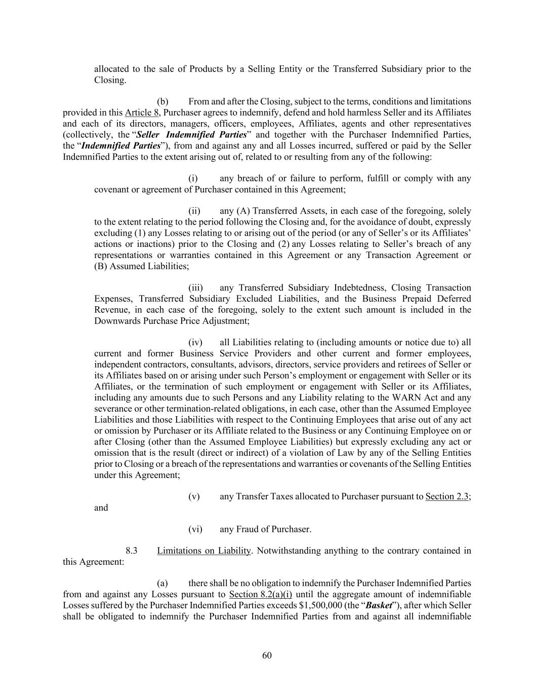 60 allocated to the sale of Products by a Selling Entity or the Transferred Subsidiary prior to the Closing. (b) From and after the Closing, subject to the terms, conditions and limitations provided in this Article 8, Purchaser agrees to indemnify, defend and hold harmless Seller and its Affiliates and each of its directors, managers, officers, employees, Affiliates, agents and other representatives (collectively, the “Seller Indemnified Parties” and together with the Purchaser Indemnified Parties, the “Indemnified Parties”), from and against any and all Losses incurred, suffered or paid by the Seller Indemnified Parties to the extent arising out of, related to or resulting from any of the following: (i) any breach of or failure to perform, fulfill or comply with any covenant or agreement of Purchaser contained in this Agreement; (ii) any (A) Transferred Assets, in each case of the foregoing, solely to the extent relating to the period following the Closing and, for the avoidance of doubt, expressly excluding (1) any Losses relating to or arising out of the period (or any of Seller’s or its Affiliates’ actions or inactions) prior to the Closing and (2) any Losses relating to Seller’s breach of any representations or warranties contained in this Agreement or any Transaction Agreement or (B) Assumed Liabilities; (iii) any Transferred Subsidiary Indebtedness, Closing Transaction Expenses, Transferred Subsidiary Excluded Liabilities, and the Business Prepaid Deferred Revenue, in each case of the foregoing, solely to the extent such amount is included in the Downwards Purchase Price Adjustment; (iv) all Liabilities relating to (including amounts or notice due to) all current and former Business Service Providers and other current and former employees, independent contractors, consultants, advisors, directors, service providers and retirees of Seller or its Affiliates based on or arising under such Person’s employment or engagement with Seller or its Affiliates, or the termination of such employment or engagement with Seller or its Affiliates, including any amounts due to such Persons and any Liability relating to the WARN Act and any severance or other termination-related obligations, in each case, other than the Assumed Employee Liabilities and those Liabilities with respect to the Continuing Employees that arise out of any act or omission by Purchaser or its Affiliate related to the Business or any Continuing Employee on or after Closing (other than the Assumed Employee Liabilities) but expressly excluding any act or omission that is the result (direct or indirect) of a violation of Law by any of the Selling Entities prior to Closing or a breach of the representations and warranties or covenants of the Selling Entities under this Agreement; (v) any Transfer Taxes allocated to Purchaser pursuant to Section 2.3; and (vi) any Fraud of Purchaser. 8.3 Limitations on Liability. Notwithstanding anything to the contrary contained in this Agreement: (a) there shall be no obligation to indemnify the Purchaser Indemnified Parties from and against any Losses pursuant to Section 8.2(a)(i) until the aggregate amount of indemnifiable Losses suffered by the Purchaser Indemnified Parties exceeds $1,500,000 (the “Basket”), after which Seller shall be obligated to indemnify the Purchaser Indemnified Parties from and against all indemnifiable