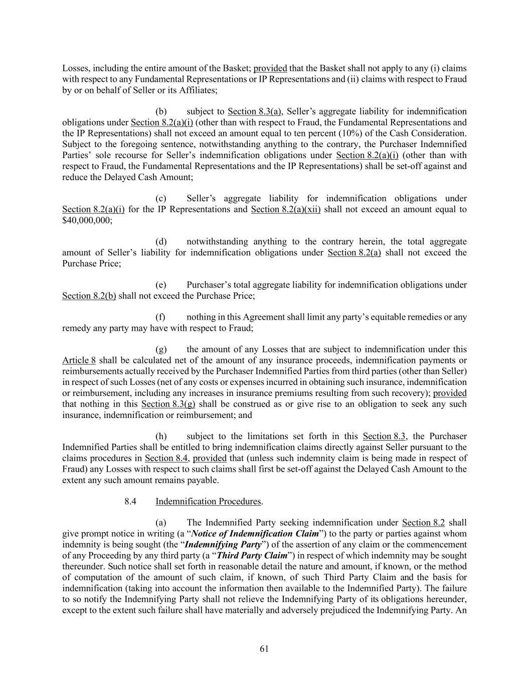 61 Losses, including the entire amount of the Basket; provided that the Basket shall not apply to any (i) claims with respect to any Fundamental Representations or IP Representations and (ii) claims with respect to Fraud by or on behalf of Seller or its Affiliates; (b) subject to Section 8.3(a), Seller’s aggregate liability for indemnification obligations under Section 8.2(a)(i) (other than with respect to Fraud, the Fundamental Representations and the IP Representations) shall not exceed an amount equal to ten percent (10%) of the Cash Consideration. Subject to the foregoing sentence, notwithstanding anything to the contrary, the Purchaser Indemnified Parties’ sole recourse for Seller’s indemnification obligations under Section 8.2(a)(i) (other than with respect to Fraud, the Fundamental Representations and the IP Representations) shall be set-off against and reduce the Delayed Cash Amount; (c) Seller’s aggregate liability for indemnification obligations under Section 8.2(a)(i) for the IP Representations and Section 8.2(a)(xii) shall not exceed an amount equal to $40,000,000; (d) notwithstanding anything to the contrary herein, the total aggregate amount of Seller’s liability for indemnification obligations under Section 8.2(a) shall not exceed the Purchase Price; (e) Purchaser’s total aggregate liability for indemnification obligations under Section 8.2(b) shall not exceed the Purchase Price; (f) nothing in this Agreement shall limit any party’s equitable remedies or any remedy any party may have with respect to Fraud; (g) the amount of any Losses that are subject to indemnification under this Article 8 shall be calculated net of the amount of any insurance proceeds, indemnification payments or reimbursements actually received by the Purchaser Indemnified Parties from third parties (other than Seller) in respect of such Losses (net of any costs or expenses incurred in obtaining such insurance, indemnification or reimbursement, including any increases in insurance premiums resulting from such recovery); provided that nothing in this Section 8.3(g) shall be construed as or give rise to an obligation to seek any such insurance, indemnification or reimbursement; and (h) subject to the limitations set forth in this Section 8.3, the Purchaser Indemnified Parties shall be entitled to bring indemnification claims directly against Seller pursuant to the claims procedures in Section 8.4, provided that (unless such indemnity claim is being made in respect of Fraud) any Losses with respect to such claims shall first be set-off against the Delayed Cash Amount to the extent any such amount remains payable. 8.4 Indemnification Procedures. (a) The Indemnified Party seeking indemnification under Section 8.2 shall give prompt notice in writing (a “Notice of Indemnification Claim”) to the party or parties against whom indemnity is being sought (the “Indemnifying Party”) of the assertion of any claim or the commencement of any Proceeding by any third party (a “Third Party Claim”) in respect of which indemnity may be sought thereunder. Such notice shall set forth in reasonable detail the nature and amount, if known, or the method of computation of the amount of such claim, if known, of such Third Party Claim and the basis for indemnification (taking into account the information then available to the Indemnified Party). The failure to so notify the Indemnifying Party shall not relieve the Indemnifying Party of its obligations hereunder, except to the extent such failure shall have materially and adversely prejudiced the Indemnifying Party. An