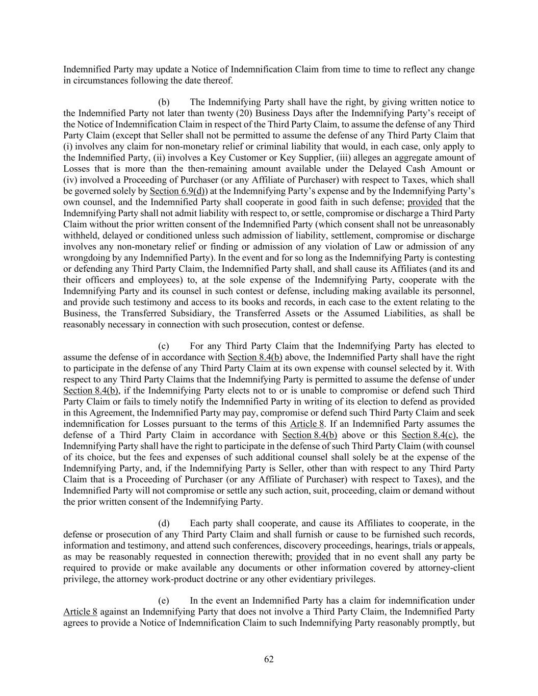 62 Indemnified Party may update a Notice of Indemnification Claim from time to time to reflect any change in circumstances following the date thereof. (b) The Indemnifying Party shall have the right, by giving written notice to the Indemnified Party not later than twenty (20) Business Days after the Indemnifying Party’s receipt of the Notice of Indemnification Claim in respect of the Third Party Claim, to assume the defense of any Third Party Claim (except that Seller shall not be permitted to assume the defense of any Third Party Claim that (i) involves any claim for non-monetary relief or criminal liability that would, in each case, only apply to the Indemnified Party, (ii) involves a Key Customer or Key Supplier, (iii) alleges an aggregate amount of Losses that is more than the then-remaining amount available under the Delayed Cash Amount or (iv) involved a Proceeding of Purchaser (or any Affiliate of Purchaser) with respect to Taxes, which shall be governed solely by Section 6.9(d)) at the Indemnifying Party’s expense and by the Indemnifying Party’s own counsel, and the Indemnified Party shall cooperate in good faith in such defense; provided that the Indemnifying Party shall not admit liability with respect to, or settle, compromise or discharge a Third Party Claim without the prior written consent of the Indemnified Party (which consent shall not be unreasonably withheld, delayed or conditioned unless such admission of liability, settlement, compromise or discharge involves any non-monetary relief or finding or admission of any violation of Law or admission of any wrongdoing by any Indemnified Party). In the event and for so long as the Indemnifying Party is contesting or defending any Third Party Claim, the Indemnified Party shall, and shall cause its Affiliates (and its and their officers and employees) to, at the sole expense of the Indemnifying Party, cooperate with the Indemnifying Party and its counsel in such contest or defense, including making available its personnel, and provide such testimony and access to its books and records, in each case to the extent relating to the Business, the Transferred Subsidiary, the Transferred Assets or the Assumed Liabilities, as shall be reasonably necessary in connection with such prosecution, contest or defense. (c) For any Third Party Claim that the Indemnifying Party has elected to assume the defense of in accordance with Section 8.4(b) above, the Indemnified Party shall have the right to participate in the defense of any Third Party Claim at its own expense with counsel selected by it. With respect to any Third Party Claims that the Indemnifying Party is permitted to assume the defense of under Section 8.4(b), if the Indemnifying Party elects not to or is unable to compromise or defend such Third Party Claim or fails to timely notify the Indemnified Party in writing of its election to defend as provided in this Agreement, the Indemnified Party may pay, compromise or defend such Third Party Claim and seek indemnification for Losses pursuant to the terms of this Article 8. If an Indemnified Party assumes the defense of a Third Party Claim in accordance with Section 8.4(b) above or this Section 8.4(c), the Indemnifying Party shall have the right to participate in the defense of such Third Party Claim (with counsel of its choice, but the fees and expenses of such additional counsel shall solely be at the expense of the Indemnifying Party, and, if the Indemnifying Party is Seller, other than with respect to any Third Party Claim that is a Proceeding of Purchaser (or any Affiliate of Purchaser) with respect to Taxes), and the Indemnified Party will not compromise or settle any such action, suit, proceeding, claim or demand without the prior written consent of the Indemnifying Party. (d) Each party shall cooperate, and cause its Affiliates to cooperate, in the defense or prosecution of any Third Party Claim and shall furnish or cause to be furnished such records, information and testimony, and attend such conferences, discovery proceedings, hearings, trials or appeals, as may be reasonably requested in connection therewith; provided that in no event shall any party be required to provide or make available any documents or other information covered by attorney-client privilege, the attorney work-product doctrine or any other evidentiary privileges. (e) In the event an Indemnified Party has a claim for indemnification under Article 8 against an Indemnifying Party that does not involve a Third Party Claim, the Indemnified Party agrees to provide a Notice of Indemnification Claim to such Indemnifying Party reasonably promptly, but