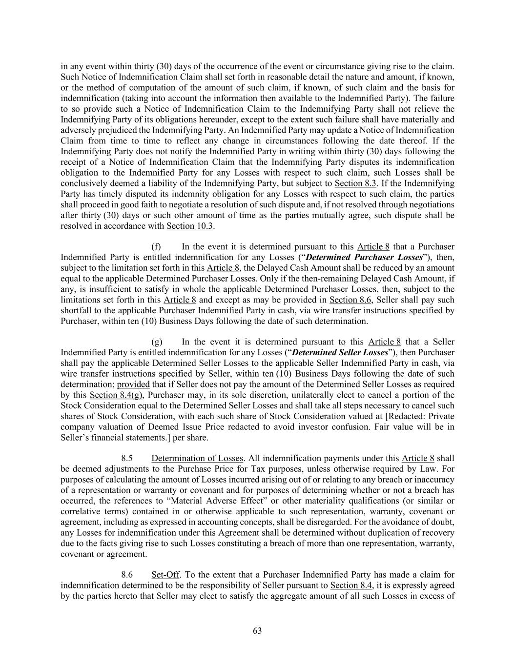 63 in any event within thirty (30) days of the occurrence of the event or circumstance giving rise to the claim. Such Notice of Indemnification Claim shall set forth in reasonable detail the nature and amount, if known, or the method of computation of the amount of such claim, if known, of such claim and the basis for indemnification (taking into account the information then available to the Indemnified Party). The failure to so provide such a Notice of Indemnification Claim to the Indemnifying Party shall not relieve the Indemnifying Party of its obligations hereunder, except to the extent such failure shall have materially and adversely prejudiced the Indemnifying Party. An Indemnified Party may update a Notice of Indemnification Claim from time to time to reflect any change in circumstances following the date thereof. If the Indemnifying Party does not notify the Indemnified Party in writing within thirty (30) days following the receipt of a Notice of Indemnification Claim that the Indemnifying Party disputes its indemnification obligation to the Indemnified Party for any Losses with respect to such claim, such Losses shall be conclusively deemed a liability of the Indemnifying Party, but subject to Section 8.3. If the Indemnifying Party has timely disputed its indemnity obligation for any Losses with respect to such claim, the parties shall proceed in good faith to negotiate a resolution of such dispute and, if not resolved through negotiations after thirty (30) days or such other amount of time as the parties mutually agree, such dispute shall be resolved in accordance with Section 10.3. (f) In the event it is determined pursuant to this Article 8 that a Purchaser Indemnified Party is entitled indemnification for any Losses (“Determined Purchaser Losses”), then, subject to the limitation set forth in this Article 8, the Delayed Cash Amount shall be reduced by an amount equal to the applicable Determined Purchaser Losses. Only if the then-remaining Delayed Cash Amount, if any, is insufficient to satisfy in whole the applicable Determined Purchaser Losses, then, subject to the limitations set forth in this Article 8 and except as may be provided in Section 8.6, Seller shall pay such shortfall to the applicable Purchaser Indemnified Party in cash, via wire transfer instructions specified by Purchaser, within ten (10) Business Days following the date of such determination. (g) In the event it is determined pursuant to this Article 8 that a Seller Indemnified Party is entitled indemnification for any Losses (“Determined Seller Losses”), then Purchaser shall pay the applicable Determined Seller Losses to the applicable Seller Indemnified Party in cash, via wire transfer instructions specified by Seller, within ten (10) Business Days following the date of such determination; provided that if Seller does not pay the amount of the Determined Seller Losses as required by this Section 8.4(g), Purchaser may, in its sole discretion, unilaterally elect to cancel a portion of the Stock Consideration equal to the Determined Seller Losses and shall take all steps necessary to cancel such shares of Stock Consideration, with each such share of Stock Consideration valued at [Redacted: Private company valuation of Deemed Issue Price redacted to avoid investor confusion. Fair value will be in Seller’s financial statements.] per share. 8.5 Determination of Losses. All indemnification payments under this Article 8 shall be deemed adjustments to the Purchase Price for Tax purposes, unless otherwise required by Law. For purposes of calculating the amount of Losses incurred arising out of or relating to any breach or inaccuracy of a representation or warranty or covenant and for purposes of determining whether or not a breach has occurred, the references to “Material Adverse Effect” or other materiality qualifications (or similar or correlative terms) contained in or otherwise applicable to such representation, warranty, covenant or agreement, including as expressed in accounting concepts, shall be disregarded. For the avoidance of doubt, any Losses for indemnification under this Agreement shall be determined without duplication of recovery due to the facts giving rise to such Losses constituting a breach of more than one representation, warranty, covenant or agreement. 8.6 Set-Off. To the extent that a Purchaser Indemnified Party has made a claim for indemnification determined to be the responsibility of Seller pursuant to Section 8.4, it is expressly agreed by the parties hereto that Seller may elect to satisfy the aggregate amount of all such Losses in excess of