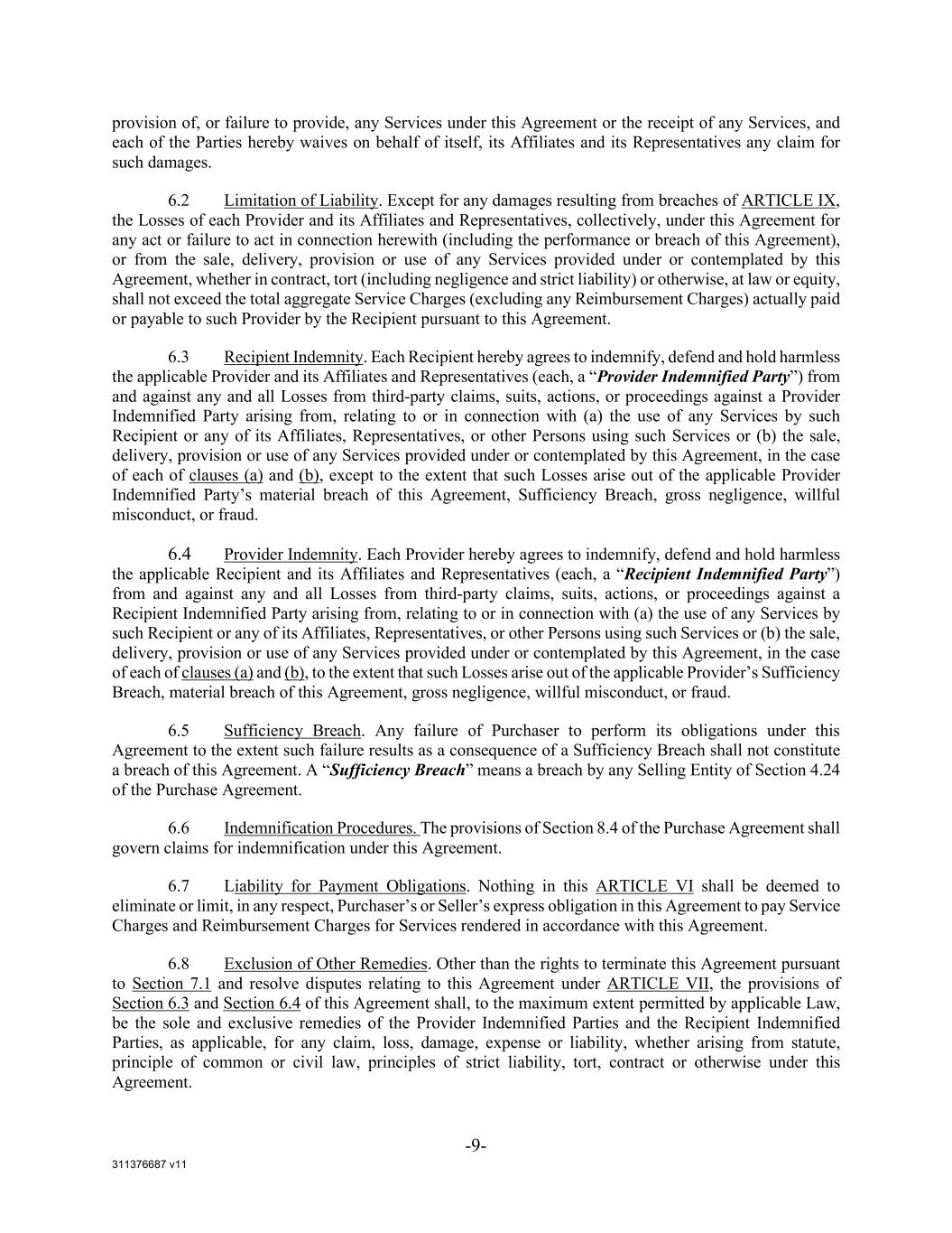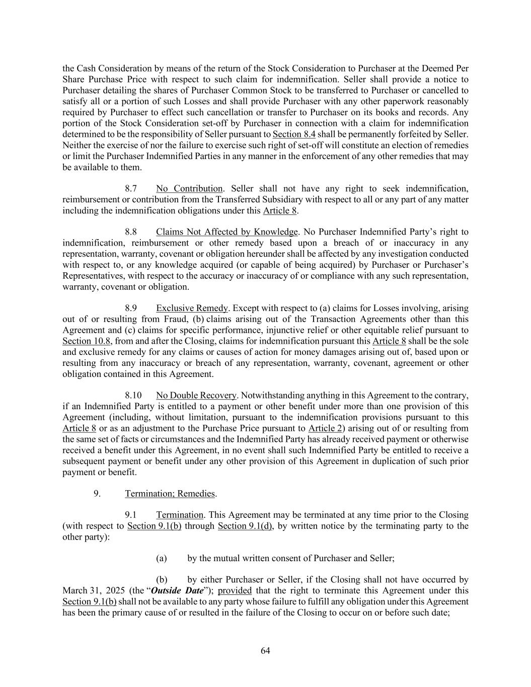 64 the Cash Consideration by means of the return of the Stock Consideration to Purchaser at the Deemed Per Share Purchase Price with respect to such claim for indemnification. Seller shall provide a notice to Purchaser detailing the shares of Purchaser Common Stock to be transferred to Purchaser or cancelled to satisfy all or a portion of such Losses and shall provide Purchaser with any other paperwork reasonably required by Purchaser to effect such cancellation or transfer to Purchaser on its books and records. Any portion of the Stock Consideration set-off by Purchaser in connection with a claim for indemnification determined to be the responsibility of Seller pursuant to Section 8.4 shall be permanently forfeited by Seller. Neither the exercise of nor the failure to exercise such right of set-off will constitute an election of remedies or limit the Purchaser Indemnified Parties in any manner in the enforcement of any other remedies that may be available to them. 8.7 No Contribution. Seller shall not have any right to seek indemnification, reimbursement or contribution from the Transferred Subsidiary with respect to all or any part of any matter including the indemnification obligations under this Article 8. 8.8 Claims Not Affected by Knowledge. No Purchaser Indemnified Party’s right to indemnification, reimbursement or other remedy based upon a breach of or inaccuracy in any representation, warranty, covenant or obligation hereunder shall be affected by any investigation conducted with respect to, or any knowledge acquired (or capable of being acquired) by Purchaser or Purchaser’s Representatives, with respect to the accuracy or inaccuracy of or compliance with any such representation, warranty, covenant or obligation. 8.9 Exclusive Remedy. Except with respect to (a) claims for Losses involving, arising out of or resulting from Fraud, (b) claims arising out of the Transaction Agreements other than this Agreement and (c) claims for specific performance, injunctive relief or other equitable relief pursuant to Section 10.8, from and after the Closing, claims for indemnification pursuant this Article 8 shall be the sole and exclusive remedy for any claims or causes of action for money damages arising out of, based upon or resulting from any inaccuracy or breach of any representation, warranty, covenant, agreement or other obligation contained in this Agreement. 8.10 No Double Recovery. Notwithstanding anything in this Agreement to the contrary, if an Indemnified Party is entitled to a payment or other benefit under more than one provision of this Agreement (including, without limitation, pursuant to the indemnification provisions pursuant to this Article 8 or as an adjustment to the Purchase Price pursuant to Article 2) arising out of or resulting from the same set of facts or circumstances and the Indemnified Party has already received payment or otherwise received a benefit under this Agreement, in no event shall such Indemnified Party be entitled to receive a subsequent payment or benefit under any other provision of this Agreement in duplication of such prior payment or benefit. 9. Termination; Remedies. 9.1 Termination. This Agreement may be terminated at any time prior to the Closing (with respect to Section 9.1(b) through Section 9.1(d), by written notice by the terminating party to the other party): (a) by the mutual written consent of Purchaser and Seller; (b) by either Purchaser or Seller, if the Closing shall not have occurred by March 31, 2025 (the “Outside Date”); provided that the right to terminate this Agreement under this Section 9.1(b) shall not be available to any party whose failure to fulfill any obligation under this Agreement has been the primary cause of or resulted in the failure of the Closing to occur on or before such date;