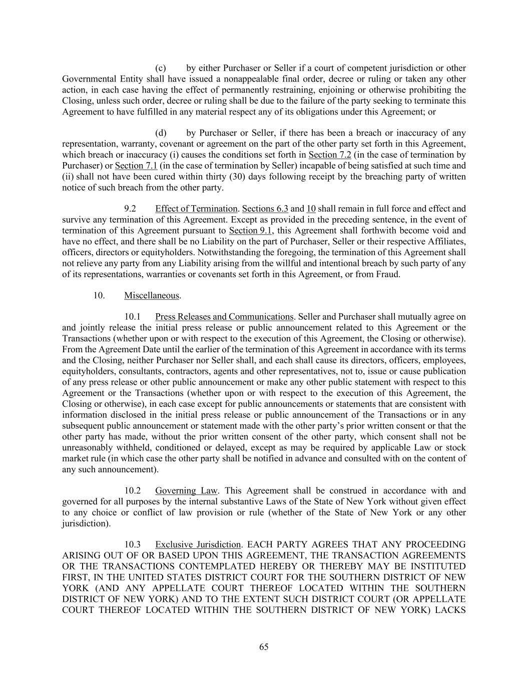 65 (c) by either Purchaser or Seller if a court of competent jurisdiction or other Governmental Entity shall have issued a nonappealable final order, decree or ruling or taken any other action, in each case having the effect of permanently restraining, enjoining or otherwise prohibiting the Closing, unless such order, decree or ruling shall be due to the failure of the party seeking to terminate this Agreement to have fulfilled in any material respect any of its obligations under this Agreement; or (d) by Purchaser or Seller, if there has been a breach or inaccuracy of any representation, warranty, covenant or agreement on the part of the other party set forth in this Agreement, which breach or inaccuracy (i) causes the conditions set forth in Section 7.2 (in the case of termination by Purchaser) or Section 7.1 (in the case of termination by Seller) incapable of being satisfied at such time and (ii) shall not have been cured within thirty (30) days following receipt by the breaching party of written notice of such breach from the other party. 9.2 Effect of Termination. Sections 6.3 and 10 shall remain in full force and effect and survive any termination of this Agreement. Except as provided in the preceding sentence, in the event of termination of this Agreement pursuant to Section 9.1, this Agreement shall forthwith become void and have no effect, and there shall be no Liability on the part of Purchaser, Seller or their respective Affiliates, officers, directors or equityholders. Notwithstanding the foregoing, the termination of this Agreement shall not relieve any party from any Liability arising from the willful and intentional breach by such party of any of its representations, warranties or covenants set forth in this Agreement, or from Fraud. 10. Miscellaneous. 10.1 Press Releases and Communications. Seller and Purchaser shall mutually agree on and jointly release the initial press release or public announcement related to this Agreement or the Transactions (whether upon or with respect to the execution of this Agreement, the Closing or otherwise). From the Agreement Date until the earlier of the termination of this Agreement in accordance with its terms and the Closing, neither Purchaser nor Seller shall, and each shall cause its directors, officers, employees, equityholders, consultants, contractors, agents and other representatives, not to, issue or cause publication of any press release or other public announcement or make any other public statement with respect to this Agreement or the Transactions (whether upon or with respect to the execution of this Agreement, the Closing or otherwise), in each case except for public announcements or statements that are consistent with information disclosed in the initial press release or public announcement of the Transactions or in any subsequent public announcement or statement made with the other party’s prior written consent or that the other party has made, without the prior written consent of the other party, which consent shall not be unreasonably withheld, conditioned or delayed, except as may be required by applicable Law or stock market rule (in which case the other party shall be notified in advance and consulted with on the content of any such announcement). 10.2 Governing Law. This Agreement shall be construed in accordance with and governed for all purposes by the internal substantive Laws of the State of New York without given effect to any choice or conflict of law provision or rule (whether of the State of New York or any other jurisdiction). 10.3 Exclusive Jurisdiction. EACH PARTY AGREES THAT ANY PROCEEDING ARISING OUT OF OR BASED UPON THIS AGREEMENT, THE TRANSACTION AGREEMENTS OR THE TRANSACTIONS CONTEMPLATED HEREBY OR THEREBY MAY BE INSTITUTED FIRST, IN THE UNITED STATES DISTRICT COURT FOR THE SOUTHERN DISTRICT OF NEW YORK (AND ANY APPELLATE COURT THEREOF LOCATED WITHIN THE SOUTHERN DISTRICT OF NEW YORK) AND TO THE EXTENT SUCH DISTRICT COURT (OR APPELLATE COURT THEREOF LOCATED WITHIN THE SOUTHERN DISTRICT OF NEW YORK) LACKS