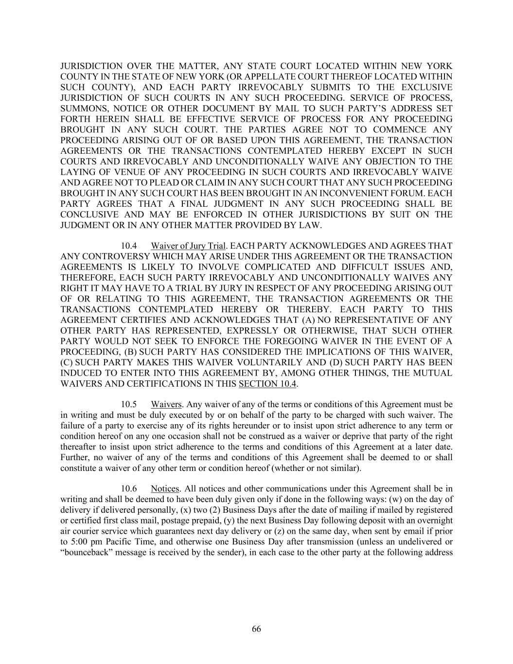 66 JURISDICTION OVER THE MATTER, ANY STATE COURT LOCATED WITHIN NEW YORK COUNTY IN THE STATE OF NEW YORK (OR APPELLATE COURT THEREOF LOCATED WITHIN SUCH COUNTY), AND EACH PARTY IRREVOCABLY SUBMITS TO THE EXCLUSIVE JURISDICTION OF SUCH COURTS IN ANY SUCH PROCEEDING. SERVICE OF PROCESS, SUMMONS, NOTICE OR OTHER DOCUMENT BY MAIL TO SUCH PARTY’S ADDRESS SET FORTH HEREIN SHALL BE EFFECTIVE SERVICE OF PROCESS FOR ANY PROCEEDING BROUGHT IN ANY SUCH COURT. THE PARTIES AGREE NOT TO COMMENCE ANY PROCEEDING ARISING OUT OF OR BASED UPON THIS AGREEMENT, THE TRANSACTION AGREEMENTS OR THE TRANSACTIONS CONTEMPLATED HEREBY EXCEPT IN SUCH COURTS AND IRREVOCABLY AND UNCONDITIONALLY WAIVE ANY OBJECTION TO THE LAYING OF VENUE OF ANY PROCEEDING IN SUCH COURTS AND IRREVOCABLY WAIVE AND AGREE NOT TO PLEAD OR CLAIM IN ANY SUCH COURT THAT ANY SUCH PROCEEDING BROUGHT IN ANY SUCH COURT HAS BEEN BROUGHT IN AN INCONVENIENT FORUM. EACH PARTY AGREES THAT A FINAL JUDGMENT IN ANY SUCH PROCEEDING SHALL BE CONCLUSIVE AND MAY BE ENFORCED IN OTHER JURISDICTIONS BY SUIT ON THE JUDGMENT OR IN ANY OTHER MATTER PROVIDED BY LAW. 10.4 Waiver of Jury Trial. EACH PARTY ACKNOWLEDGES AND AGREES THAT ANY CONTROVERSY WHICH MAY ARISE UNDER THIS AGREEMENT OR THE TRANSACTION AGREEMENTS IS LIKELY TO INVOLVE COMPLICATED AND DIFFICULT ISSUES AND, THEREFORE, EACH SUCH PARTY IRREVOCABLY AND UNCONDITIONALLY WAIVES ANY RIGHT IT MAY HAVE TO A TRIAL BY JURY IN RESPECT OF ANY PROCEEDING ARISING OUT OF OR RELATING TO THIS AGREEMENT, THE TRANSACTION AGREEMENTS OR THE TRANSACTIONS CONTEMPLATED HEREBY OR THEREBY. EACH PARTY TO THIS AGREEMENT CERTIFIES AND ACKNOWLEDGES THAT (A) NO REPRESENTATIVE OF ANY OTHER PARTY HAS REPRESENTED, EXPRESSLY OR OTHERWISE, THAT SUCH OTHER PARTY WOULD NOT SEEK TO ENFORCE THE FOREGOING WAIVER IN THE EVENT OF A PROCEEDING, (B) SUCH PARTY HAS CONSIDERED THE IMPLICATIONS OF THIS WAIVER, (C) SUCH PARTY MAKES THIS WAIVER VOLUNTARILY AND (D) SUCH PARTY HAS BEEN INDUCED TO ENTER INTO THIS AGREEMENT BY, AMONG OTHER THINGS, THE MUTUAL WAIVERS AND CERTIFICATIONS IN THIS SECTION 10.4. 10.5 Waivers. Any waiver of any of the terms or conditions of this Agreement must be in writing and must be duly executed by or on behalf of the party to be charged with such waiver. The failure of a party to exercise any of its rights hereunder or to insist upon strict adherence to any term or condition hereof on any one occasion shall not be construed as a waiver or deprive that party of the right thereafter to insist upon strict adherence to the terms and conditions of this Agreement at a later date. Further, no waiver of any of the terms and conditions of this Agreement shall be deemed to or shall constitute a waiver of any other term or condition hereof (whether or not similar). 10.6 Notices. All notices and other communications under this Agreement shall be in writing and shall be deemed to have been duly given only if done in the following ways: (w) on the day of delivery if delivered personally, (x) two (2) Business Days after the date of mailing if mailed by registered or certified first class mail, postage prepaid, (y) the next Business Day following deposit with an overnight air courier service which guarantees next day delivery or (z) on the same day, when sent by email if prior to 5:00 pm Pacific Time, and otherwise one Business Day after transmission (unless an undelivered or “bounceback” message is received by the sender), in each case to the other party at the following address