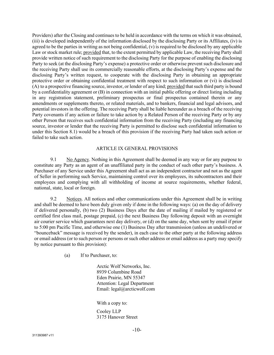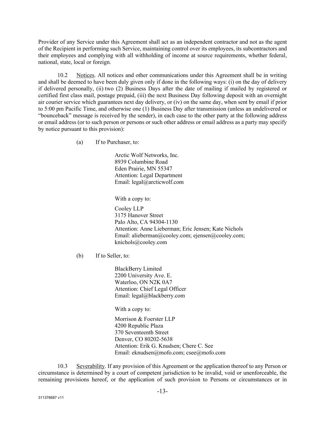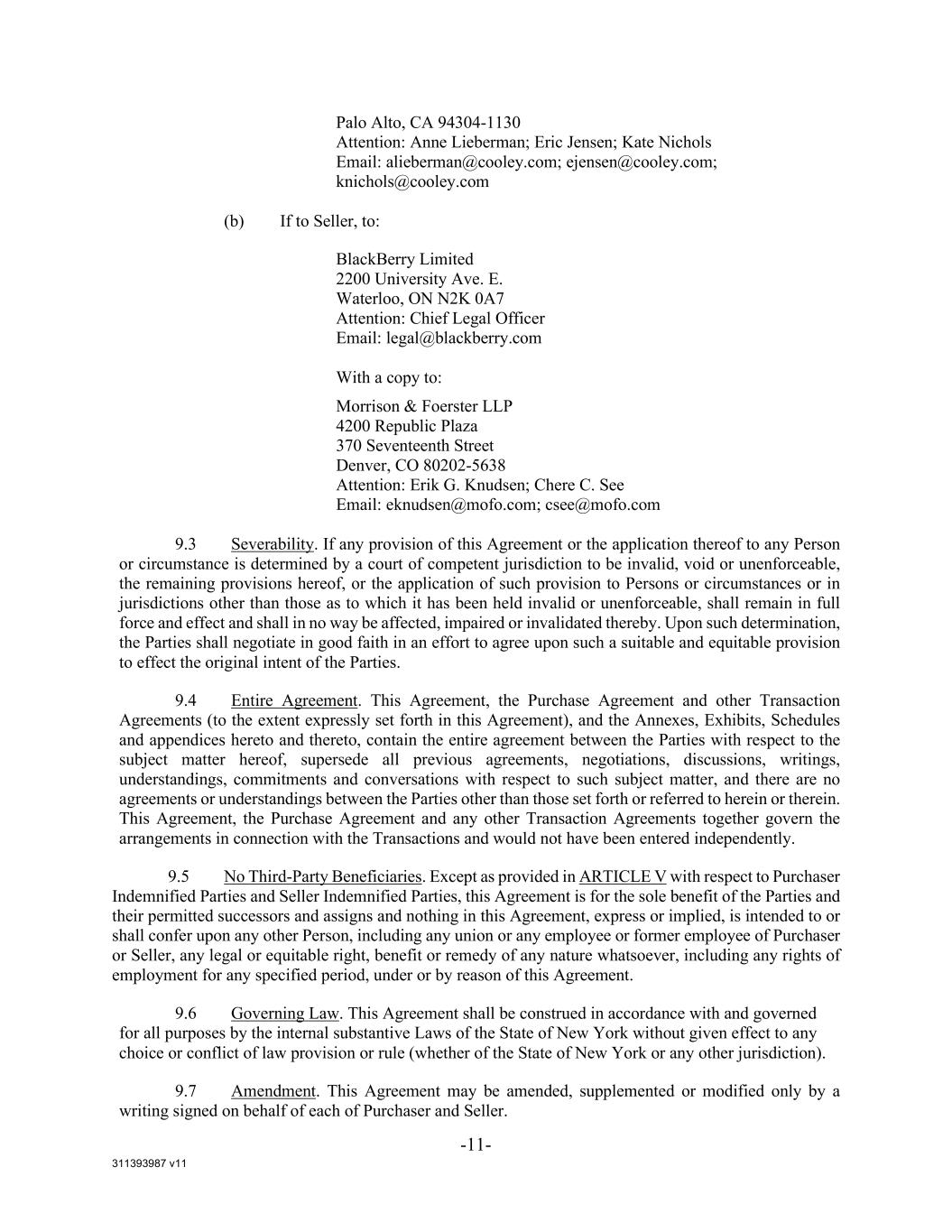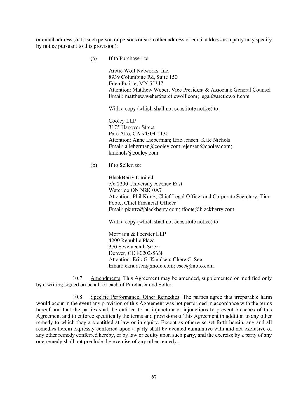 67 or email address (or to such person or persons or such other address or email address as a party may specify by notice pursuant to this provision): (a) If to Purchaser, to: Arctic Wolf Networks, Inc. 8939 Columbine Rd, Suite 150 Eden Prairie, MN 55347 Attention: Matthew Weber, Vice President & Associate General Counsel Email: matthew.weber@arcticwolf.com; legal@arcticwolf.com With a copy (which shall not constitute notice) to: Cooley LLP 3175 Hanover Street Palo Alto, CA 94304-1130 Attention: Anne Lieberman; Eric Jensen; Kate Nichols Email: alieberman@cooley.com; ejensen@cooley.com; knichols@cooley.com (b) If to Seller, to: BlackBerry Limited c/o 2200 University Avenue East Waterloo ON N2K 0A7 Attention: Phil Kurtz, Chief Legal Officer and Corporate Secretary; Tim Foote, Chief Financial Officer Email: pkurtz@blackberry.com; tfoote@blackberry.com With a copy (which shall not constitute notice) to: Morrison & Foerster LLP 4200 Republic Plaza 370 Seventeenth Street Denver, CO 80202-5638 Attention: Erik G. Knudsen; Chere C. See Email: eknudsen@mofo.com; csee@mofo.com 10.7 Amendments. This Agreement may be amended, supplemented or modified only by a writing signed on behalf of each of Purchaser and Seller. 10.8 Specific Performance; Other Remedies. The parties agree that irreparable harm would occur in the event any provision of this Agreement was not performed in accordance with the terms hereof and that the parties shall be entitled to an injunction or injunctions to prevent breaches of this Agreement and to enforce specifically the terms and provisions of this Agreement in addition to any other remedy to which they are entitled at law or in equity. Except as otherwise set forth herein, any and all remedies herein expressly conferred upon a party shall be deemed cumulative with and not exclusive of any other remedy conferred hereby, or by law or equity upon such party, and the exercise by a party of any one remedy shall not preclude the exercise of any other remedy.