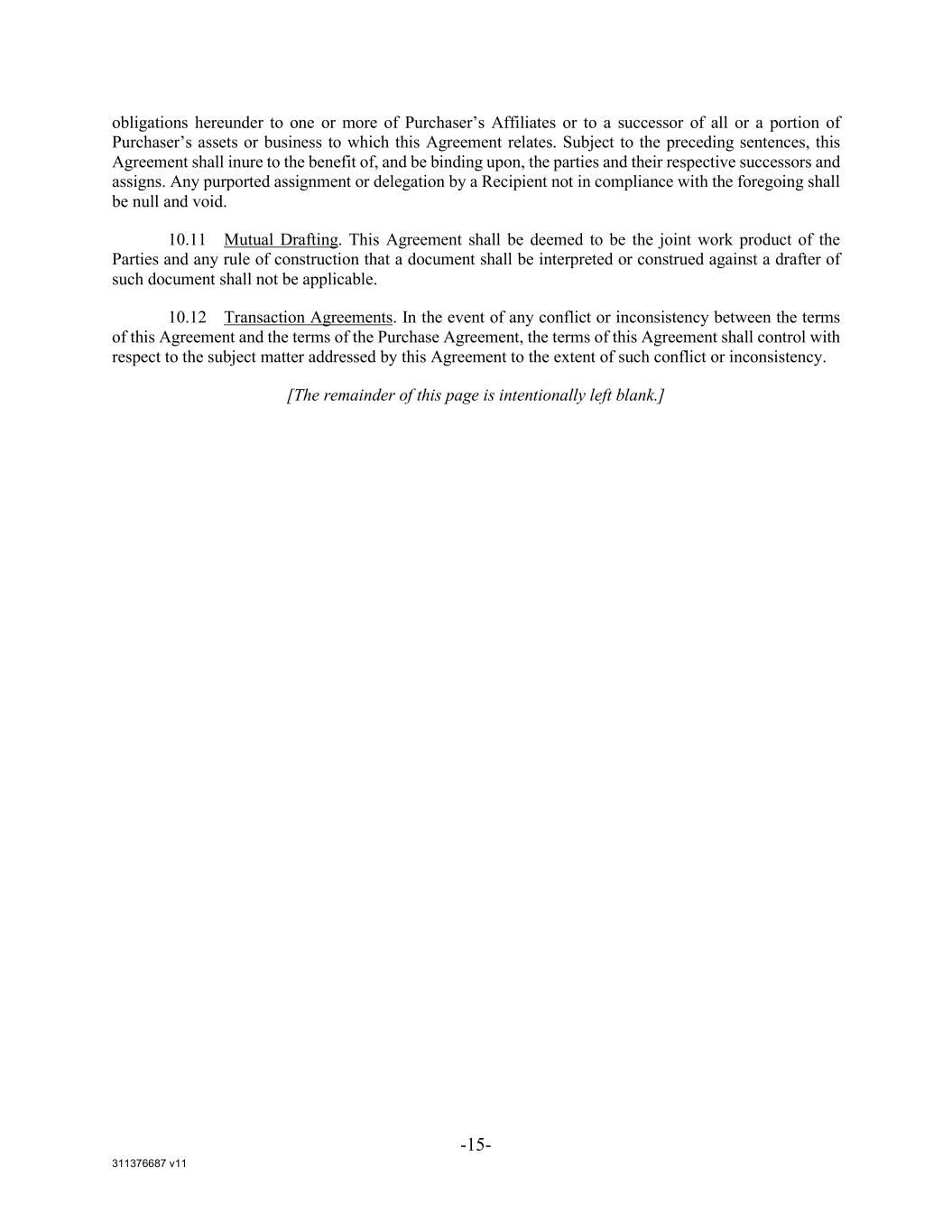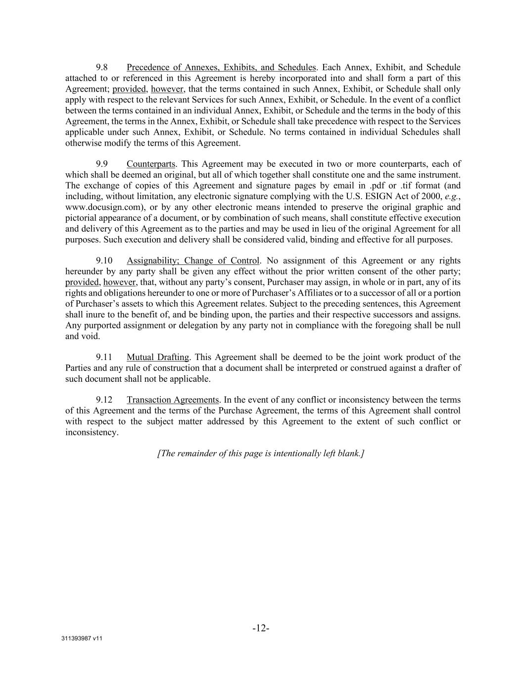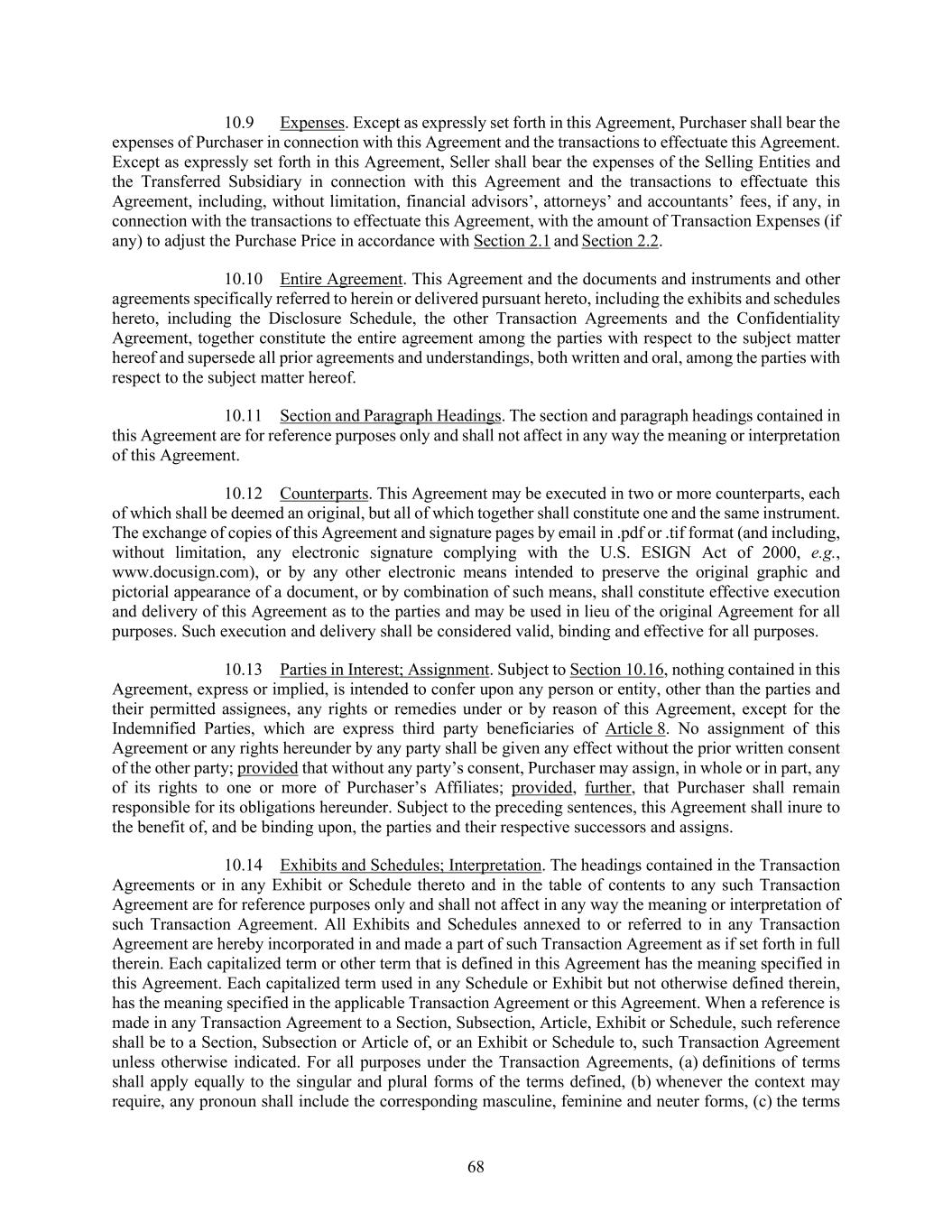 68 10.9 Expenses. Except as expressly set forth in this Agreement, Purchaser shall bear the expenses of Purchaser in connection with this Agreement and the transactions to effectuate this Agreement. Except as expressly set forth in this Agreement, Seller shall bear the expenses of the Selling Entities and the Transferred Subsidiary in connection with this Agreement and the transactions to effectuate this Agreement, including, without limitation, financial advisors’, attorneys’ and accountants’ fees, if any, in connection with the transactions to effectuate this Agreement, with the amount of Transaction Expenses (if any) to adjust the Purchase Price in accordance with Section 2.1 and Section 2.2. 10.10 Entire Agreement. This Agreement and the documents and instruments and other agreements specifically referred to herein or delivered pursuant hereto, including the exhibits and schedules hereto, including the Disclosure Schedule, the other Transaction Agreements and the Confidentiality Agreement, together constitute the entire agreement among the parties with respect to the subject matter hereof and supersede all prior agreements and understandings, both written and oral, among the parties with respect to the subject matter hereof. 10.11 Section and Paragraph Headings. The section and paragraph headings contained in this Agreement are for reference purposes only and shall not affect in any way the meaning or interpretation of this Agreement. 10.12 Counterparts. This Agreement may be executed in two or more counterparts, each of which shall be deemed an original, but all of which together shall constitute one and the same instrument. The exchange of copies of this Agreement and signature pages by email in .pdf or .tif format (and including, without limitation, any electronic signature complying with the U.S. ESIGN Act of 2000, e.g., www.docusign.com), or by any other electronic means intended to preserve the original graphic and pictorial appearance of a document, or by combination of such means, shall constitute effective execution and delivery of this Agreement as to the parties and may be used in lieu of the original Agreement for all purposes. Such execution and delivery shall be considered valid, binding and effective for all purposes. 10.13 Parties in Interest; Assignment. Subject to Section 10.16, nothing contained in this Agreement, express or implied, is intended to confer upon any person or entity, other than the parties and their permitted assignees, any rights or remedies under or by reason of this Agreement, except for the Indemnified Parties, which are express third party beneficiaries of Article 8. No assignment of this Agreement or any rights hereunder by any party shall be given any effect without the prior written consent of the other party; provided that without any party’s consent, Purchaser may assign, in whole or in part, any of its rights to one or more of Purchaser’s Affiliates; provided, further, that Purchaser shall remain responsible for its obligations hereunder. Subject to the preceding sentences, this Agreement shall inure to the benefit of, and be binding upon, the parties and their respective successors and assigns. 10.14 Exhibits and Schedules; Interpretation. The headings contained in the Transaction Agreements or in any Exhibit or Schedule thereto and in the table of contents to any such Transaction Agreement are for reference purposes only and shall not affect in any way the meaning or interpretation of such Transaction Agreement. All Exhibits and Schedules annexed to or referred to in any Transaction Agreement are hereby incorporated in and made a part of such Transaction Agreement as if set forth in full therein. Each capitalized term or other term that is defined in this Agreement has the meaning specified in this Agreement. Each capitalized term used in any Schedule or Exhibit but not otherwise defined therein, has the meaning specified in the applicable Transaction Agreement or this Agreement. When a reference is made in any Transaction Agreement to a Section, Subsection, Article, Exhibit or Schedule, such reference shall be to a Section, Subsection or Article of, or an Exhibit or Schedule to, such Transaction Agreement unless otherwise indicated. For all purposes under the Transaction Agreements, (a) definitions of terms shall apply equally to the singular and plural forms of the terms defined, (b) whenever the context may require, any pronoun shall include the corresponding masculine, feminine and neuter forms, (c) the terms