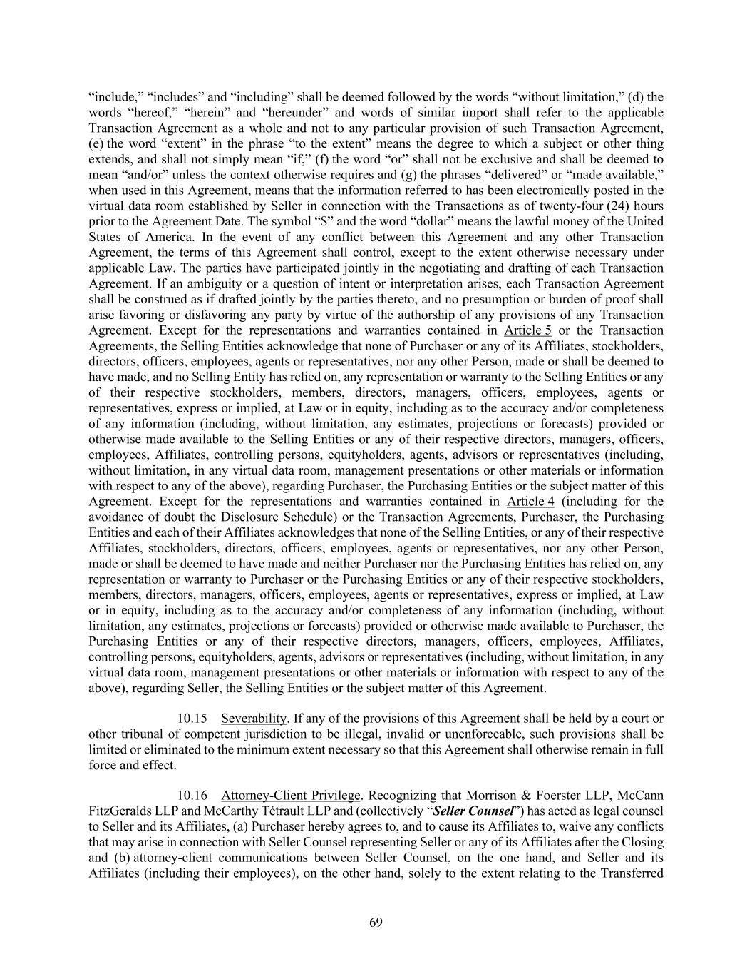 69 “include,” “includes” and “including” shall be deemed followed by the words “without limitation,” (d) the words “hereof,” “herein” and “hereunder” and words of similar import shall refer to the applicable Transaction Agreement as a whole and not to any particular provision of such Transaction Agreement, (e) the word “extent” in the phrase “to the extent” means the degree to which a subject or other thing extends, and shall not simply mean “if,” (f) the word “or” shall not be exclusive and shall be deemed to mean “and/or” unless the context otherwise requires and (g) the phrases “delivered” or “made available,” when used in this Agreement, means that the information referred to has been electronically posted in the virtual data room established by Seller in connection with the Transactions as of twenty-four (24) hours prior to the Agreement Date. The symbol “$” and the word “dollar” means the lawful money of the United States of America. In the event of any conflict between this Agreement and any other Transaction Agreement, the terms of this Agreement shall control, except to the extent otherwise necessary under applicable Law. The parties have participated jointly in the negotiating and drafting of each Transaction Agreement. If an ambiguity or a question of intent or interpretation arises, each Transaction Agreement shall be construed as if drafted jointly by the parties thereto, and no presumption or burden of proof shall arise favoring or disfavoring any party by virtue of the authorship of any provisions of any Transaction Agreement. Except for the representations and warranties contained in Article 5 or the Transaction Agreements, the Selling Entities acknowledge that none of Purchaser or any of its Affiliates, stockholders, directors, officers, employees, agents or representatives, nor any other Person, made or shall be deemed to have made, and no Selling Entity has relied on, any representation or warranty to the Selling Entities or any of their respective stockholders, members, directors, managers, officers, employees, agents or representatives, express or implied, at Law or in equity, including as to the accuracy and/or completeness of any information (including, without limitation, any estimates, projections or forecasts) provided or otherwise made available to the Selling Entities or any of their respective directors, managers, officers, employees, Affiliates, controlling persons, equityholders, agents, advisors or representatives (including, without limitation, in any virtual data room, management presentations or other materials or information with respect to any of the above), regarding Purchaser, the Purchasing Entities or the subject matter of this Agreement. Except for the representations and warranties contained in Article 4 (including for the avoidance of doubt the Disclosure Schedule) or the Transaction Agreements, Purchaser, the Purchasing Entities and each of their Affiliates acknowledges that none of the Selling Entities, or any of their respective Affiliates, stockholders, directors, officers, employees, agents or representatives, nor any other Person, made or shall be deemed to have made and neither Purchaser nor the Purchasing Entities has relied on, any representation or warranty to Purchaser or the Purchasing Entities or any of their respective stockholders, members, directors, managers, officers, employees, agents or representatives, express or implied, at Law or in equity, including as to the accuracy and/or completeness of any information (including, without limitation, any estimates, projections or forecasts) provided or otherwise made available to Purchaser, the Purchasing Entities or any of their respective directors, managers, officers, employees, Affiliates, controlling persons, equityholders, agents, advisors or representatives (including, without limitation, in any virtual data room, management presentations or other materials or information with respect to any of the above), regarding Seller, the Selling Entities or the subject matter of this Agreement. 10.15 Severability. If any of the provisions of this Agreement shall be held by a court or other tribunal of competent jurisdiction to be illegal, invalid or unenforceable, such provisions shall be limited or eliminated to the minimum extent necessary so that this Agreement shall otherwise remain in full force and effect. 10.16 Attorney-Client Privilege. Recognizing that Morrison & Foerster LLP, McCann FitzGeralds LLP and McCarthy Tétrault LLP and (collectively “Seller Counsel”) has acted as legal counsel to Seller and its Affiliates, (a) Purchaser hereby agrees to, and to cause its Affiliates to, waive any conflicts that may arise in connection with Seller Counsel representing Seller or any of its Affiliates after the Closing and (b) attorney-client communications between Seller Counsel, on the one hand, and Seller and its Affiliates (including their employees), on the other hand, solely to the extent relating to the Transferred