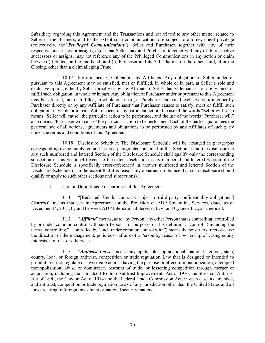 70 Subsidiary regarding this Agreement and the Transactions and not related to any other matter related to Seller or the Business, and to the extent such communications are subject to attorney-client privilege (collectively, the “Privileged Communications”), Seller and Purchaser, together with any of their respective successors or assigns, agree that Seller may and Purchaser, together with any of its respective successors or assigns, may not reference any of the Privileged Communications in any action or claim between (i) Seller, on the one hand, and (ii) Purchaser and its Subsidiaries, on the other hand, after the Closing, other than a claim alleging Fraud. 10.17 Performance of Obligations by Affiliates. Any obligation of Seller under or pursuant to this Agreement may be satisfied, met or fulfilled, in whole or in part, at Seller’s sole and exclusive option, either by Seller directly or by any Affiliate of Seller that Seller causes to satisfy, meet or fulfill such obligation, in whole or in part. Any obligation of Purchaser under or pursuant to this Agreement may be satisfied, met or fulfilled, in whole or in part, at Purchaser’s sole and exclusive option, either by Purchaser directly or by any Affiliate of Purchaser that Purchaser causes to satisfy, meet or fulfill such obligation, in whole or in part. With respect to any particular action, the use of the words “Seller will” also means “Seller will cause” the particular action to be performed, and the use of the words “Purchaser will” also means “Purchaser will cause” the particular action to be performed. Each of the parties guarantees the performance of all actions, agreements and obligations to be performed by any Affiliates of such party under the terms and conditions of this Agreement. 10.18 Disclosure Schedule. The Disclosure Schedule will be arranged in paragraphs corresponding to the numbered and lettered paragraphs contained in this Section 4; and the disclosure in any such numbered and lettered Section of the Disclosure Schedule shall qualify only the corresponding subsection in this Section 4 (except to the extent disclosure in any numbered and lettered Section of the Disclosure Schedule is specifically cross-referenced in another numbered and lettered Section of the Disclosure Schedule or to the extent that it is reasonably apparent on its face that such disclosure should qualify or apply to such other sections and subsections). 11. Certain Definitions. For purposes of this Agreement: 11.1 “[Redacted: Vendor contracts subject to third party confidentiality obligations.] Contract” means that certain Agreement for the Provision of ADP Streamline Services, dated as of December 14, 2015, by and between ADP International Services B.V. and Cylance Inc., as amended. 11.2 “Affiliate” means, as to any Person, any other Person that is controlling, controlled by or under common control with such Person. For purposes of this definition, “control” (including the terms “controlling,” “controlled by” and “under common control with”) means the power to direct or cause the direction of the management, policies or affairs of a Person by reason of ownership of voting equity interests, contract or otherwise. 11.3 “Antitrust Laws” means any applicable supranational, national, federal, state, county, local or foreign antitrust, competition or trade regulation Law that is designed or intended to prohibit, restrict, regulate or investigate actions having the purpose or effect of monopolization, attempted monopolization, abuse of dominance, restraint of trade, or lessening competition through merger or acquisition, including the Hart-Scott-Rodino Antitrust Improvements Act of 1976, the Sherman Antitrust Act of 1890, the Clayton Act of 1914 and the Federal Trade Commission Act, in each case, as amended, and antitrust, competition or trade regulation Laws of any jurisdiction other than the United States and all Laws relating to foreign investment or national security matters.