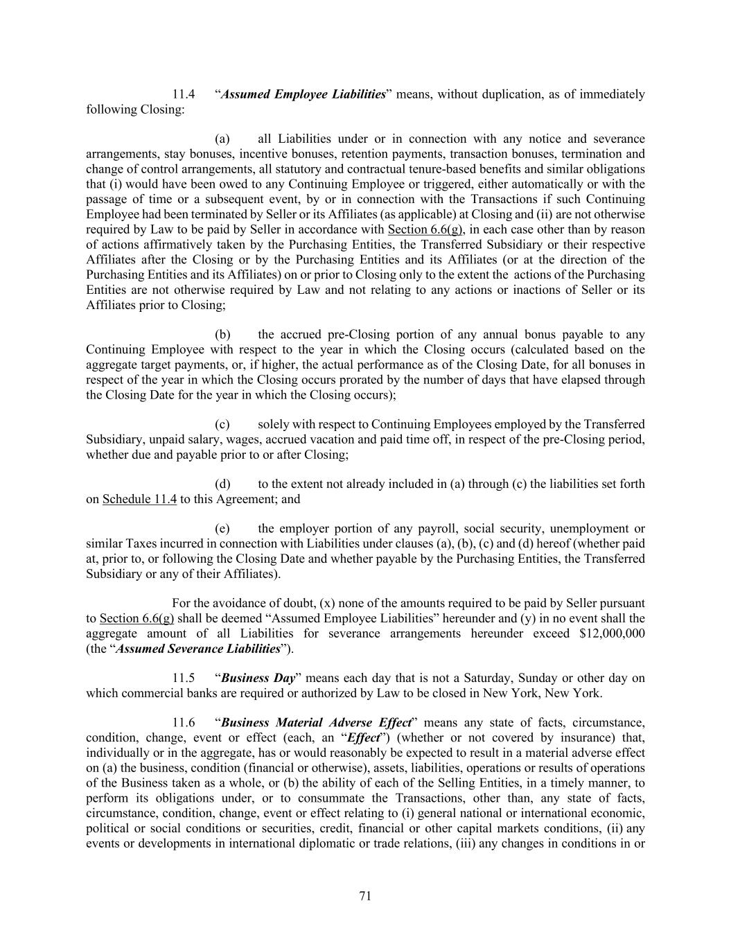 71 11.4 “Assumed Employee Liabilities” means, without duplication, as of immediately following Closing: (a) all Liabilities under or in connection with any notice and severance arrangements, stay bonuses, incentive bonuses, retention payments, transaction bonuses, termination and change of control arrangements, all statutory and contractual tenure-based benefits and similar obligations that (i) would have been owed to any Continuing Employee or triggered, either automatically or with the passage of time or a subsequent event, by or in connection with the Transactions if such Continuing Employee had been terminated by Seller or its Affiliates (as applicable) at Closing and (ii) are not otherwise required by Law to be paid by Seller in accordance with Section 6.6(g), in each case other than by reason of actions affirmatively taken by the Purchasing Entities, the Transferred Subsidiary or their respective Affiliates after the Closing or by the Purchasing Entities and its Affiliates (or at the direction of the Purchasing Entities and its Affiliates) on or prior to Closing only to the extent the actions of the Purchasing Entities are not otherwise required by Law and not relating to any actions or inactions of Seller or its Affiliates prior to Closing; (b) the accrued pre-Closing portion of any annual bonus payable to any Continuing Employee with respect to the year in which the Closing occurs (calculated based on the aggregate target payments, or, if higher, the actual performance as of the Closing Date, for all bonuses in respect of the year in which the Closing occurs prorated by the number of days that have elapsed through the Closing Date for the year in which the Closing occurs); (c) solely with respect to Continuing Employees employed by the Transferred Subsidiary, unpaid salary, wages, accrued vacation and paid time off, in respect of the pre-Closing period, whether due and payable prior to or after Closing; (d) to the extent not already included in (a) through (c) the liabilities set forth on Schedule 11.4 to this Agreement; and (e) the employer portion of any payroll, social security, unemployment or similar Taxes incurred in connection with Liabilities under clauses (a), (b), (c) and (d) hereof (whether paid at, prior to, or following the Closing Date and whether payable by the Purchasing Entities, the Transferred Subsidiary or any of their Affiliates). For the avoidance of doubt, (x) none of the amounts required to be paid by Seller pursuant to Section 6.6(g) shall be deemed “Assumed Employee Liabilities” hereunder and (y) in no event shall the aggregate amount of all Liabilities for severance arrangements hereunder exceed $12,000,000 (the “Assumed Severance Liabilities”). 11.5 “Business Day” means each day that is not a Saturday, Sunday or other day on which commercial banks are required or authorized by Law to be closed in New York, New York. 11.6 “Business Material Adverse Effect” means any state of facts, circumstance, condition, change, event or effect (each, an “Effect”) (whether or not covered by insurance) that, individually or in the aggregate, has or would reasonably be expected to result in a material adverse effect on (a) the business, condition (financial or otherwise), assets, liabilities, operations or results of operations of the Business taken as a whole, or (b) the ability of each of the Selling Entities, in a timely manner, to perform its obligations under, or to consummate the Transactions, other than, any state of facts, circumstance, condition, change, event or effect relating to (i) general national or international economic, political or social conditions or securities, credit, financial or other capital markets conditions, (ii) any events or developments in international diplomatic or trade relations, (iii) any changes in conditions in or