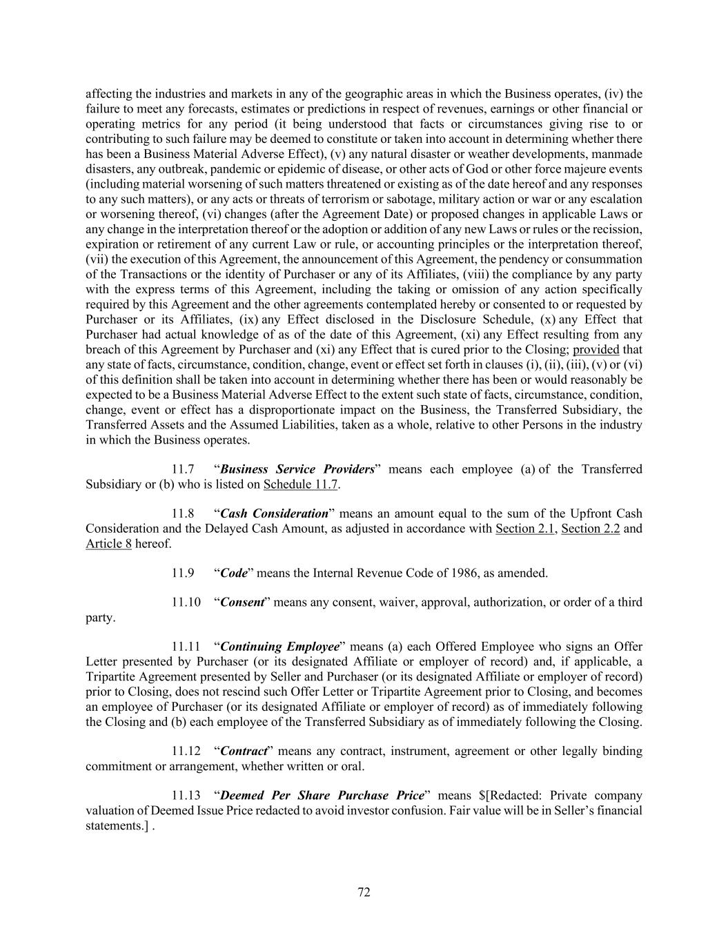 72 affecting the industries and markets in any of the geographic areas in which the Business operates, (iv) the failure to meet any forecasts, estimates or predictions in respect of revenues, earnings or other financial or operating metrics for any period (it being understood that facts or circumstances giving rise to or contributing to such failure may be deemed to constitute or taken into account in determining whether there has been a Business Material Adverse Effect), (v) any natural disaster or weather developments, manmade disasters, any outbreak, pandemic or epidemic of disease, or other acts of God or other force majeure events (including material worsening of such matters threatened or existing as of the date hereof and any responses to any such matters), or any acts or threats of terrorism or sabotage, military action or war or any escalation or worsening thereof, (vi) changes (after the Agreement Date) or proposed changes in applicable Laws or any change in the interpretation thereof or the adoption or addition of any new Laws or rules or the recission, expiration or retirement of any current Law or rule, or accounting principles or the interpretation thereof, (vii) the execution of this Agreement, the announcement of this Agreement, the pendency or consummation of the Transactions or the identity of Purchaser or any of its Affiliates, (viii) the compliance by any party with the express terms of this Agreement, including the taking or omission of any action specifically required by this Agreement and the other agreements contemplated hereby or consented to or requested by Purchaser or its Affiliates, (ix) any Effect disclosed in the Disclosure Schedule, (x) any Effect that Purchaser had actual knowledge of as of the date of this Agreement, (xi) any Effect resulting from any breach of this Agreement by Purchaser and (xi) any Effect that is cured prior to the Closing; provided that any state of facts, circumstance, condition, change, event or effect set forth in clauses (i), (ii), (iii), (v) or (vi) of this definition shall be taken into account in determining whether there has been or would reasonably be expected to be a Business Material Adverse Effect to the extent such state of facts, circumstance, condition, change, event or effect has a disproportionate impact on the Business, the Transferred Subsidiary, the Transferred Assets and the Assumed Liabilities, taken as a whole, relative to other Persons in the industry in which the Business operates. 11.7 “Business Service Providers” means each employee (a) of the Transferred Subsidiary or (b) who is listed on Schedule 11.7. 11.8 “Cash Consideration” means an amount equal to the sum of the Upfront Cash Consideration and the Delayed Cash Amount, as adjusted in accordance with Section 2.1, Section 2.2 and Article 8 hereof. 11.9 “Code” means the Internal Revenue Code of 1986, as amended. 11.10 “Consent” means any consent, waiver, approval, authorization, or order of a third party. 11.11 “Continuing Employee” means (a) each Offered Employee who signs an Offer Letter presented by Purchaser (or its designated Affiliate or employer of record) and, if applicable, a Tripartite Agreement presented by Seller and Purchaser (or its designated Affiliate or employer of record) prior to Closing, does not rescind such Offer Letter or Tripartite Agreement prior to Closing, and becomes an employee of Purchaser (or its designated Affiliate or employer of record) as of immediately following the Closing and (b) each employee of the Transferred Subsidiary as of immediately following the Closing. 11.12 “Contract” means any contract, instrument, agreement or other legally binding commitment or arrangement, whether written or oral. 11.13 “Deemed Per Share Purchase Price” means $[Redacted: Private company valuation of Deemed Issue Price redacted to avoid investor confusion. Fair value will be in Seller’s financial statements.] .