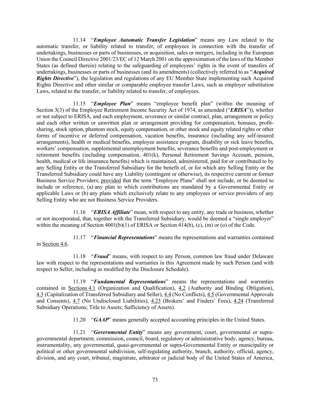 73 11.14 “Employee Automatic Transfer Legislation” means any Law related to the automatic transfer, or liability related to transfer, of employees in connection with the transfer of undertakings, businesses or parts of businesses, or acquisition, sales or mergers, including in the European Union the Council Directive 2001/23/EC of 12 March 2001 on the approximation of the laws of the Member States (as defined therein) relating to the safeguarding of employees’ rights in the event of transfers of undertakings, businesses or parts of businesses (and its amendments) (collectively referred to as “Acquired Rights Directive”), the legislation and regulations of any EU Member State implementing such Acquired Rights Directive and other similar or comparable employee transfer Laws, such as employer substitution Laws, related to the transfer, or liability related to transfer, of employees. 11.15 “Employee Plan” means “employee benefit plan” (within the meaning of Section 3(3) of the Employee Retirement Income Security Act of 1974, as amended (“ERISA”)), whether or not subject to ERISA, and each employment, severance or similar contract, plan, arrangement or policy and each other written or unwritten plan or arrangement providing for compensation, bonuses, profit- sharing, stock option, phantom stock, equity compensation, or other stock and equity related rights or other forms of incentive or deferred compensation, vacation benefits, insurance (including any self-insured arrangements), health or medical benefits, employee assistance program, disability or sick leave benefits, workers’ compensation, supplemental unemployment benefits, severance benefits and post-employment or retirement benefits (including compensation, 401(k), Personal Retirement Savings Account, pension, health, medical or life insurance benefits) which is maintained, administered, paid for or contributed to by any Selling Entity or the Transferred Subsidiary for the benefit of, or for which any Selling Entity or the Transferred Subsidiary could have any Liability (contingent or otherwise), its respective current or former Business Service Providers; provided that the term “Employee Plans” shall not include, or be deemed to include or reference, (a) any plan to which contributions are mandated by a Governmental Entity or applicable Laws or (b) any plans which exclusively relate to any employees or service providers of any Selling Entity who are not Business Service Providers. 11.16 “ERISA Affiliate” mean, with respect to any entity, any trade or business, whether or not incorporated, that, together with the Transferred Subsidiary, would be deemed a “single employer” within the meaning of Section 4001(b)(1) of ERISA or Section 414(b), (c), (m) or (o) of the Code. 11.17 “Financial Representations” means the representations and warranties contained in Section 4.6. 11.18 “Fraud” means, with respect to any Person, common law fraud under Delaware law with respect to the representations and warranties in this Agreement made by such Person (and with respect to Seller, including as modified by the Disclosure Schedule). 11.19 “Fundamental Representations” means the representations and warranties contained in Sections 4.1 (Organization and Qualification), 4.2 (Authority and Binding Obligation), 4.3 (Capitalization of Transferred Subsidiary and Seller), 4.4 (No Conflicts), 4.5 (Governmental Approvals and Consents), 4.7 (No Undisclosed Liabilities), 4.23 (Brokers’ and Finders’ Fees), 4.24 (Transferred Subsidiary Operations; Title to Assets; Sufficiency of Assets). 11.20 “GAAP” means generally accepted accounting principles in the United States. 11.21 “Governmental Entity” means any government, court, governmental or supra- governmental department, commission, council, board, regulatory or administrative body, agency, bureau, instrumentality, any governmental, quasi-governmental or supra-Governmental Entity or municipality or political or other governmental subdivision, self-regulating authority, branch, authority, official, agency, division, and any court, tribunal, magistrate, arbitrator or judicial body of the United States of America,