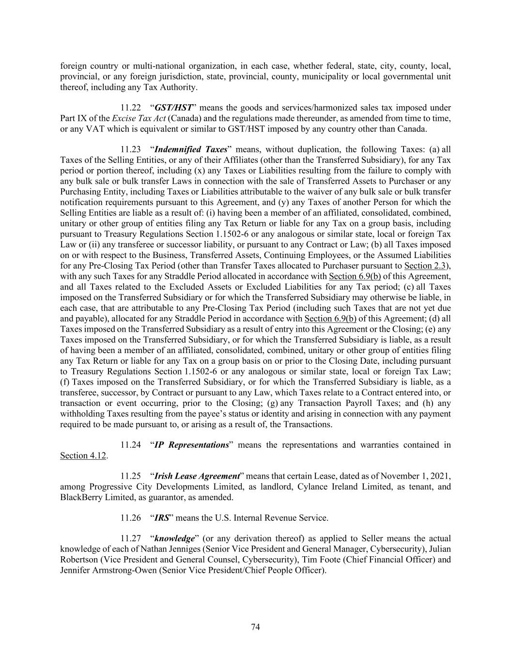 74 foreign country or multi-national organization, in each case, whether federal, state, city, county, local, provincial, or any foreign jurisdiction, state, provincial, county, municipality or local governmental unit thereof, including any Tax Authority. 11.22 “GST/HST” means the goods and services/harmonized sales tax imposed under Part IX of the Excise Tax Act (Canada) and the regulations made thereunder, as amended from time to time, or any VAT which is equivalent or similar to GST/HST imposed by any country other than Canada. 11.23 “Indemnified Taxes” means, without duplication, the following Taxes: (a) all Taxes of the Selling Entities, or any of their Affiliates (other than the Transferred Subsidiary), for any Tax period or portion thereof, including (x) any Taxes or Liabilities resulting from the failure to comply with any bulk sale or bulk transfer Laws in connection with the sale of Transferred Assets to Purchaser or any Purchasing Entity, including Taxes or Liabilities attributable to the waiver of any bulk sale or bulk transfer notification requirements pursuant to this Agreement, and (y) any Taxes of another Person for which the Selling Entities are liable as a result of: (i) having been a member of an affiliated, consolidated, combined, unitary or other group of entities filing any Tax Return or liable for any Tax on a group basis, including pursuant to Treasury Regulations Section 1.1502-6 or any analogous or similar state, local or foreign Tax Law or (ii) any transferee or successor liability, or pursuant to any Contract or Law; (b) all Taxes imposed on or with respect to the Business, Transferred Assets, Continuing Employees, or the Assumed Liabilities for any Pre-Closing Tax Period (other than Transfer Taxes allocated to Purchaser pursuant to Section 2.3), with any such Taxes for any Straddle Period allocated in accordance with Section 6.9(b) of this Agreement, and all Taxes related to the Excluded Assets or Excluded Liabilities for any Tax period; (c) all Taxes imposed on the Transferred Subsidiary or for which the Transferred Subsidiary may otherwise be liable, in each case, that are attributable to any Pre-Closing Tax Period (including such Taxes that are not yet due and payable), allocated for any Straddle Period in accordance with Section 6.9(b) of this Agreement; (d) all Taxes imposed on the Transferred Subsidiary as a result of entry into this Agreement or the Closing; (e) any Taxes imposed on the Transferred Subsidiary, or for which the Transferred Subsidiary is liable, as a result of having been a member of an affiliated, consolidated, combined, unitary or other group of entities filing any Tax Return or liable for any Tax on a group basis on or prior to the Closing Date, including pursuant to Treasury Regulations Section 1.1502-6 or any analogous or similar state, local or foreign Tax Law; (f) Taxes imposed on the Transferred Subsidiary, or for which the Transferred Subsidiary is liable, as a transferee, successor, by Contract or pursuant to any Law, which Taxes relate to a Contract entered into, or transaction or event occurring, prior to the Closing; (g) any Transaction Payroll Taxes; and (h) any withholding Taxes resulting from the payee’s status or identity and arising in connection with any payment required to be made pursuant to, or arising as a result of, the Transactions. 11.24 “IP Representations” means the representations and warranties contained in Section 4.12. 11.25 “Irish Lease Agreement” means that certain Lease, dated as of November 1, 2021, among Progressive City Developments Limited, as landlord, Cylance Ireland Limited, as tenant, and BlackBerry Limited, as guarantor, as amended. 11.26 “IRS” means the U.S. Internal Revenue Service. 11.27 “knowledge” (or any derivation thereof) as applied to Seller means the actual knowledge of each of Nathan Jenniges (Senior Vice President and General Manager, Cybersecurity), Julian Robertson (Vice President and General Counsel, Cybersecurity), Tim Foote (Chief Financial Officer) and Jennifer Armstrong-Owen (Senior Vice President/Chief People Officer).