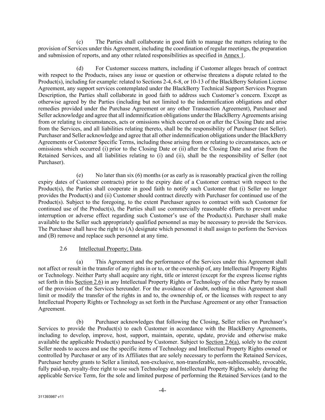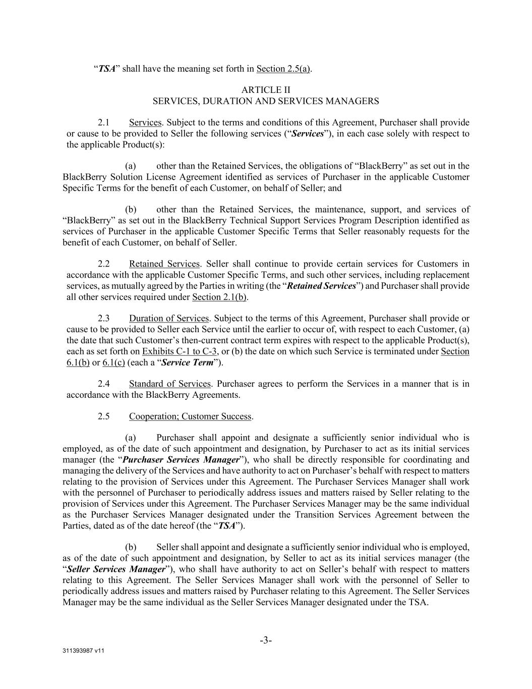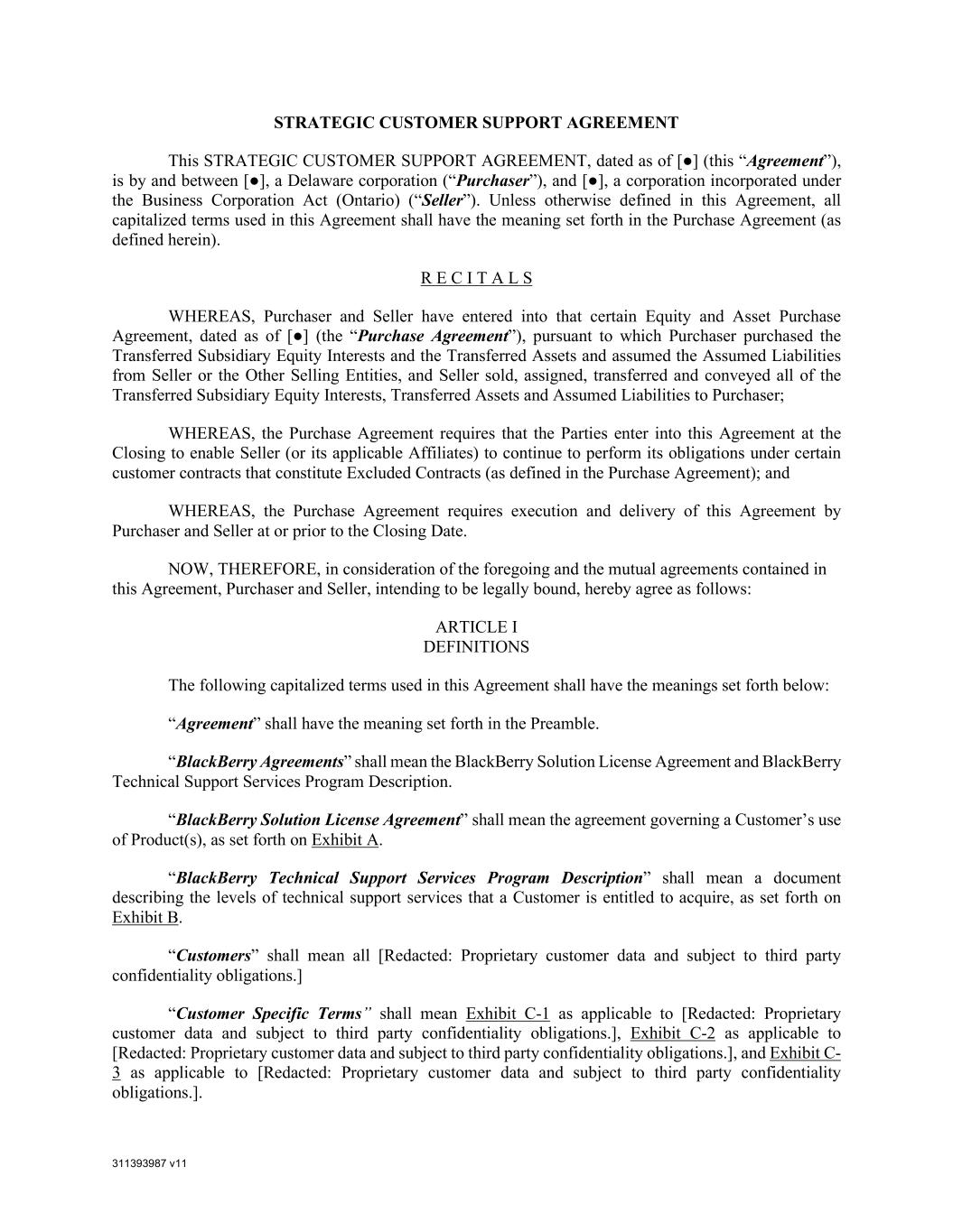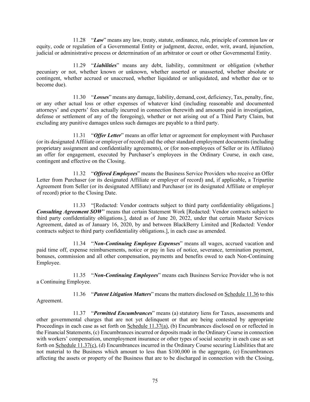 75 11.28 “Law” means any law, treaty, statute, ordinance, rule, principle of common law or equity, code or regulation of a Governmental Entity or judgment, decree, order, writ, award, injunction, judicial or administrative process or determination of an arbitrator or court or other Governmental Entity. 11.29 “Liabilities” means any debt, liability, commitment or obligation (whether pecuniary or not, whether known or unknown, whether asserted or unasserted, whether absolute or contingent, whether accrued or unaccrued, whether liquidated or unliquidated, and whether due or to become due). 11.30 “Losses” means any damage, liability, demand, cost, deficiency, Tax, penalty, fine, or any other actual loss or other expenses of whatever kind (including reasonable and documented attorneys’ and experts’ fees actually incurred in connection therewith and amounts paid in investigation, defense or settlement of any of the foregoing), whether or not arising out of a Third Party Claim, but excluding any punitive damages unless such damages are payable to a third party. 11.31 “Offer Letter” means an offer letter or agreement for employment with Purchaser (or its designated Affiliate or employer of record) and the other standard employment documents (including proprietary assignment and confidentiality agreements), or (for non-employees of Seller or its Affiliates) an offer for engagement, executed by Purchaser’s employees in the Ordinary Course, in each case, contingent and effective on the Closing. 11.32 “Offered Employees” means the Business Service Providers who receive an Offer Letter from Purchaser (or its designated Affiliate or employer of record) and, if applicable, a Tripartite Agreement from Seller (or its designated Affiliate) and Purchaser (or its designated Affiliate or employer of record) prior to the Closing Date. 11.33 “[Redacted: Vendor contracts subject to third party confidentiality obligations.] Consulting Agreement SOW” means that certain Statement Work [Redacted: Vendor contracts subject to third party confidentiality obligations.], dated as of June 20, 2022, under that certain Master Services Agreement, dated as of January 16, 2020, by and between BlackBerry Limited and [Redacted: Vendor contracts subject to third party confidentiality obligations.], in each case as amended. 11.34 “Non-Continuing Employee Expenses” means all wages, accrued vacation and paid time off, expense reimbursements, notice or pay in lieu of notice, severance, termination payment, bonuses, commission and all other compensation, payments and benefits owed to each Non-Continuing Employee. 11.35 “Non-Continuing Employees” means each Business Service Provider who is not a Continuing Employee. 11.36 “Patent Litigation Matters” means the matters disclosed on Schedule 11.36 to this Agreement. 11.37 “Permitted Encumbrances” means (a) statutory liens for Taxes, assessments and other governmental charges that are not yet delinquent or that are being contested by appropriate Proceedings in each case as set forth on Schedule 11.37(a), (b) Encumbrances disclosed on or reflected in the Financial Statements, (c) Encumbrances incurred or deposits made in the Ordinary Course in connection with workers’ compensation, unemployment insurance or other types of social security in each case as set forth on Schedule 11.37(c), (d) Encumbrances incurred in the Ordinary Course securing Liabilities that are not material to the Business which amount to less than $100,000 in the aggregate, (e) Encumbrances affecting the assets or property of the Business that are to be discharged in connection with the Closing,