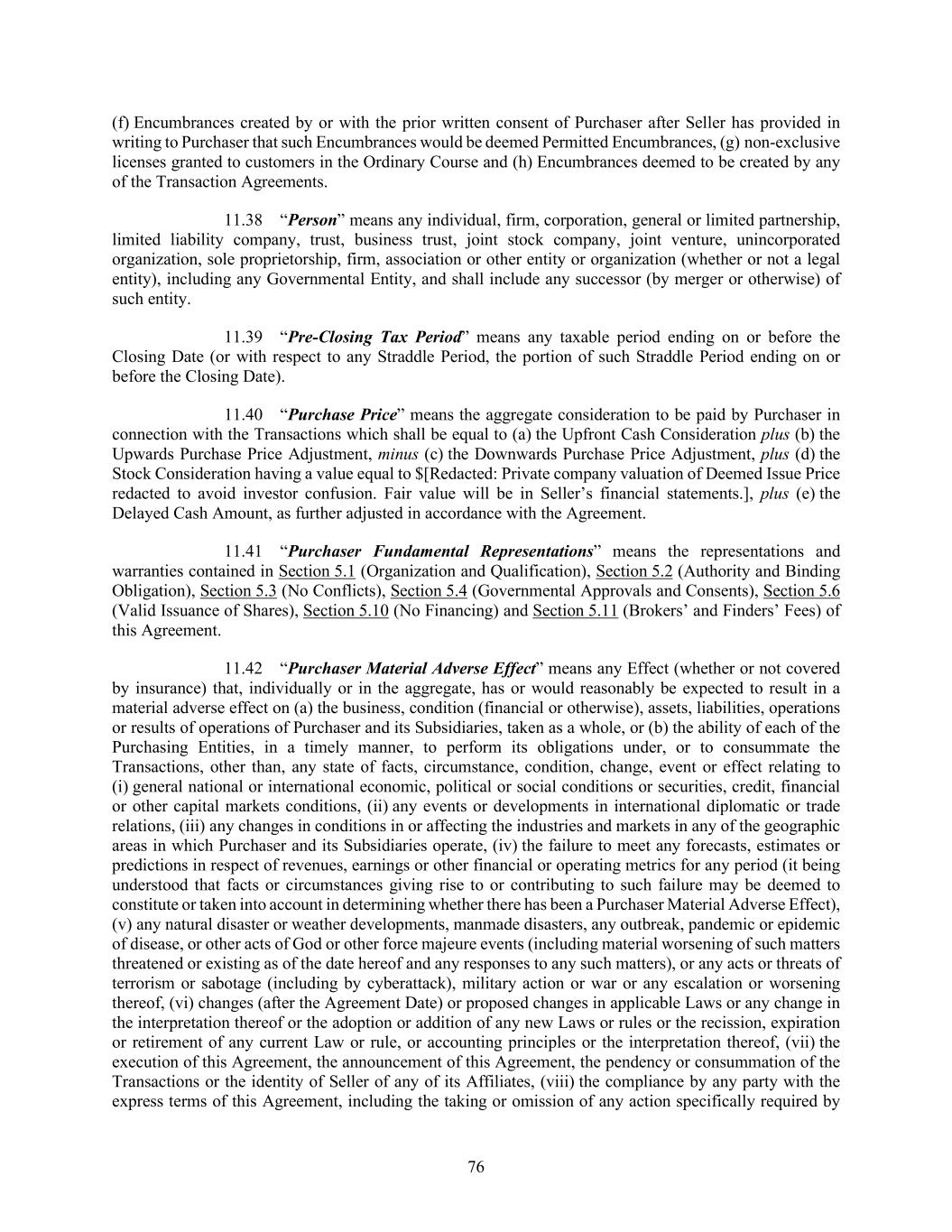 76 (f) Encumbrances created by or with the prior written consent of Purchaser after Seller has provided in writing to Purchaser that such Encumbrances would be deemed Permitted Encumbrances, (g) non-exclusive licenses granted to customers in the Ordinary Course and (h) Encumbrances deemed to be created by any of the Transaction Agreements. 11.38 “Person” means any individual, firm, corporation, general or limited partnership, limited liability company, trust, business trust, joint stock company, joint venture, unincorporated organization, sole proprietorship, firm, association or other entity or organization (whether or not a legal entity), including any Governmental Entity, and shall include any successor (by merger or otherwise) of such entity. 11.39 “Pre-Closing Tax Period” means any taxable period ending on or before the Closing Date (or with respect to any Straddle Period, the portion of such Straddle Period ending on or before the Closing Date). 11.40 “Purchase Price” means the aggregate consideration to be paid by Purchaser in connection with the Transactions which shall be equal to (a) the Upfront Cash Consideration plus (b) the Upwards Purchase Price Adjustment, minus (c) the Downwards Purchase Price Adjustment, plus (d) the Stock Consideration having a value equal to $[Redacted: Private company valuation of Deemed Issue Price redacted to avoid investor confusion. Fair value will be in Seller’s financial statements.], plus (e) the Delayed Cash Amount, as further adjusted in accordance with the Agreement. 11.41 “Purchaser Fundamental Representations” means the representations and warranties contained in Section 5.1 (Organization and Qualification), Section 5.2 (Authority and Binding Obligation), Section 5.3 (No Conflicts), Section 5.4 (Governmental Approvals and Consents), Section 5.6 (Valid Issuance of Shares), Section 5.10 (No Financing) and Section 5.11 (Brokers’ and Finders’ Fees) of this Agreement. 11.42 “Purchaser Material Adverse Effect” means any Effect (whether or not covered by insurance) that, individually or in the aggregate, has or would reasonably be expected to result in a material adverse effect on (a) the business, condition (financial or otherwise), assets, liabilities, operations or results of operations of Purchaser and its Subsidiaries, taken as a whole, or (b) the ability of each of the Purchasing Entities, in a timely manner, to perform its obligations under, or to consummate the Transactions, other than, any state of facts, circumstance, condition, change, event or effect relating to (i) general national or international economic, political or social conditions or securities, credit, financial or other capital markets conditions, (ii) any events or developments in international diplomatic or trade relations, (iii) any changes in conditions in or affecting the industries and markets in any of the geographic areas in which Purchaser and its Subsidiaries operate, (iv) the failure to meet any forecasts, estimates or predictions in respect of revenues, earnings or other financial or operating metrics for any period (it being understood that facts or circumstances giving rise to or contributing to such failure may be deemed to constitute or taken into account in determining whether there has been a Purchaser Material Adverse Effect), (v) any natural disaster or weather developments, manmade disasters, any outbreak, pandemic or epidemic of disease, or other acts of God or other force majeure events (including material worsening of such matters threatened or existing as of the date hereof and any responses to any such matters), or any acts or threats of terrorism or sabotage (including by cyberattack), military action or war or any escalation or worsening thereof, (vi) changes (after the Agreement Date) or proposed changes in applicable Laws or any change in the interpretation thereof or the adoption or addition of any new Laws or rules or the recission, expiration or retirement of any current Law or rule, or accounting principles or the interpretation thereof, (vii) the execution of this Agreement, the announcement of this Agreement, the pendency or consummation of the Transactions or the identity of Seller of any of its Affiliates, (viii) the compliance by any party with the express terms of this Agreement, including the taking or omission of any action specifically required by