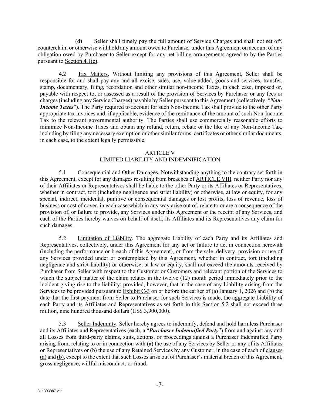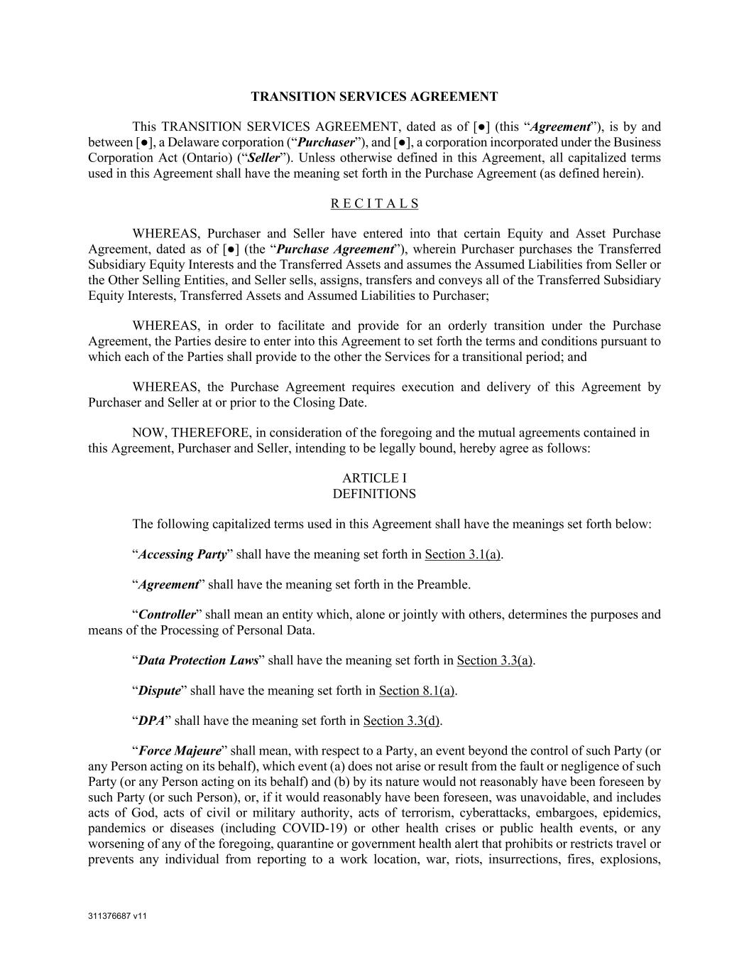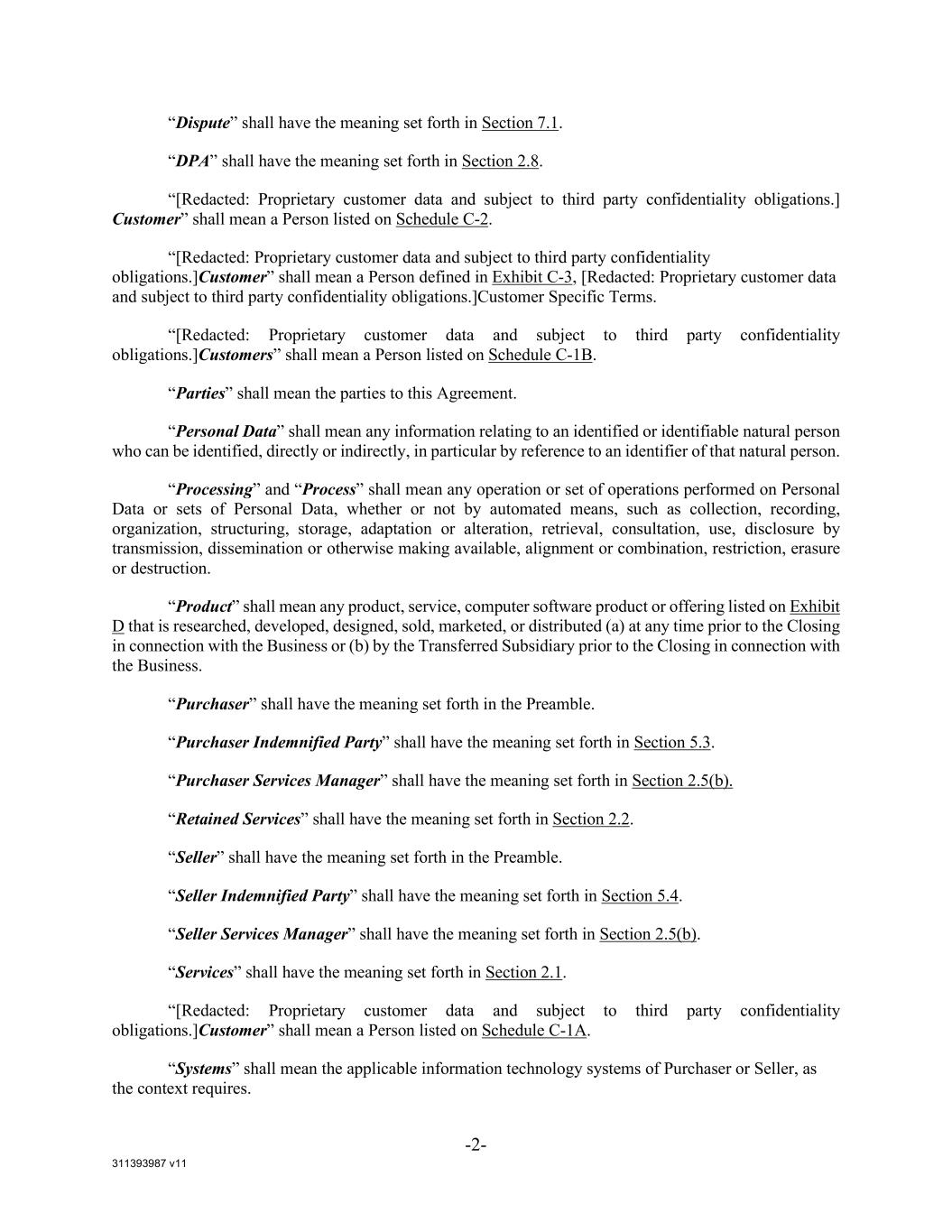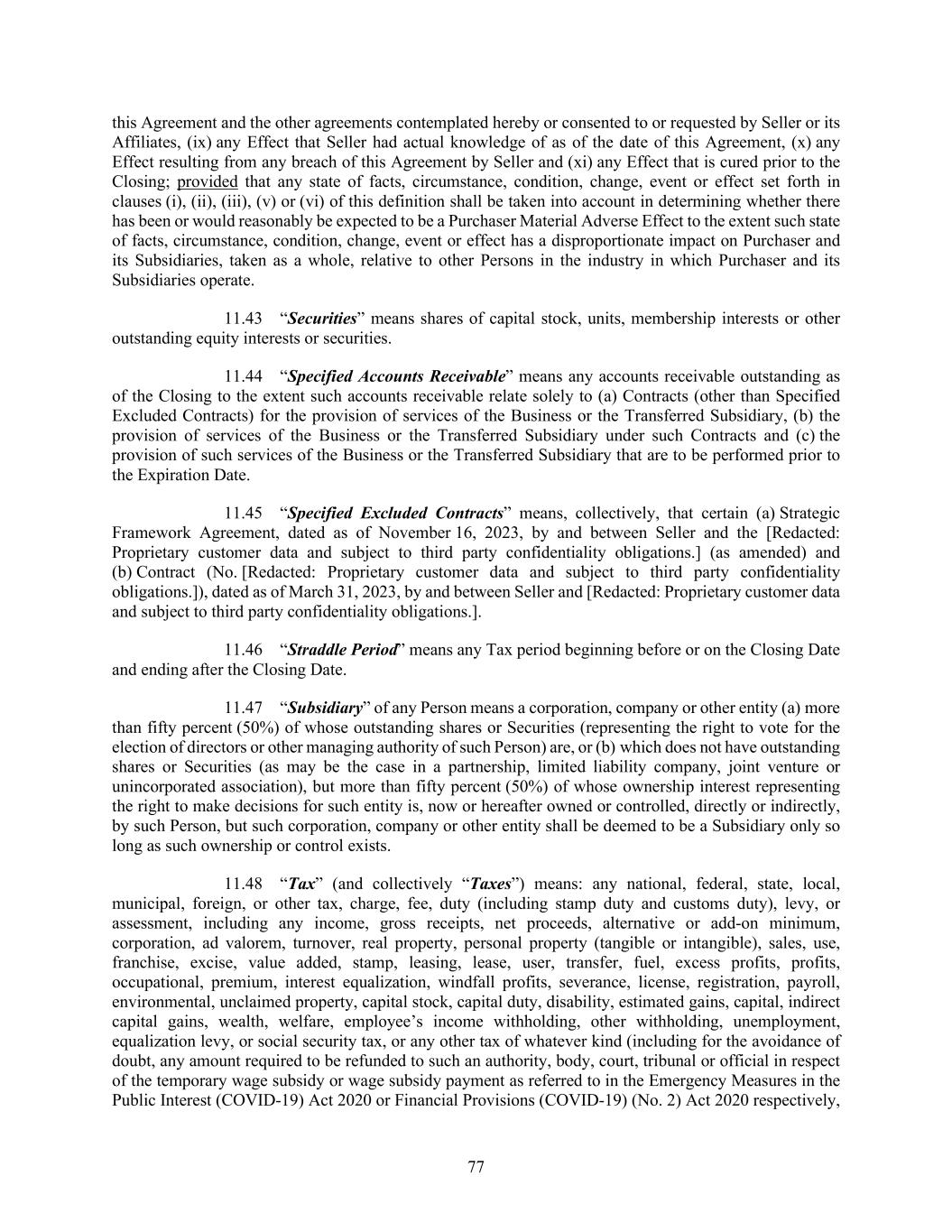 77 this Agreement and the other agreements contemplated hereby or consented to or requested by Seller or its Affiliates, (ix) any Effect that Seller had actual knowledge of as of the date of this Agreement, (x) any Effect resulting from any breach of this Agreement by Seller and (xi) any Effect that is cured prior to the Closing; provided that any state of facts, circumstance, condition, change, event or effect set forth in clauses (i), (ii), (iii), (v) or (vi) of this definition shall be taken into account in determining whether there has been or would reasonably be expected to be a Purchaser Material Adverse Effect to the extent such state of facts, circumstance, condition, change, event or effect has a disproportionate impact on Purchaser and its Subsidiaries, taken as a whole, relative to other Persons in the industry in which Purchaser and its Subsidiaries operate. 11.43 “Securities” means shares of capital stock, units, membership interests or other outstanding equity interests or securities. 11.44 “Specified Accounts Receivable” means any accounts receivable outstanding as of the Closing to the extent such accounts receivable relate solely to (a) Contracts (other than Specified Excluded Contracts) for the provision of services of the Business or the Transferred Subsidiary, (b) the provision of services of the Business or the Transferred Subsidiary under such Contracts and (c) the provision of such services of the Business or the Transferred Subsidiary that are to be performed prior to the Expiration Date. 11.45 “Specified Excluded Contracts” means, collectively, that certain (a) Strategic Framework Agreement, dated as of November 16, 2023, by and between Seller and the [Redacted: Proprietary customer data and subject to third party confidentiality obligations.] (as amended) and (b) Contract (No. [Redacted: Proprietary customer data and subject to third party confidentiality obligations.]), dated as of March 31, 2023, by and between Seller and [Redacted: Proprietary customer data and subject to third party confidentiality obligations.]. 11.46 “Straddle Period” means any Tax period beginning before or on the Closing Date and ending after the Closing Date. 11.47 “Subsidiary” of any Person means a corporation, company or other entity (a) more than fifty percent (50%) of whose outstanding shares or Securities (representing the right to vote for the election of directors or other managing authority of such Person) are, or (b) which does not have outstanding shares or Securities (as may be the case in a partnership, limited liability company, joint venture or unincorporated association), but more than fifty percent (50%) of whose ownership interest representing the right to make decisions for such entity is, now or hereafter owned or controlled, directly or indirectly, by such Person, but such corporation, company or other entity shall be deemed to be a Subsidiary only so long as such ownership or control exists. 11.48 “Tax” (and collectively “Taxes”) means: any national, federal, state, local, municipal, foreign, or other tax, charge, fee, duty (including stamp duty and customs duty), levy, or assessment, including any income, gross receipts, net proceeds, alternative or add-on minimum, corporation, ad valorem, turnover, real property, personal property (tangible or intangible), sales, use, franchise, excise, value added, stamp, leasing, lease, user, transfer, fuel, excess profits, profits, occupational, premium, interest equalization, windfall profits, severance, license, registration, payroll, environmental, unclaimed property, capital stock, capital duty, disability, estimated gains, capital, indirect capital gains, wealth, welfare, employee’s income withholding, other withholding, unemployment, equalization levy, or social security tax, or any other tax of whatever kind (including for the avoidance of doubt, any amount required to be refunded to such an authority, body, court, tribunal or official in respect of the temporary wage subsidy or wage subsidy payment as referred to in the Emergency Measures in the Public Interest (COVID-19) Act 2020 or Financial Provisions (COVID-19) (No. 2) Act 2020 respectively,