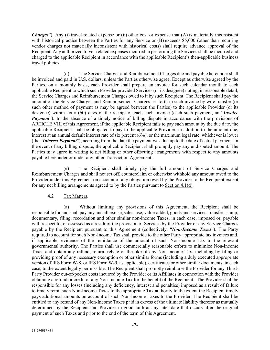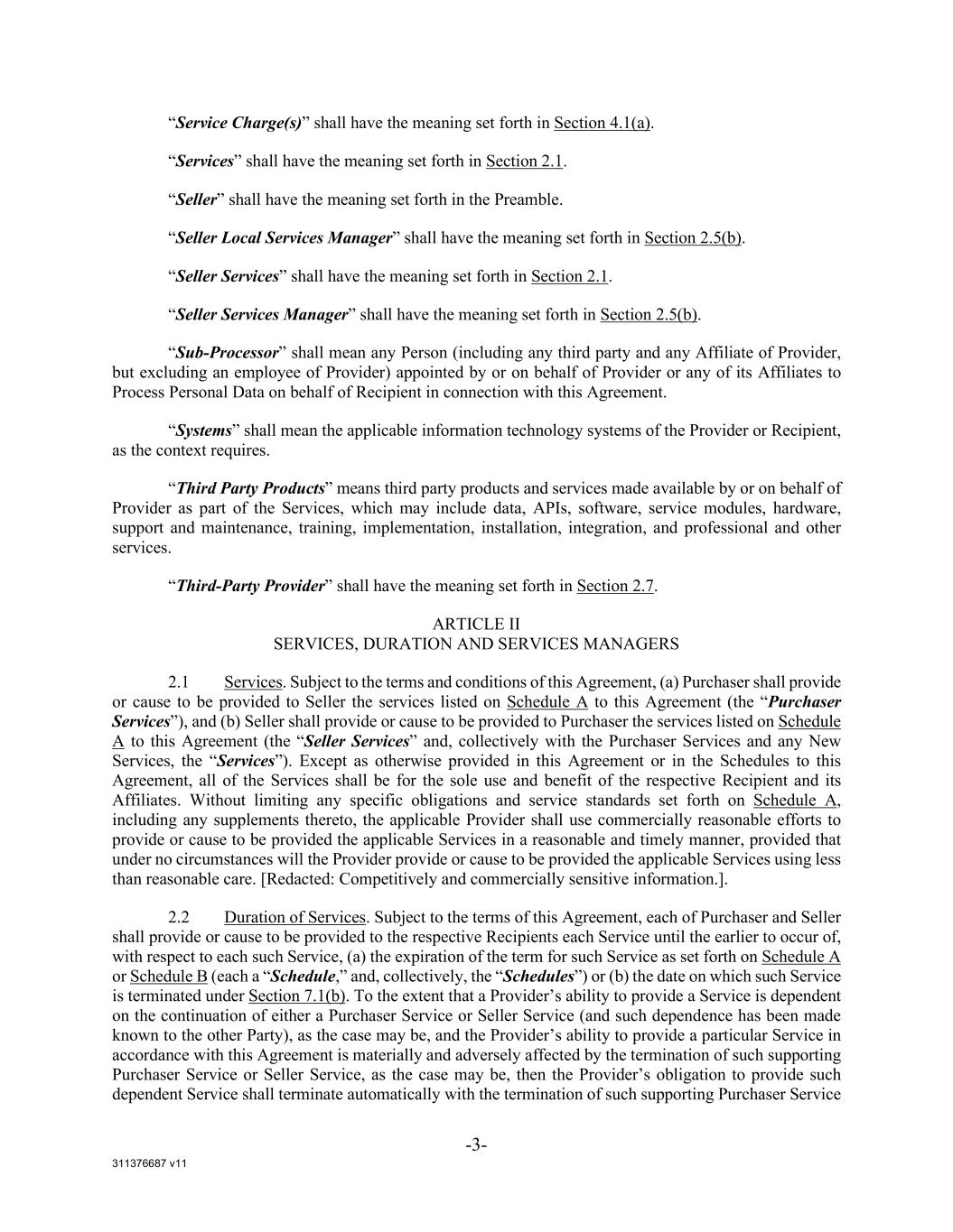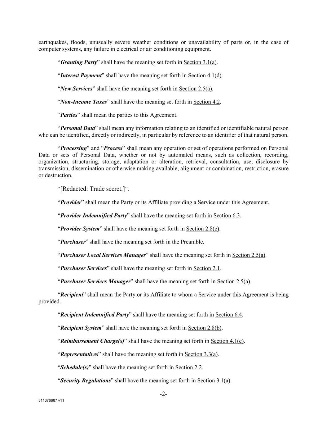 77 this Agreement and the other agreements contemplated hereby or consented to or requested by Seller or its Affiliates, (ix) any Effect that Seller had actual knowledge of as of the date of this Agreement, (x) any Effect resulting from any breach of this Agreement by Seller and (xi) any Effect that is cured prior to the Closing; provided that any state of facts, circumstance, condition, change, event or effect set forth in clauses (i), (ii), (iii), (v) or (vi) of this definition shall be taken into account in determining whether there has been or would reasonably be expected to be a Purchaser Material Adverse Effect to the extent such state of facts, circumstance, condition, change, event or effect has a disproportionate impact on Purchaser and its Subsidiaries, taken as a whole, relative to other Persons in the industry in which Purchaser and its Subsidiaries operate. 11.43 “Securities” means shares of capital stock, units, membership interests or other outstanding equity interests or securities. 11.44 “Specified Accounts Receivable” means any accounts receivable outstanding as of the Closing to the extent such accounts receivable relate solely to (a) Contracts (other than Specified Excluded Contracts) for the provision of services of the Business or the Transferred Subsidiary, (b) the provision of services of the Business or the Transferred Subsidiary under such Contracts and (c) the provision of such services of the Business or the Transferred Subsidiary that are to be performed prior to the Expiration Date. 11.45 “Specified Excluded Contracts” means, collectively, that certain (a) Strategic Framework Agreement, dated as of November 16, 2023, by and between Seller and the [Redacted: Proprietary customer data and subject to third party confidentiality obligations.] (as amended) and (b) Contract (No. [Redacted: Proprietary customer data and subject to third party confidentiality obligations.]), dated as of March 31, 2023, by and between Seller and [Redacted: Proprietary customer data and subject to third party confidentiality obligations.]. 11.46 “Straddle Period” means any Tax period beginning before or on the Closing Date and ending after the Closing Date. 11.47 “Subsidiary” of any Person means a corporation, company or other entity (a) more than fifty percent (50%) of whose outstanding shares or Securities (representing the right to vote for the election of directors or other managing authority of such Person) are, or (b) which does not have outstanding shares or Securities (as may be the case in a partnership, limited liability company, joint venture or unincorporated association), but more than fifty percent (50%) of whose ownership interest representing the right to make decisions for such entity is, now or hereafter owned or controlled, directly or indirectly, by such Person, but such corporation, company or other entity shall be deemed to be a Subsidiary only so long as such ownership or control exists. 11.48 “Tax” (and collectively “Taxes”) means: any national, federal, state, local, municipal, foreign, or other tax, charge, fee, duty (including stamp duty and customs duty), levy, or assessment, including any income, gross receipts, net proceeds, alternative or add-on minimum, corporation, ad valorem, turnover, real property, personal property (tangible or intangible), sales, use, franchise, excise, value added, stamp, leasing, lease, user, transfer, fuel, excess profits, profits, occupational, premium, interest equalization, windfall profits, severance, license, registration, payroll, environmental, unclaimed property, capital stock, capital duty, disability, estimated gains, capital, indirect capital gains, wealth, welfare, employee’s income withholding, other withholding, unemployment, equalization levy, or social security tax, or any other tax of whatever kind (including for the avoidance of doubt, any amount required to be refunded to such an authority, body, court, tribunal or official in respect of the temporary wage subsidy or wage subsidy payment as referred to in the Emergency Measures in the Public Interest (COVID-19) Act 2020 or Financial Provisions (COVID-19) (No. 2) Act 2020 respectively,